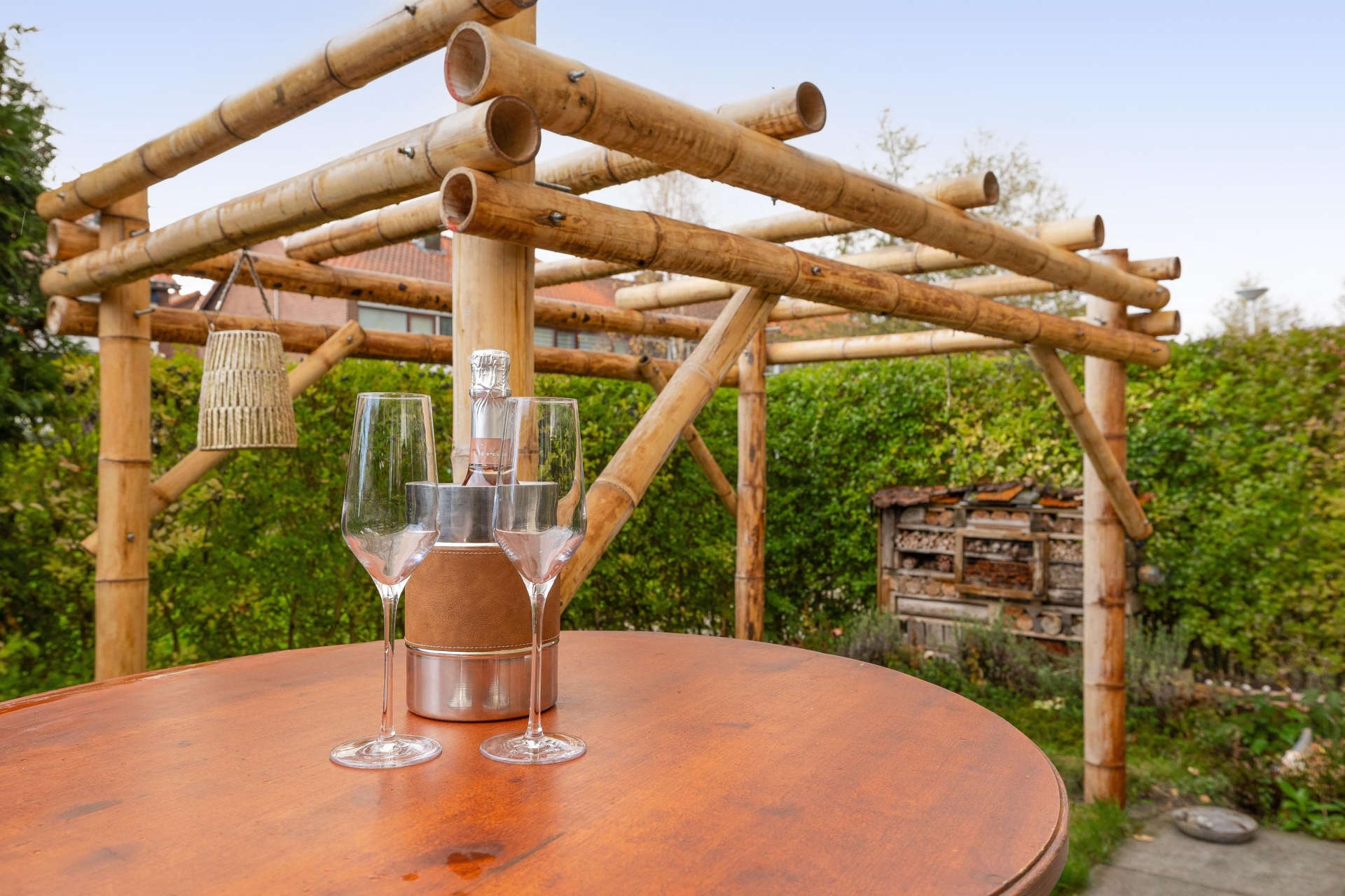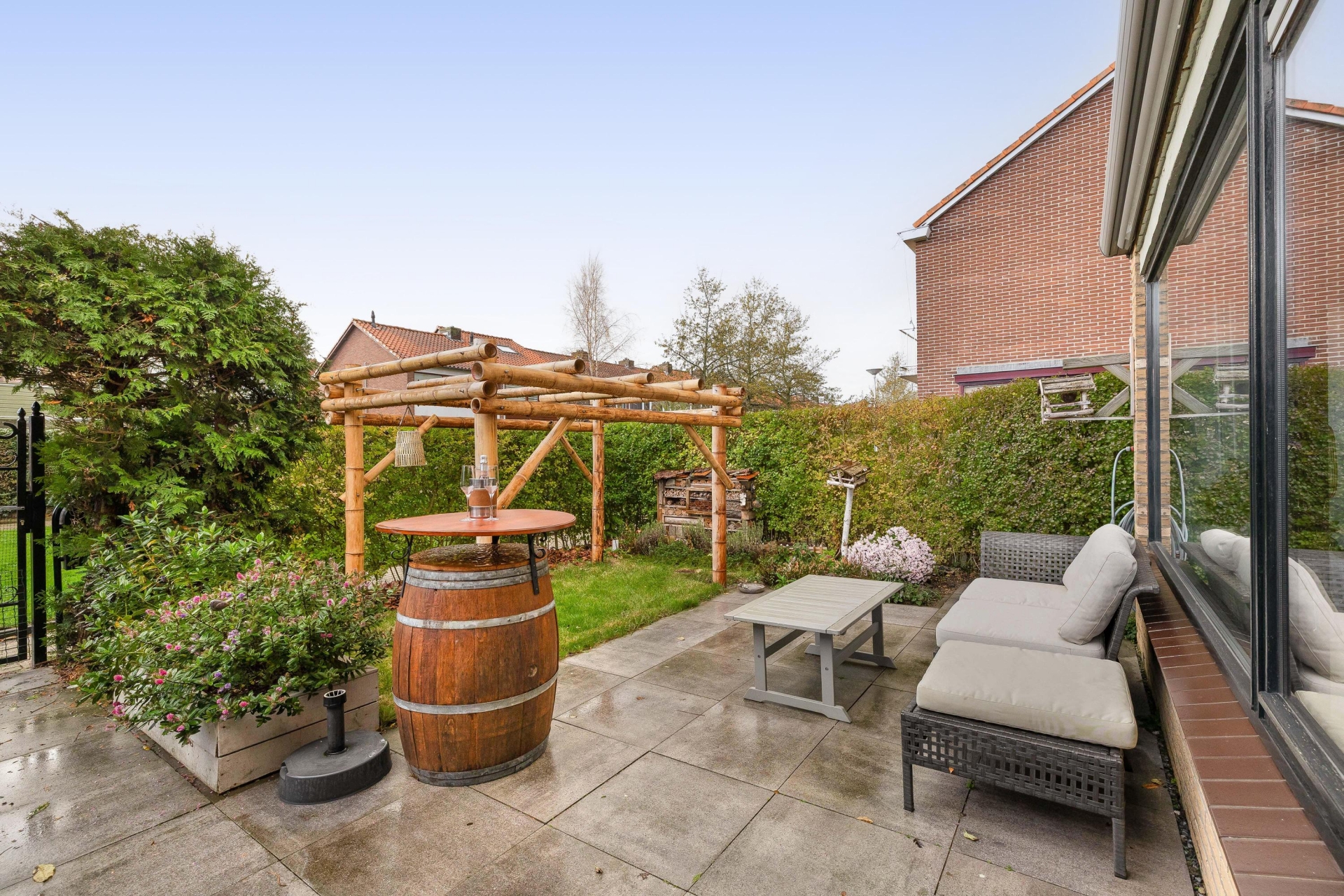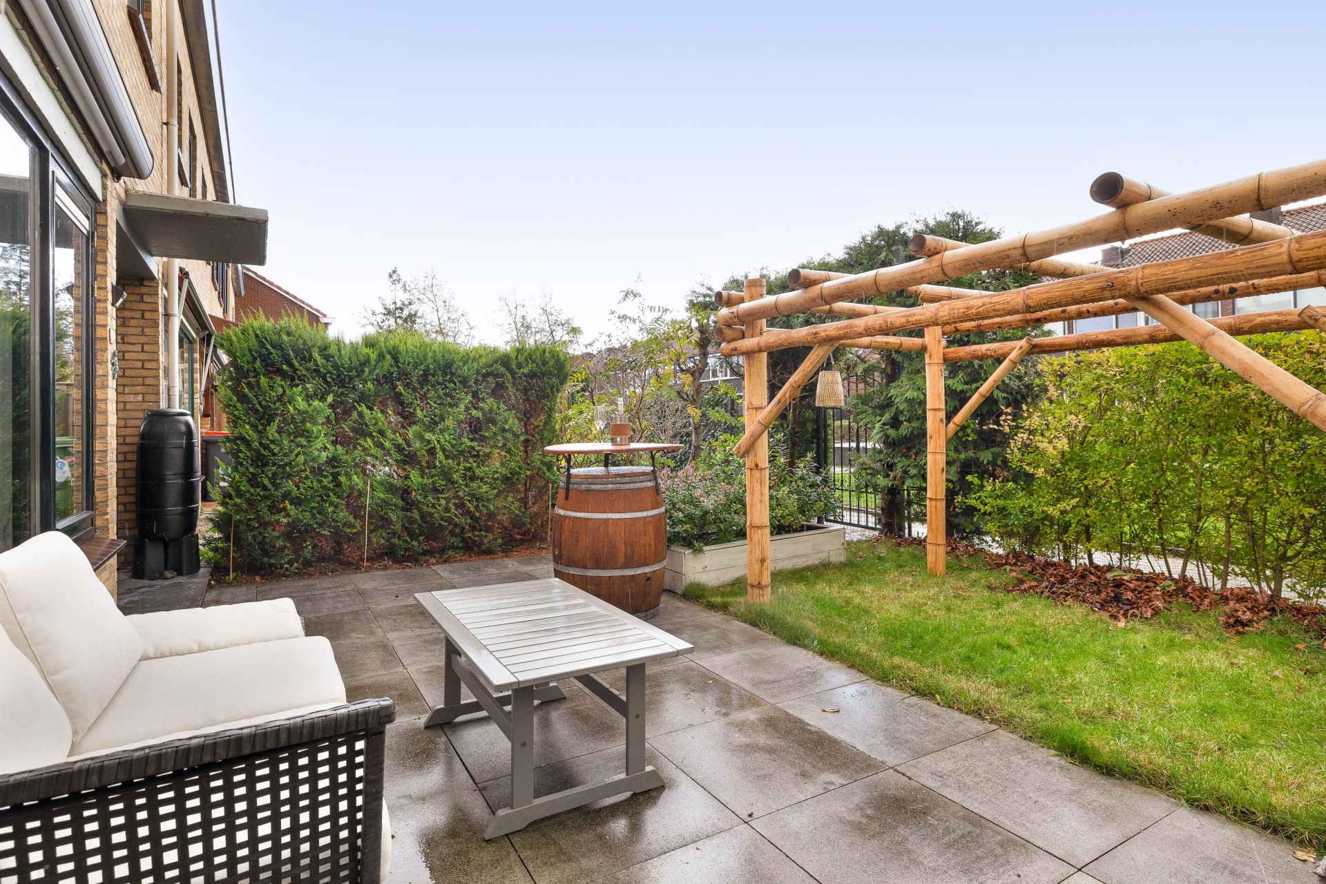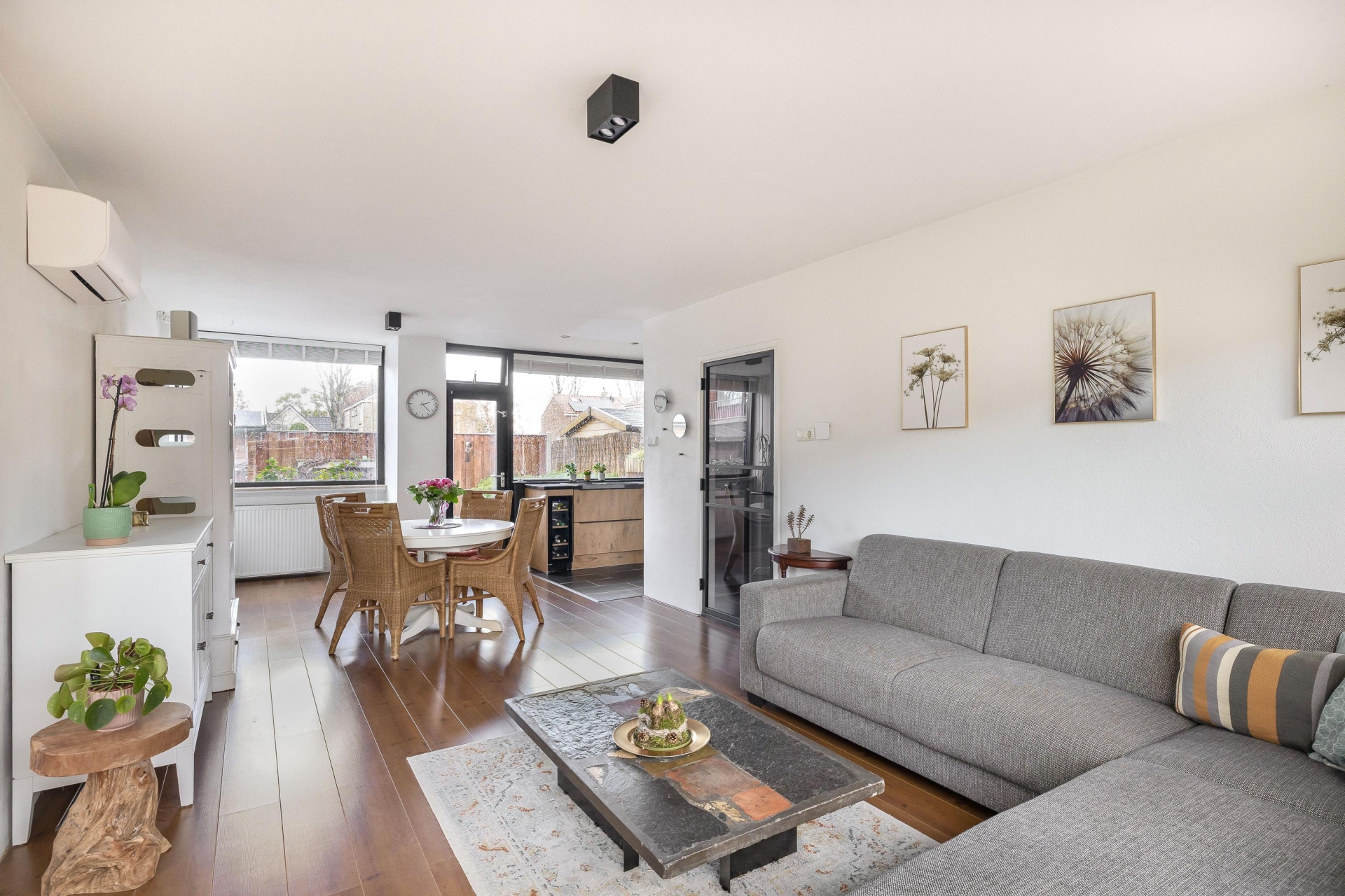 De woonkamer is ruim opgezet en heerlijk licht door de ramen, de erker en de glazen binnendeuren. Doordat het een hoekwoning betreft heb je net wat meer privacy en lichtinval dan gemiddeld. De open keuken aan de tuinzijde maakt de begane grond tot een fijne, open leefruimte. Vanuit de keuken heb je toegang tot de achtertuin op het noordoosten, waar je 's ochtends heerlijk in de zon kunt ontbijten. Aan de voorzijde ligt een goed onderhouden voortuin op het zuidwesten, perfect voor een borrel in de avondzon. Het terras heeft een automatisch bedienbaar zonnescherm met ingebouwde verlichting. Achterin de tuin staat een vrijstaande berging (voorzien van electra) voor je fietsen en gereedschap.