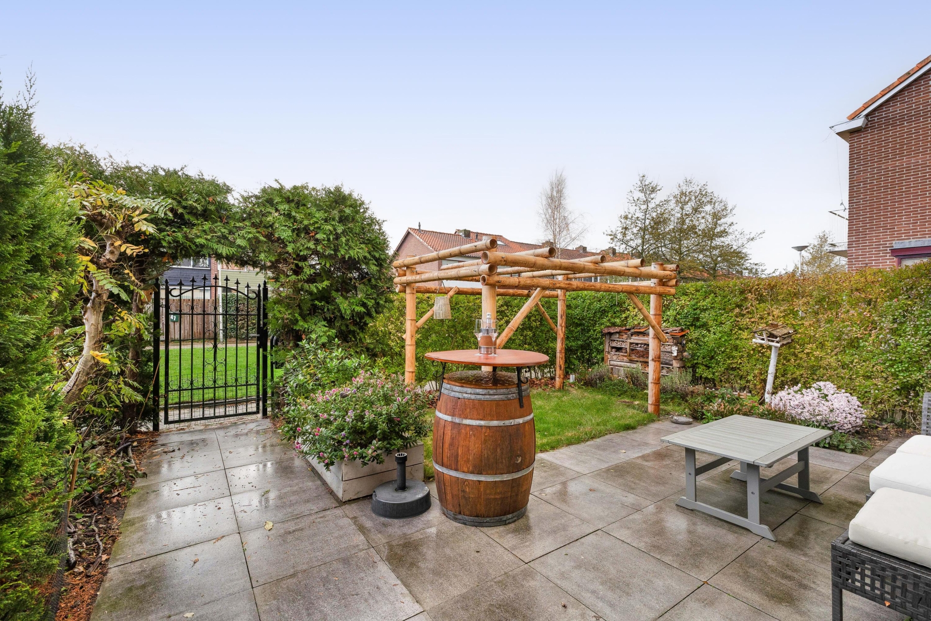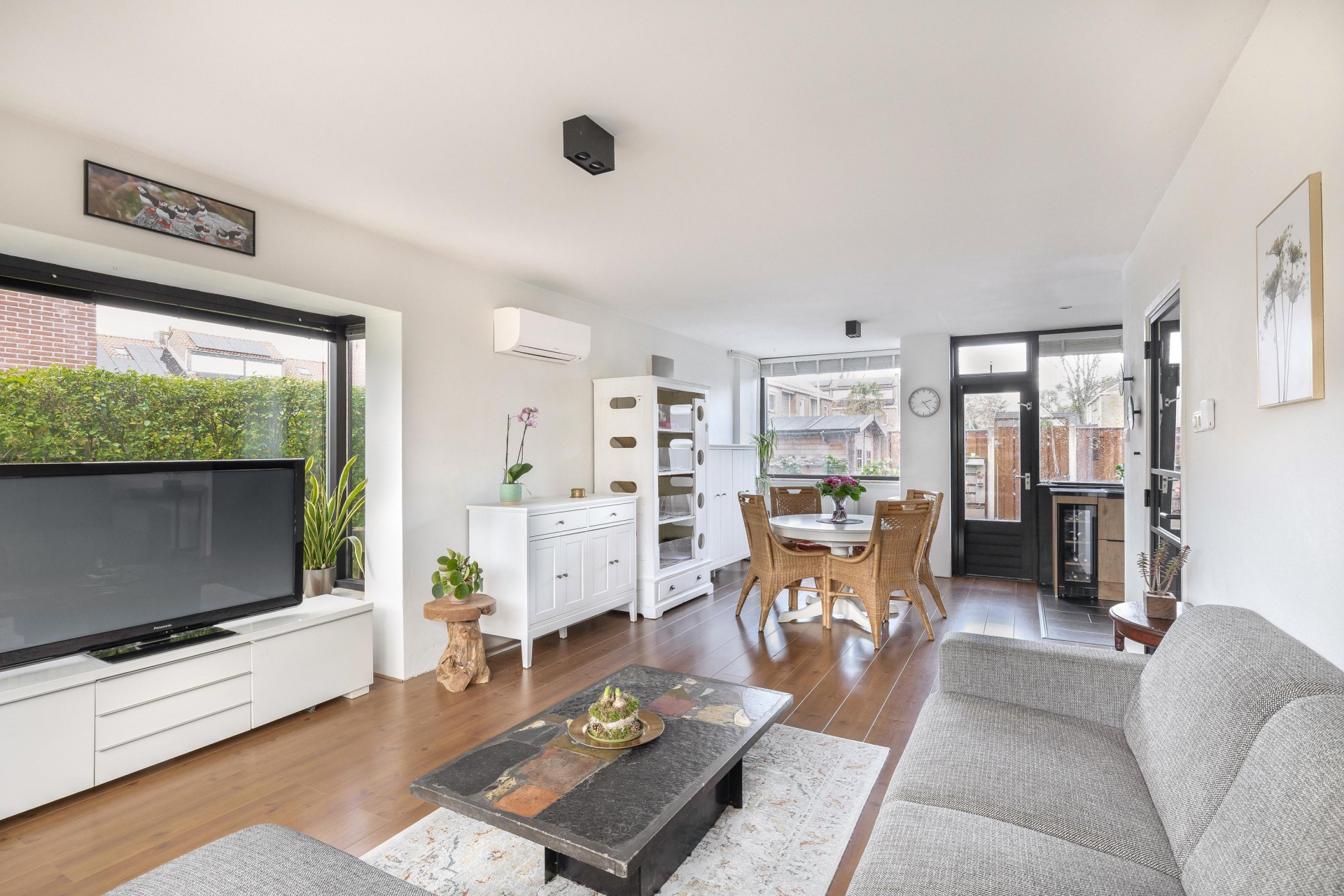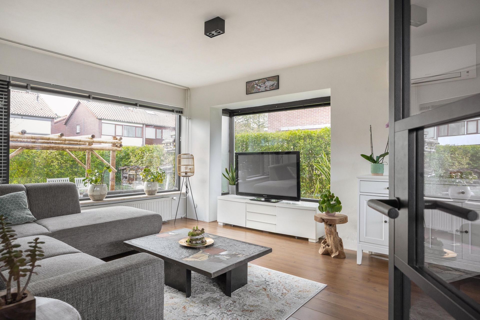 De woonkamer is ruim opgezet en heerlijk licht door de ramen, de erker en de glazen binnendeuren. Doordat het een hoekwoning betreft heb je net wat meer privacy en lichtinval dan gemiddeld. De open keuken aan de tuinzijde maakt de begane grond tot een fijne, open leefruimte. Vanuit de keuken heb je toegang tot de achtertuin op het noordoosten, waar je 's ochtends heerlijk in de zon kunt ontbijten. Aan de voorzijde ligt een goed onderhouden voortuin op het zuidwesten, perfect voor een borrel in de avondzon. Het terras heeft een automatisch bedienbaar zonnescherm met ingebouwde verlichting. Achterin de tuin staat een vrijstaande berging (voorzien van electra) voor je fietsen en gereedschap.