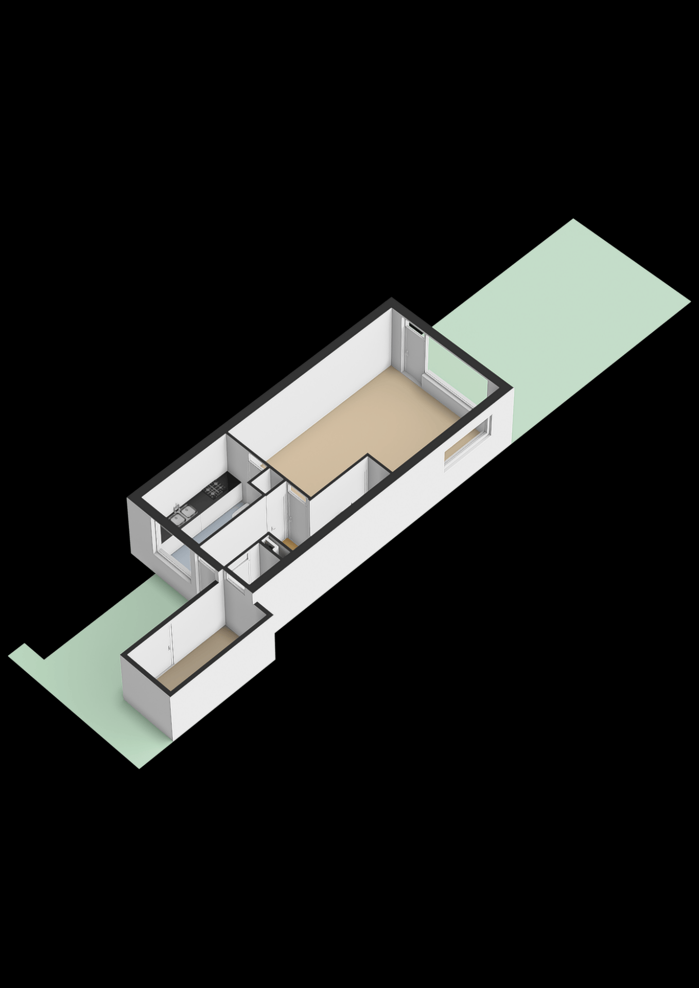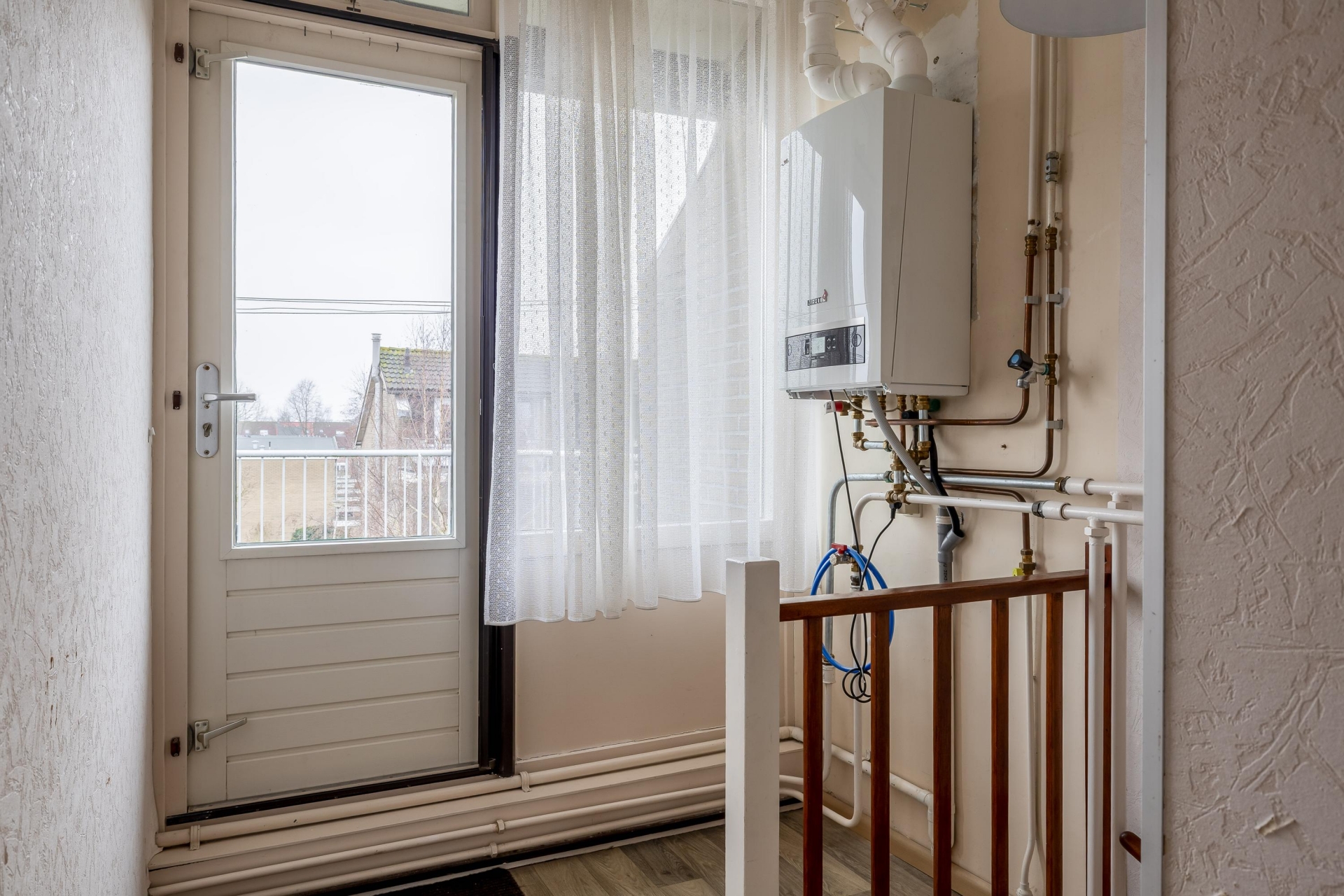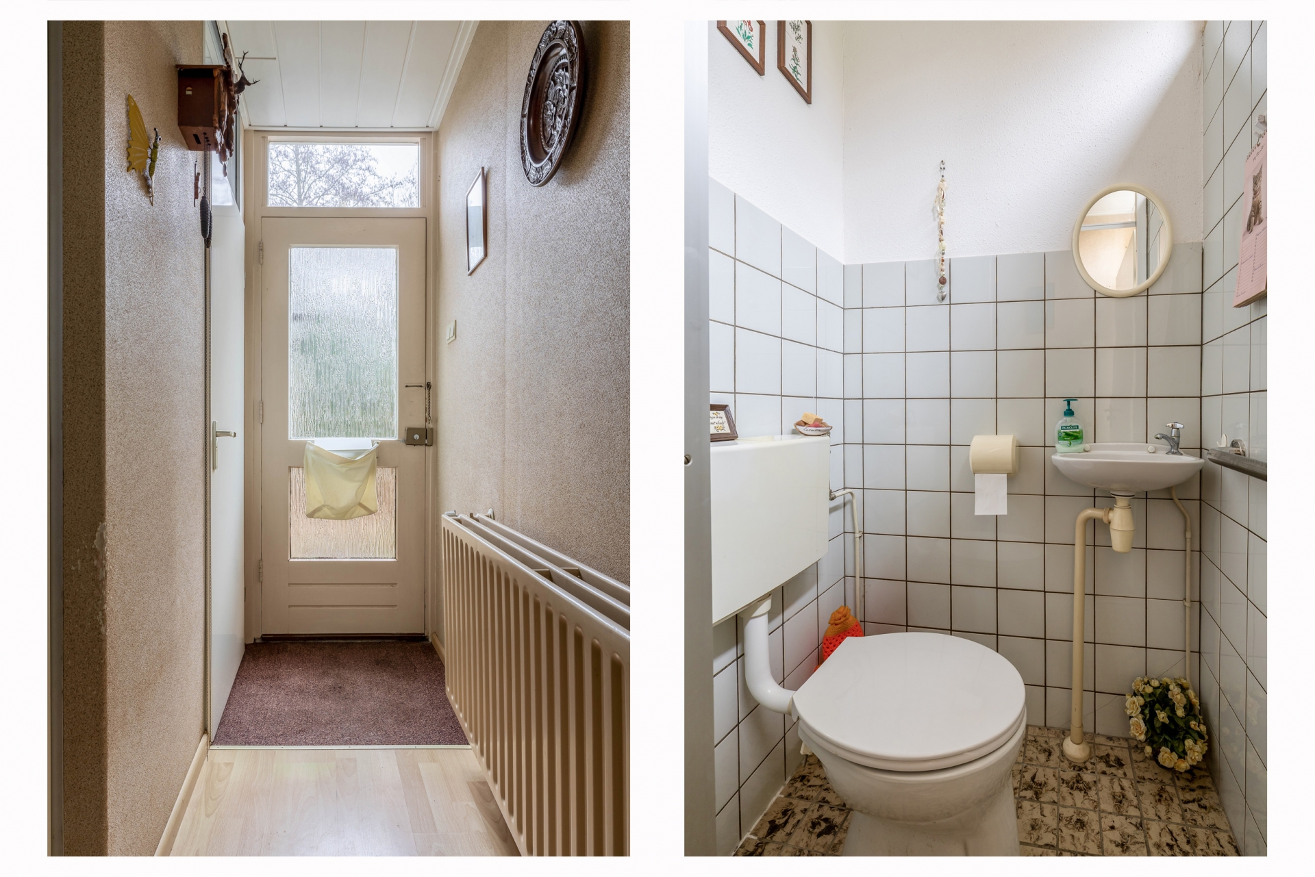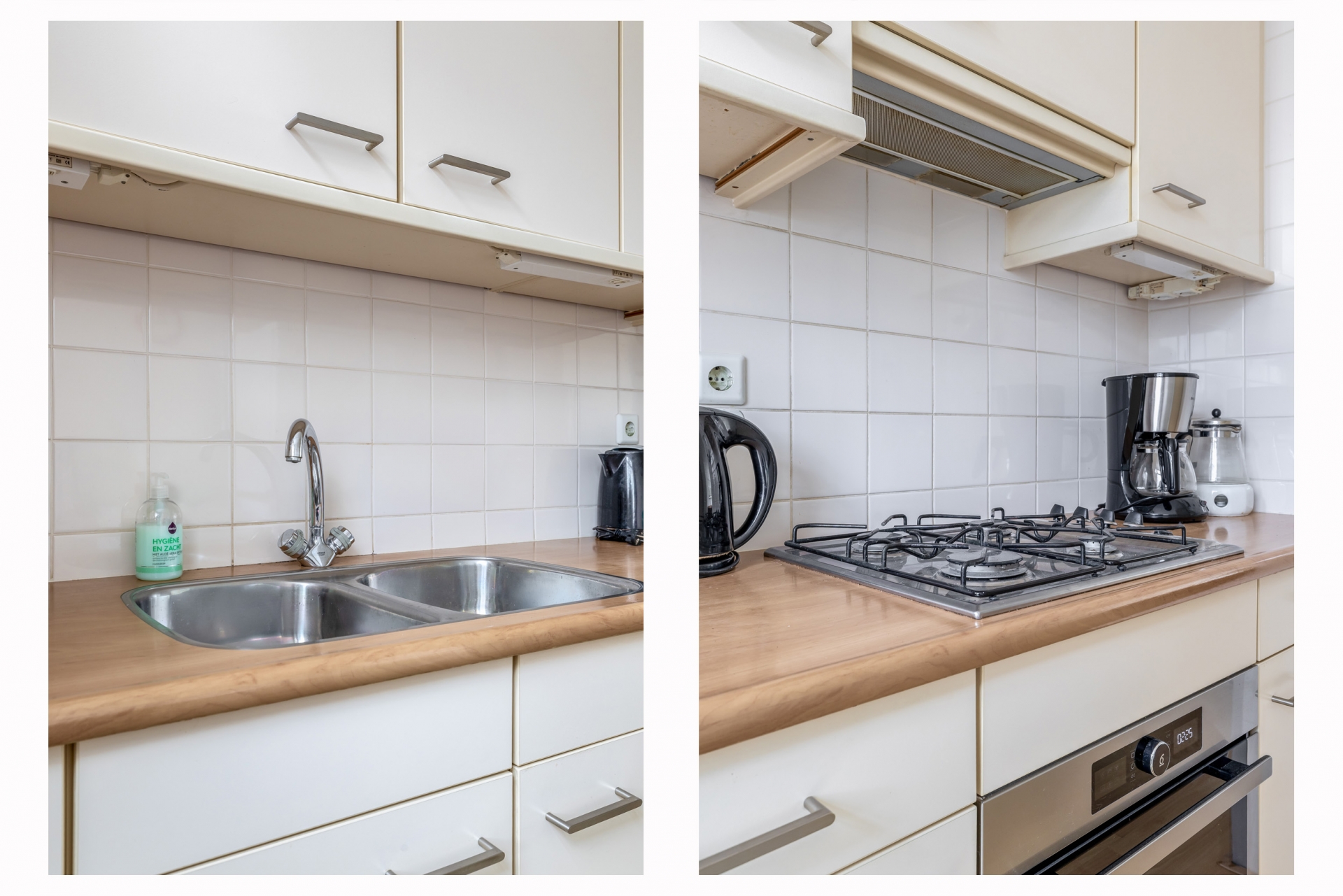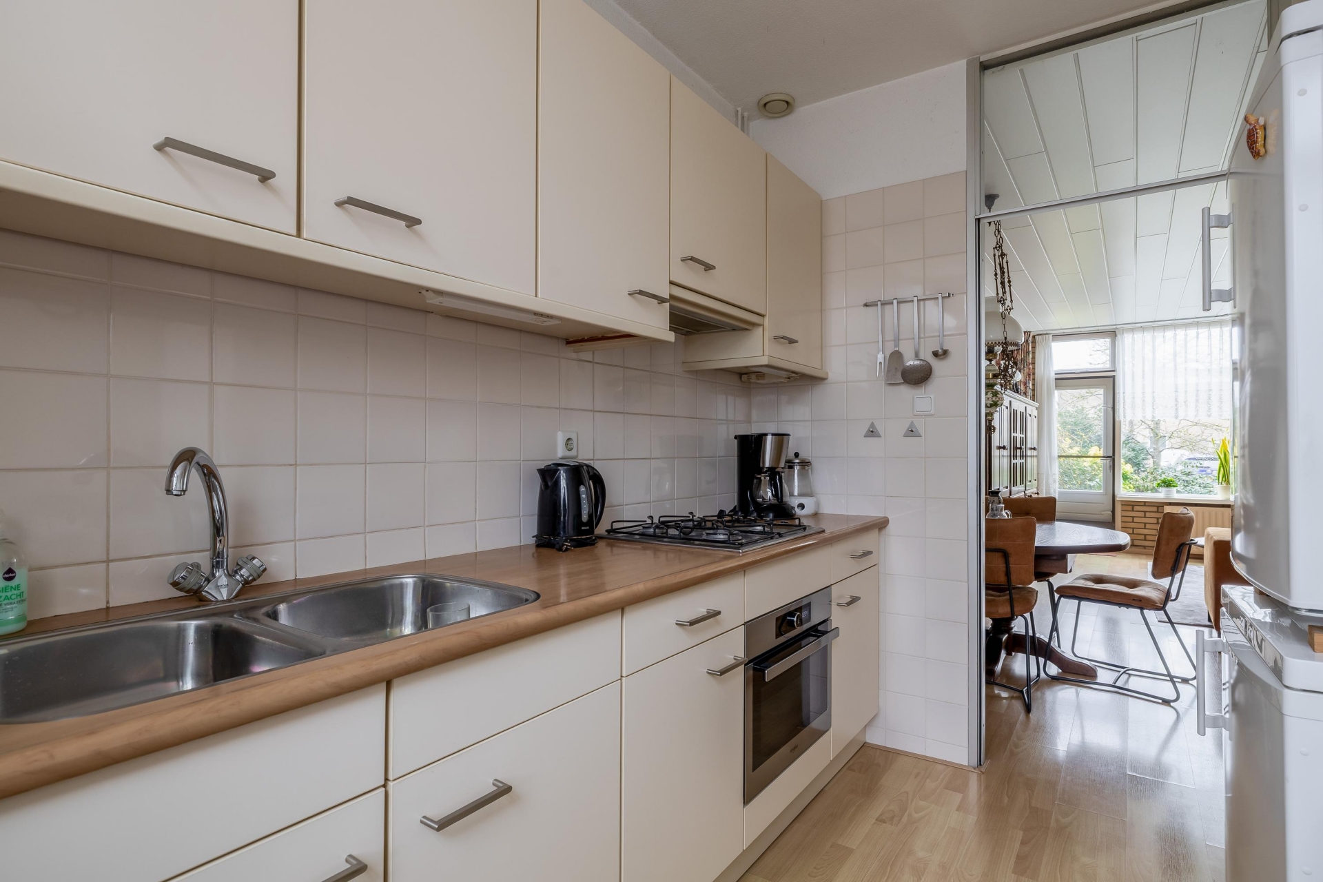 Aansluitend bevindt zich de keuken, die prettig is gepositioneerd aan de voorzijde. Dankzij het raam is ook hier sprake van natuurlijk licht. De keuken biedt voldoende werk- en kastruimte voor dagelijks gebruik. Aan de voorzijde van het huis is bovendien een aangebouwde berging aanwezig. Deze is direct van buitenaf bereikbaar en ideaal voor fietsen en extra opslag. Praktisch in het dagelijks gebruik en fijn om het huis netjes en overzichtelijk te houden.