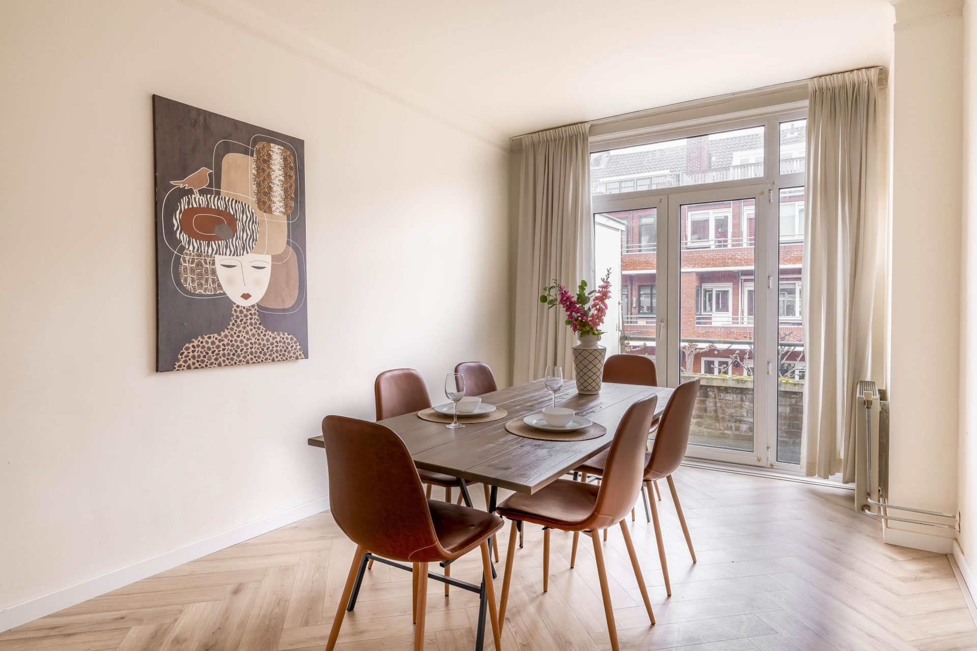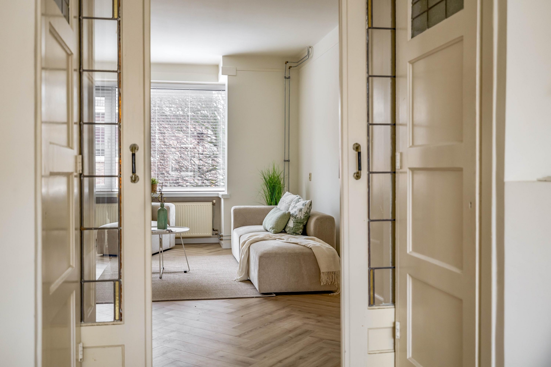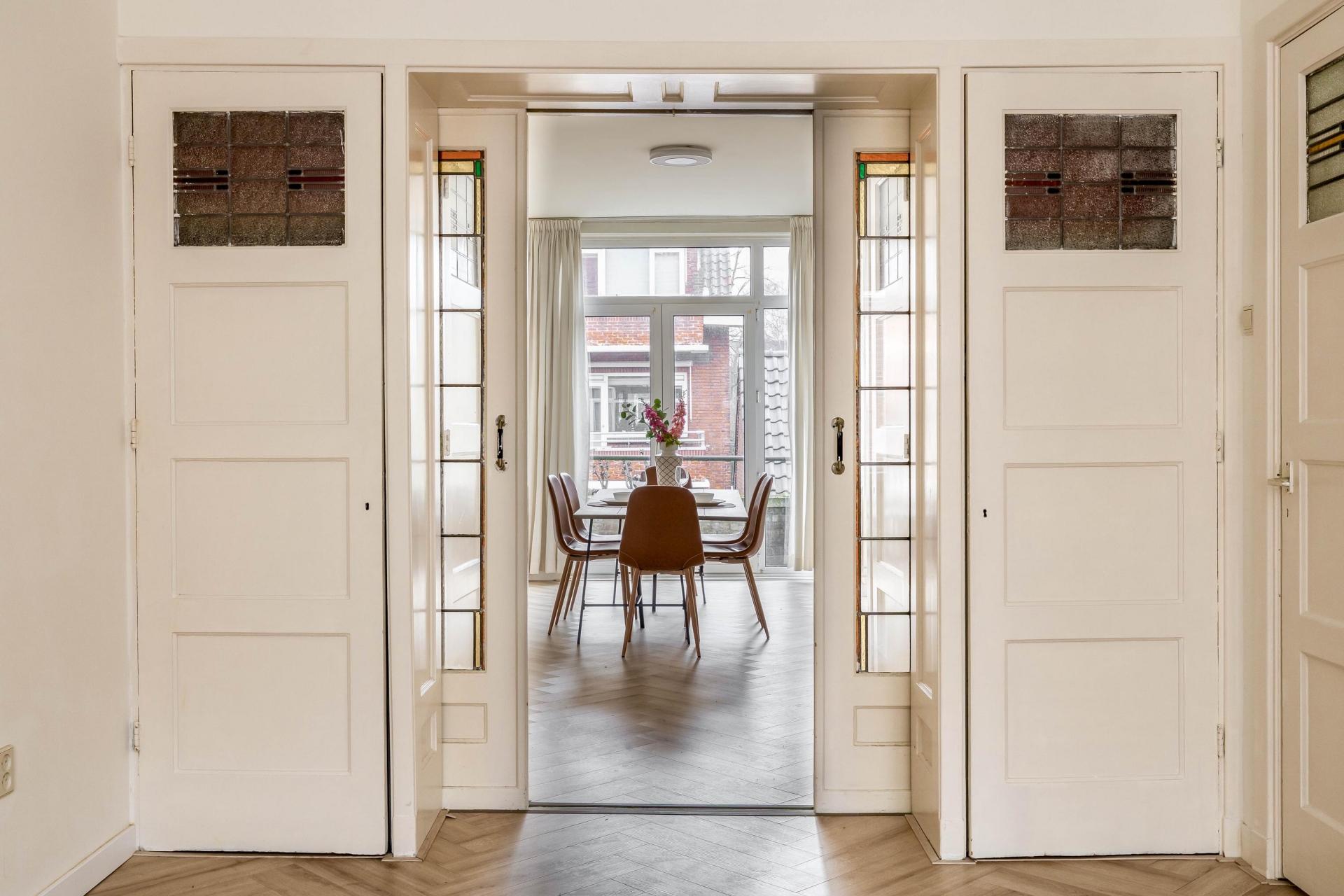 Op de eerste woonlaag vindt u een lichte woonkamer met grote raampartijen, gescheiden van de eetkamer door prachtige houten schuifdeuren met glas-in-lood. De halfopen keuken is voorzien van diverse inbouwapparatuur en biedt directe toegang tot het eerste balkon aan de achterzijde. Deze gehele verdieping is afgewerkt met een stijlvolle visgraat laminaatvloer.