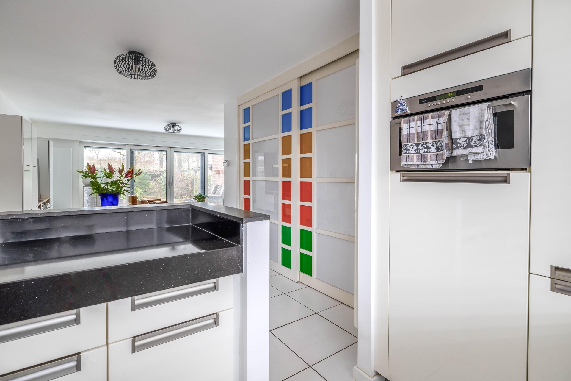 De zithoek is royaal en biedt voldoende ruimte voor een grote bankopstelling. De keuken ligt aan de voorzijde van het huis en is uitgevoerd in een moderne hoekopstelling met lichte fronten en een donker werkblad. Er is volop kastruimte en werkruimte, wat het een prettige plek maakt om te koken.