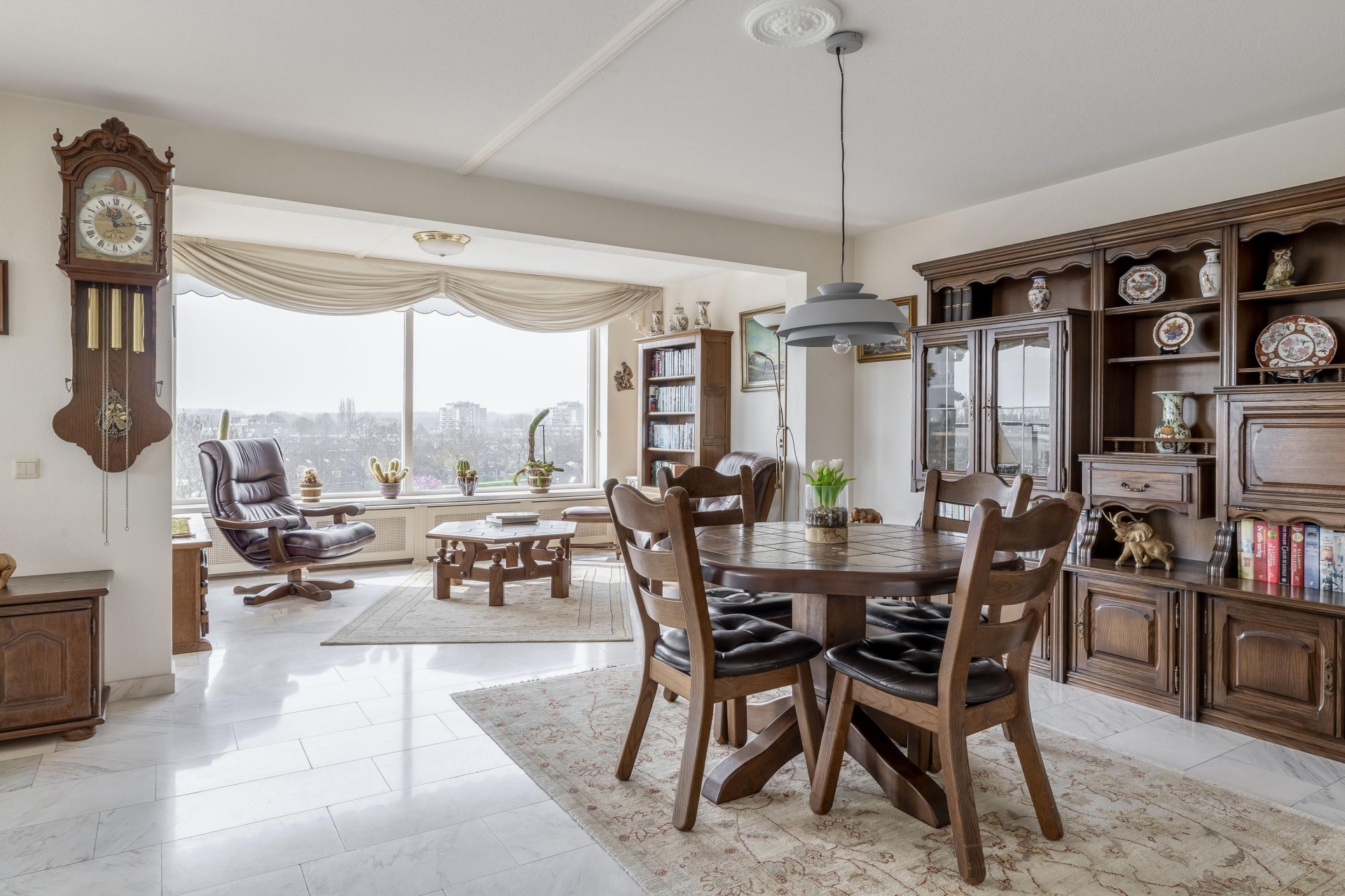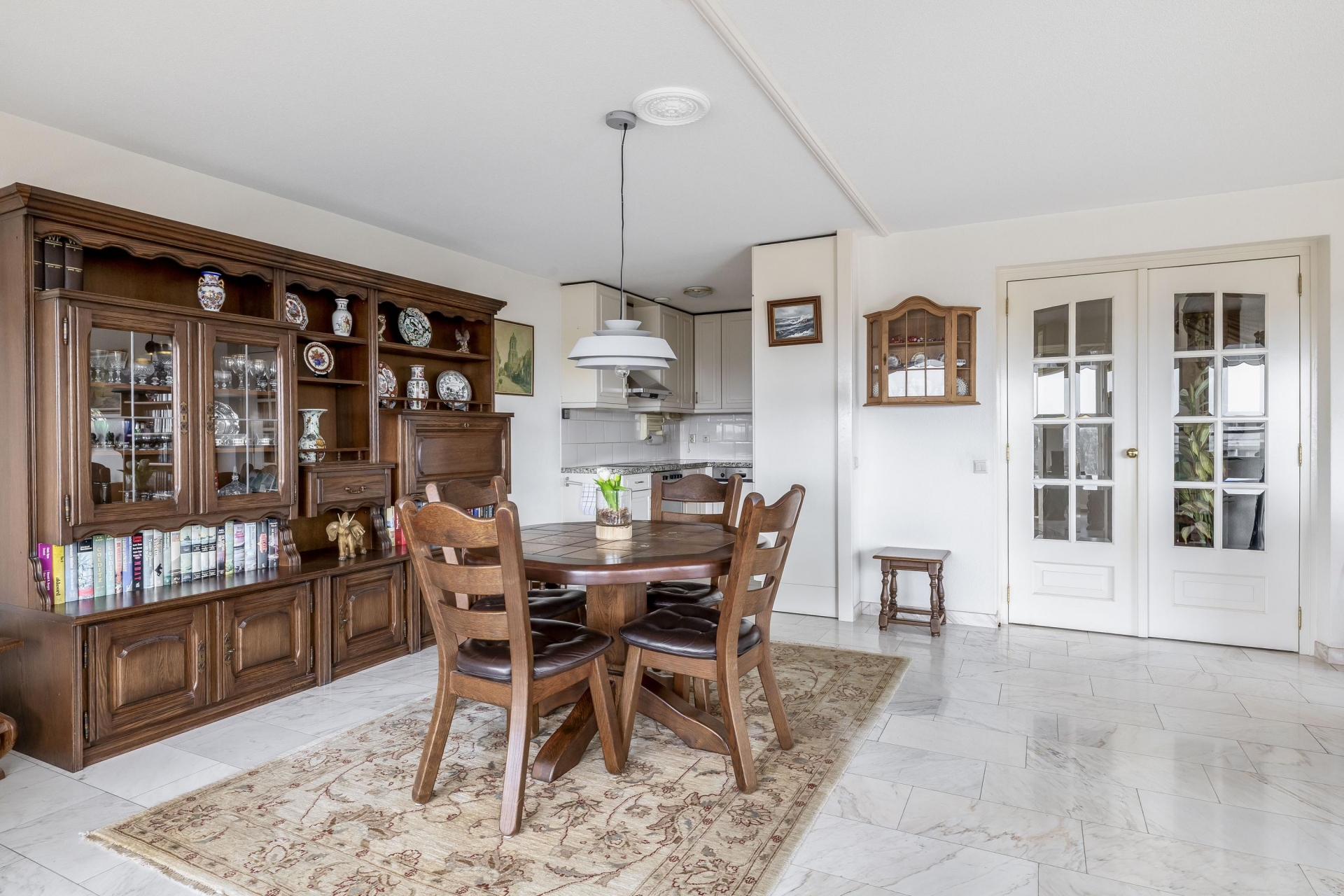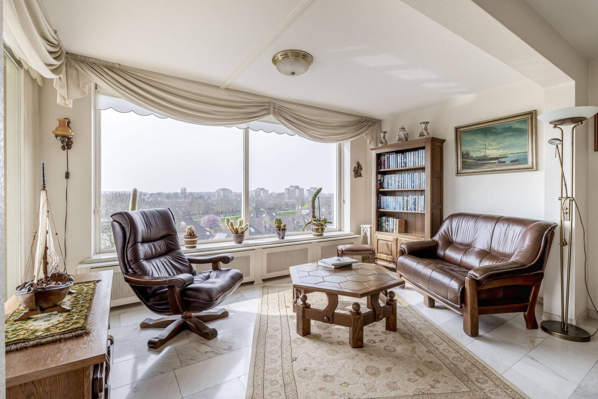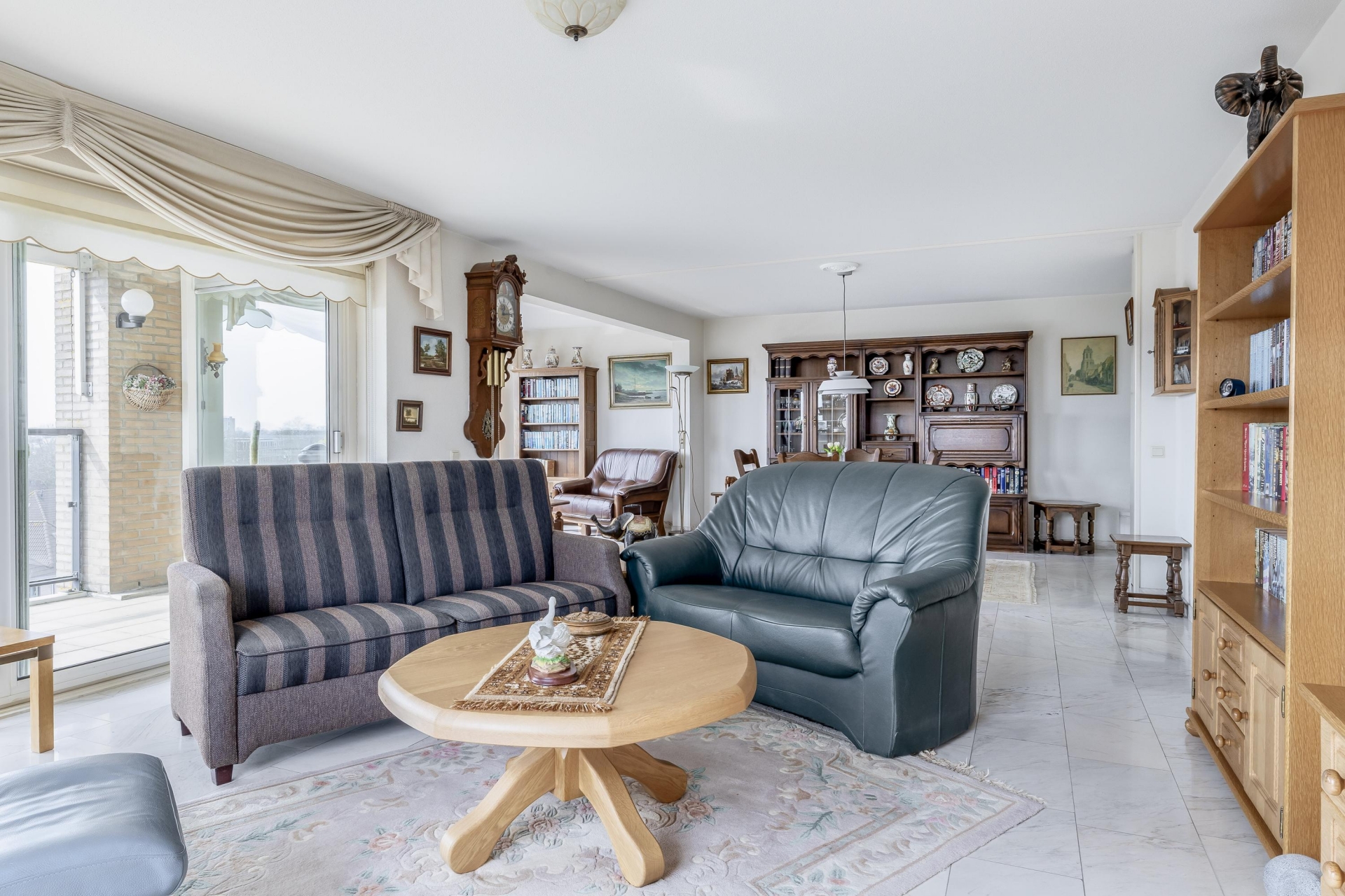 De woonkamer is ruim opgezet en vormt het hart van het appartement. Dankzij de grote raampartijen en de schuifpui is er veel lichtinval en een vrij uitzicht over Ridderkerk.