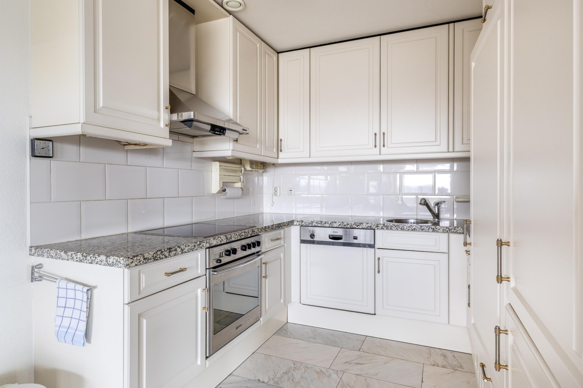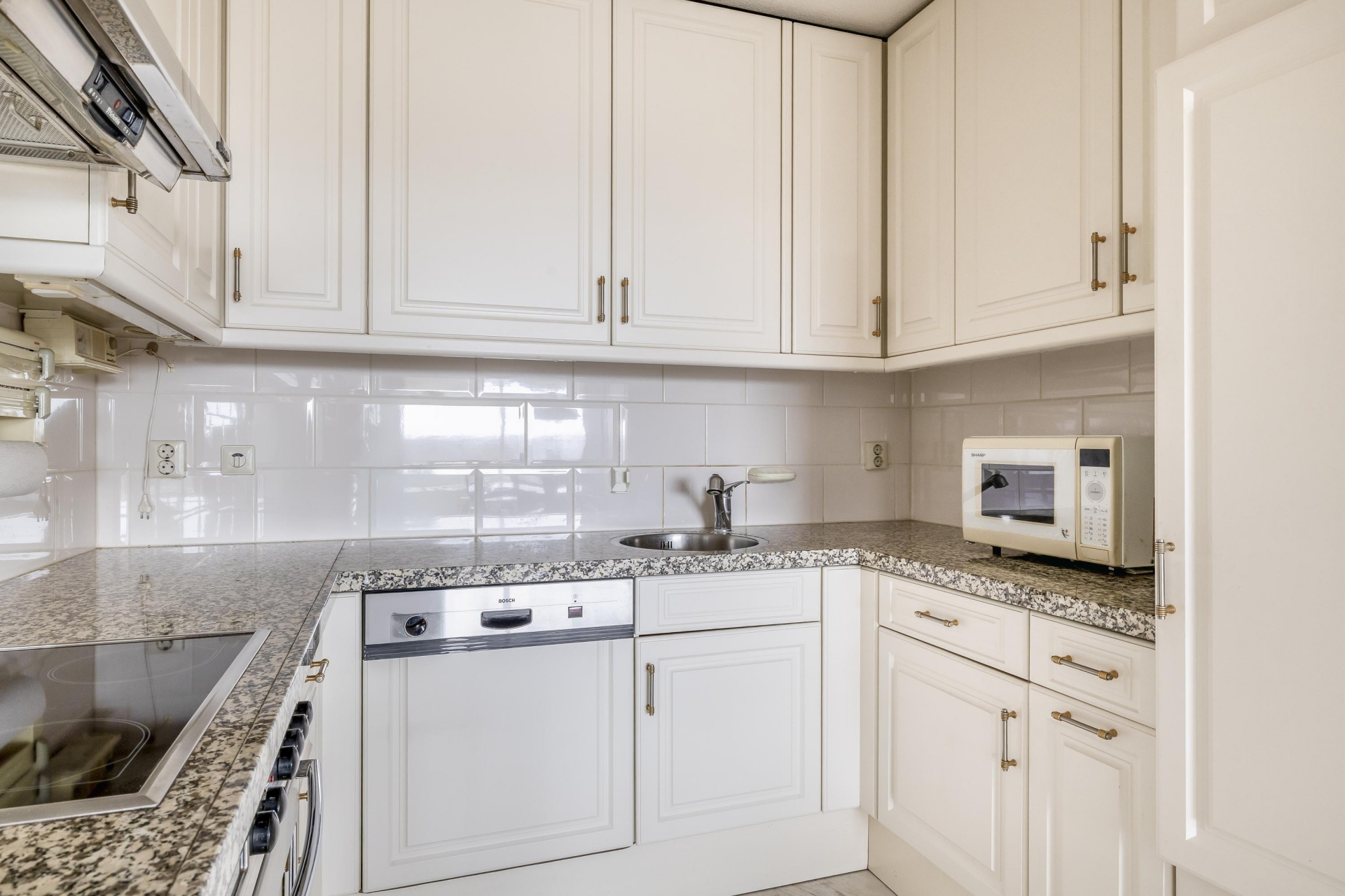 De keuken ligt praktisch ten opzichte van de woonkamer en is voorzien van diverse inbouwapparatuur, waaronder een oven, vaatwasser, afzuiging en een koelkast met vriesvak. Een functionele ruimte waar je goed uit de voeten kunt.
