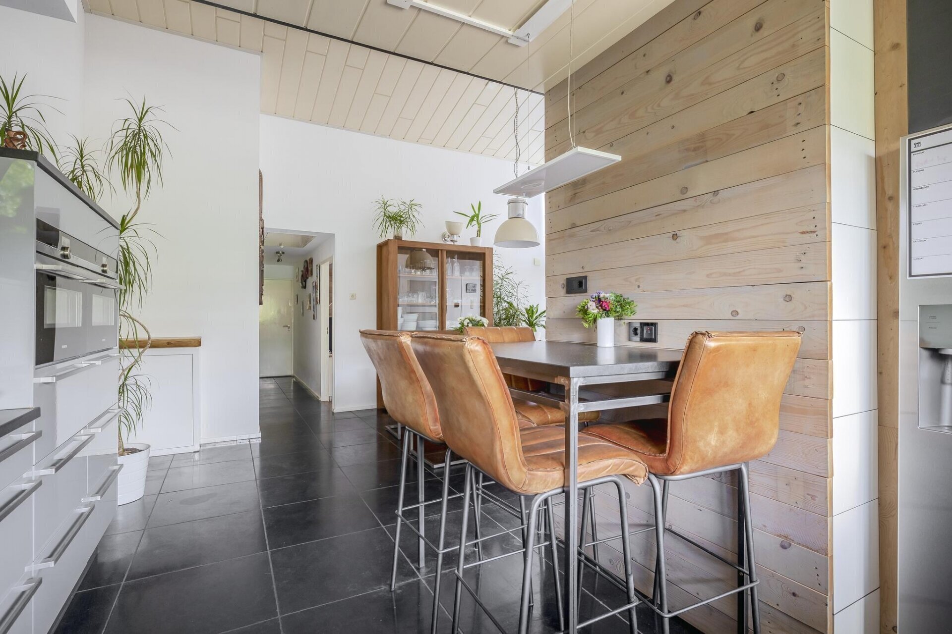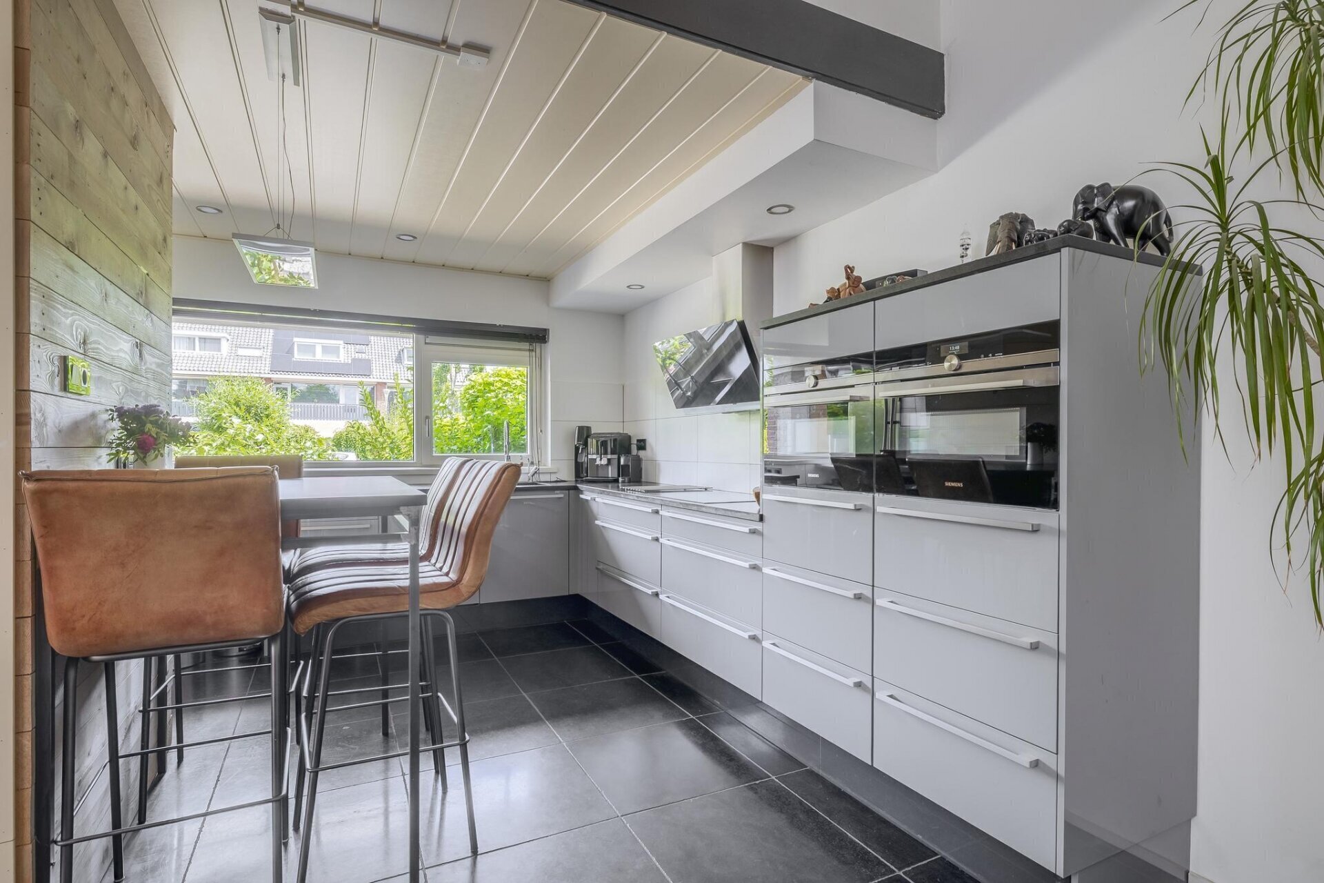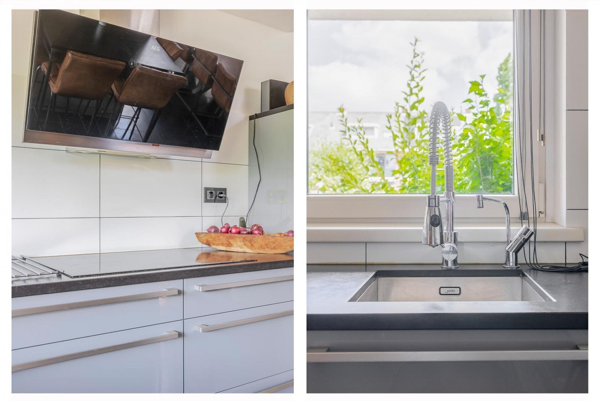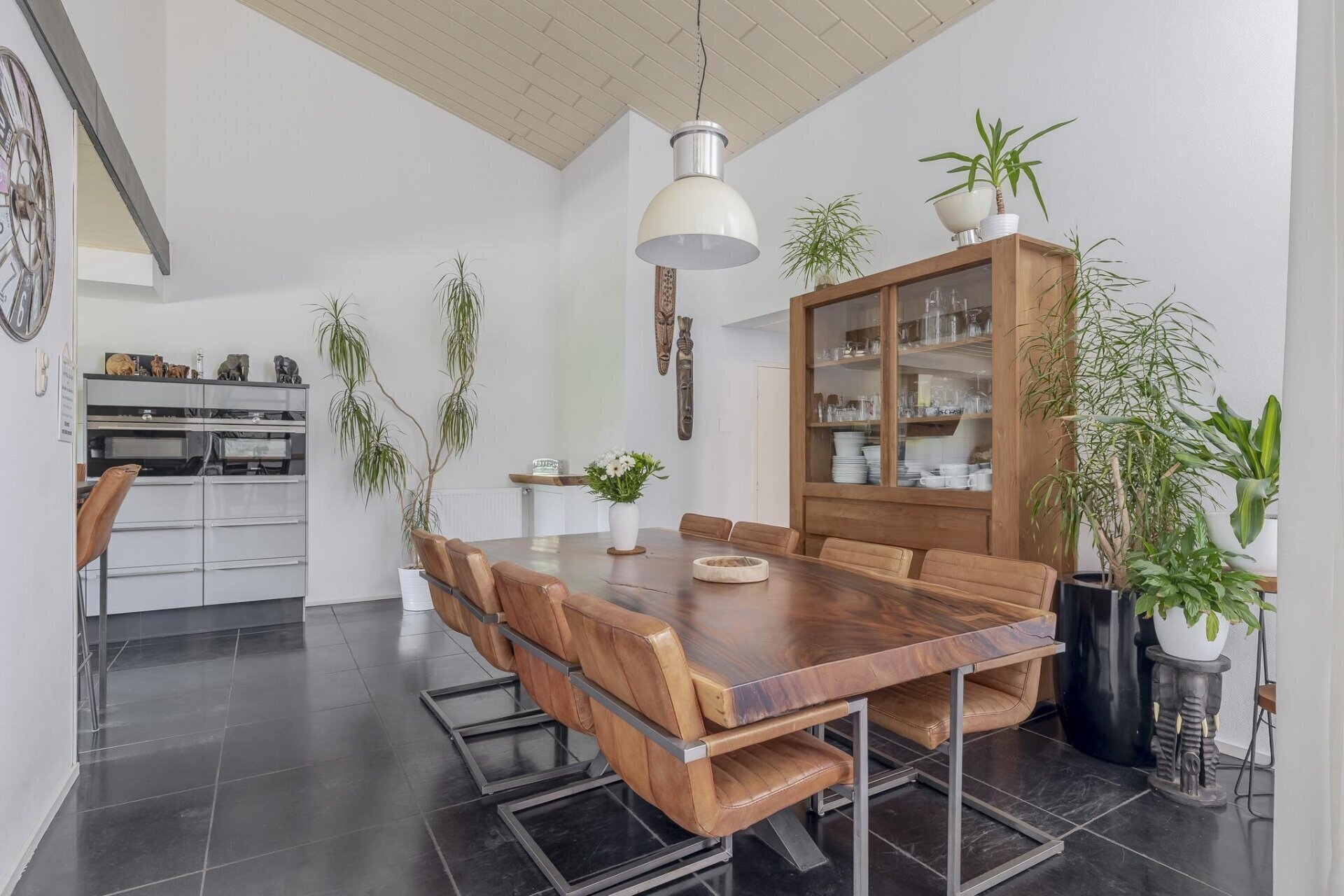 De eerste indruk is meteen raak: bij binnenkomst valt de hoogte van de woonkamer op, net als de enorme raampartijen die voor een lichte en open sfeer zorgen. De moderne open haard, de robuuste stalen trap en de fraaie natuurstenenvloer met vloerverwarming geven het geheel een luxe uitstraling. De living loopt naadloos over in de eetkamer en keuken – een geweldige plek om te koken, eten en borrelen. De keuken is strak vormgegeven, uitgerust met hoogwaardige apparatuur en voorzien van alle benodigdheden. Dankzij de grote ramen aan de voorzijde heb je hier bovendien prettig uitzicht op het groen in de straat.