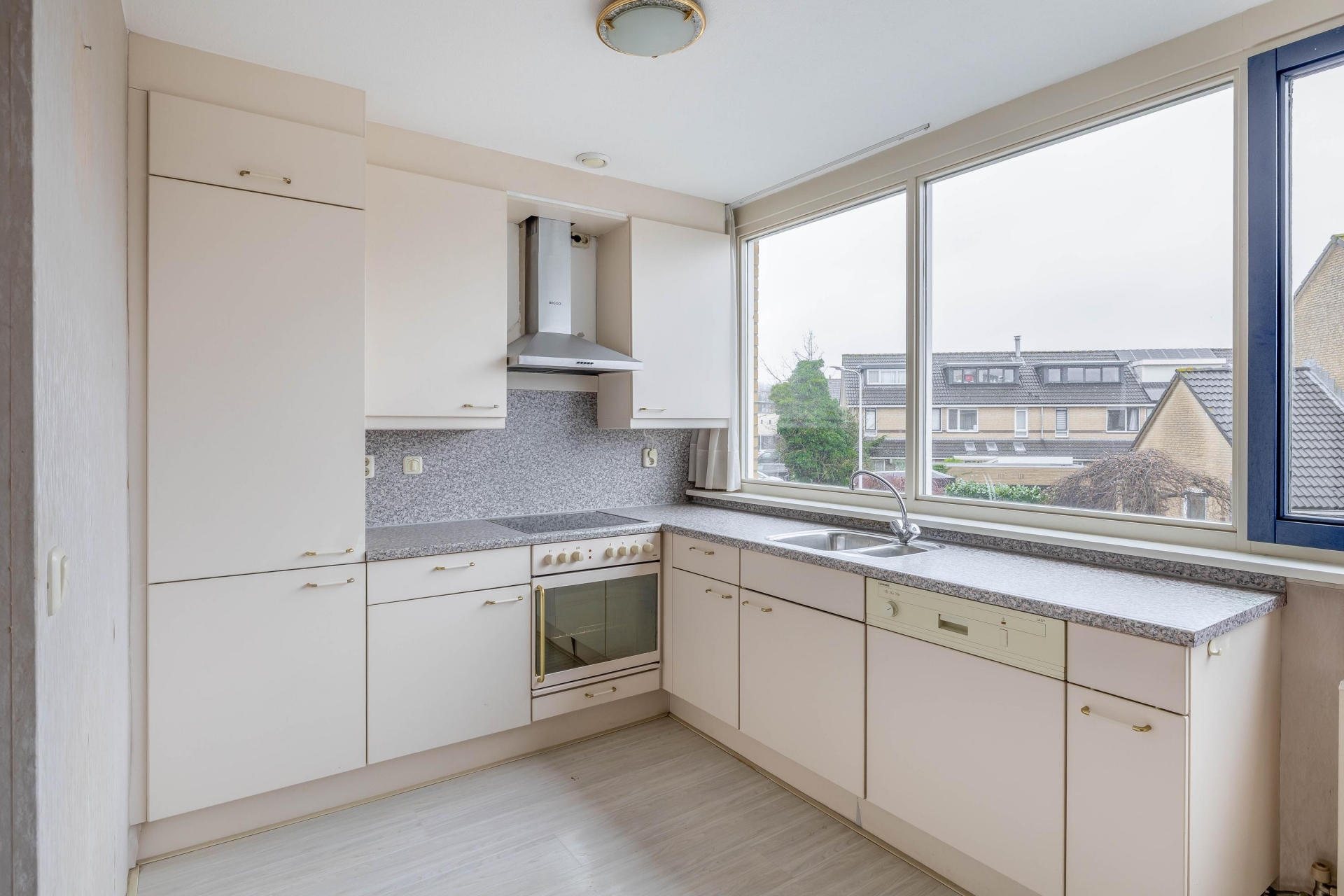 De keuken in L-opstelling is voorzien van diverse inbouw apparatuur (afzuigkap, keramische kookplaat, koel-vriescombinatie, spoelbak en vaatwasser).