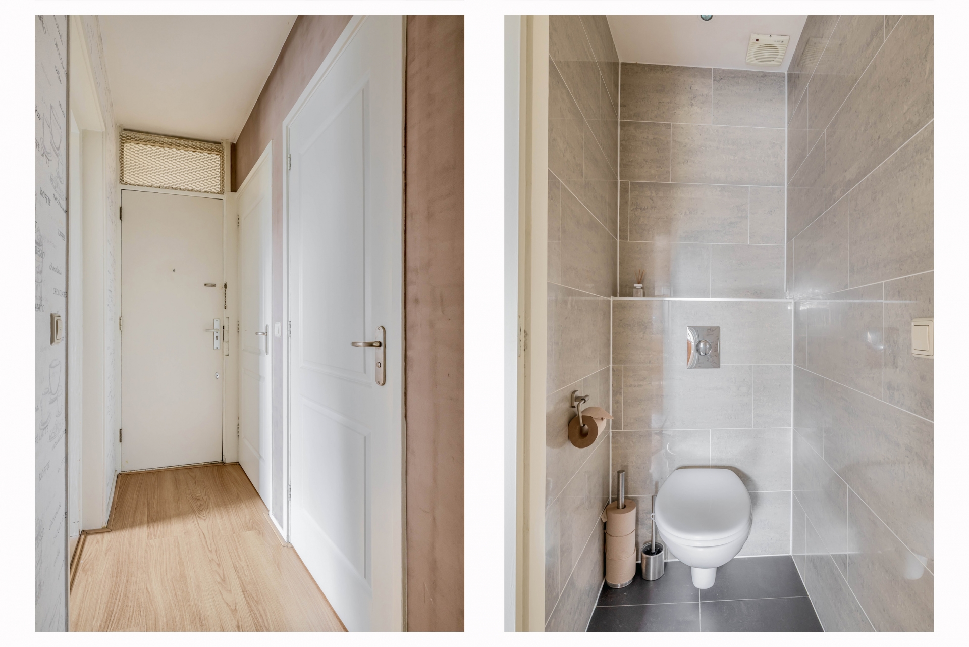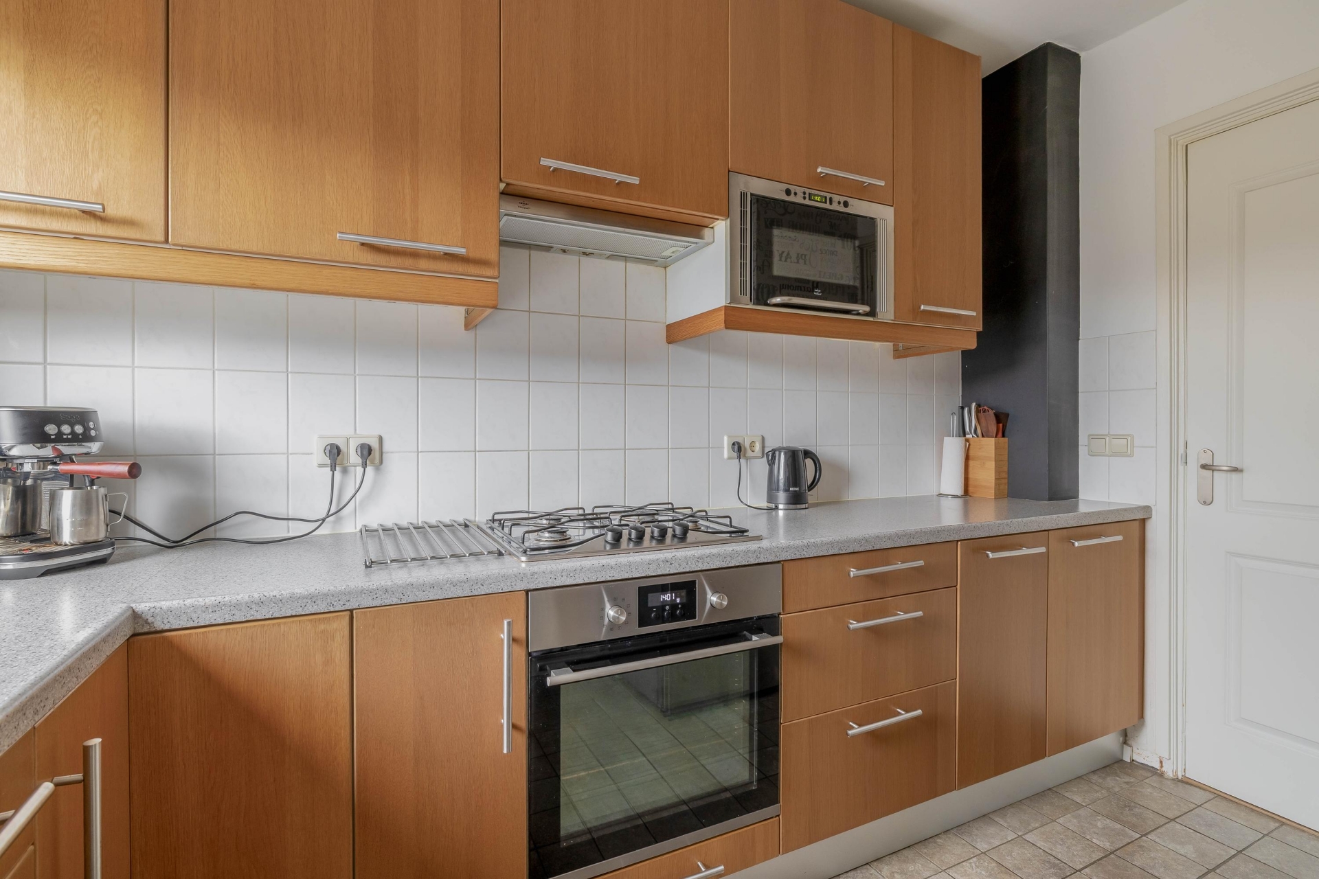 De aangrenzende keuken is opgesteld in een praktische L-vorm en voorzien van inbouwapparatuur zoals een oven, magnetron, gaskookplaat en een koel-vriescombinatie. Er is voldoende kastruimte en ook een vaatwasser is eenvoudig te realiseren. In de hal bevindt zich een apart toilet met mechanische ventilatie én extra kastruimte met wasmachineaansluiting. Alles praktisch en netjes weggewerkt.