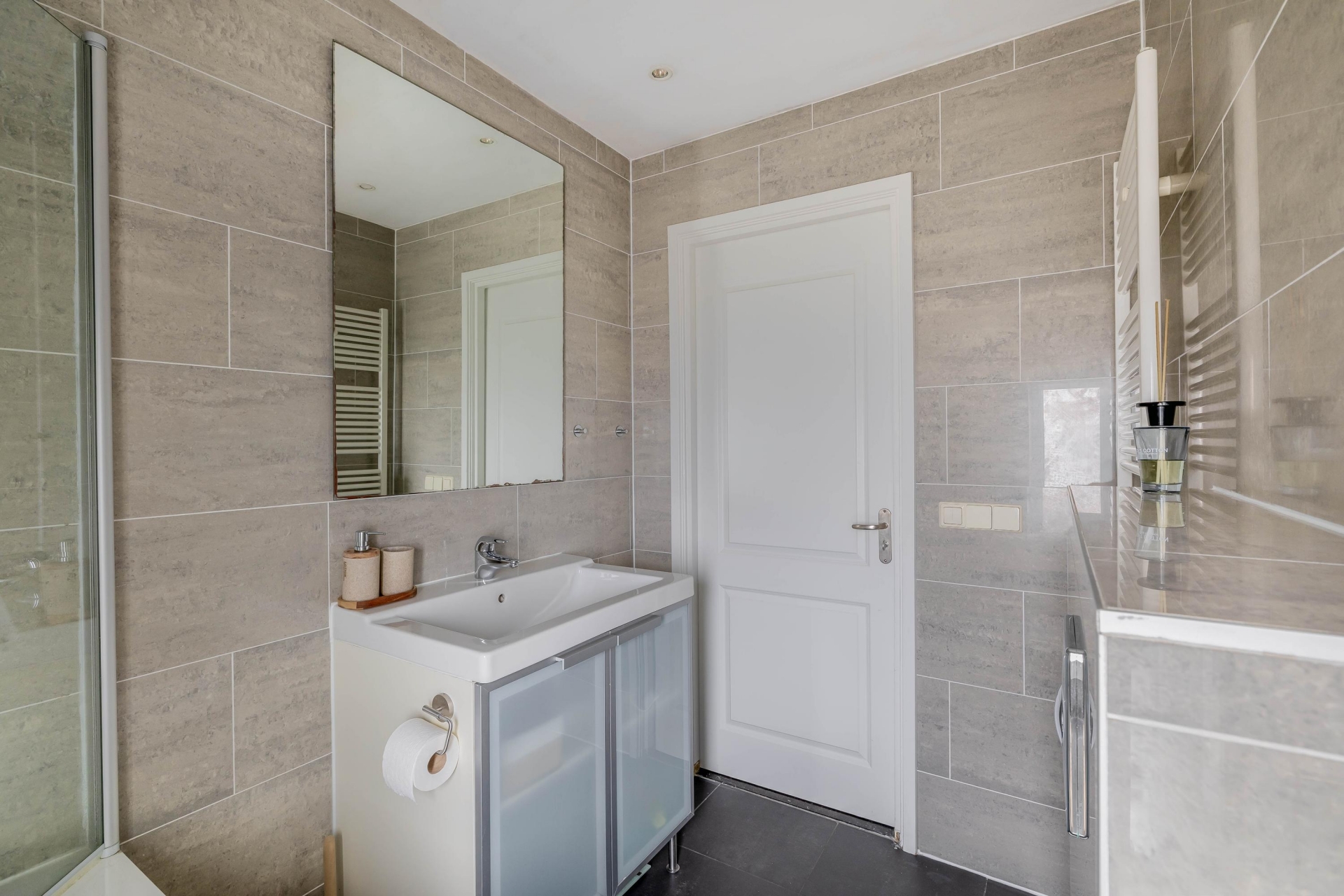 De badkamer is modern en compleet: uitgerust met een ligbad, een vrij hangend toilet, wastafelmeubel, designradiator en mechanische ventilatie. Alles strak afgewerkt en netjes onderhouden, precies zoals je dat graag ziet.