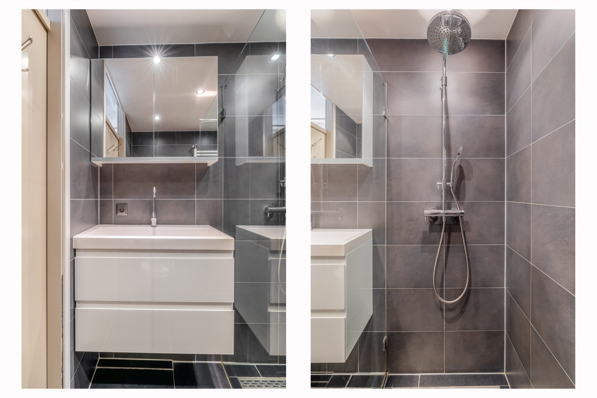 De badkamer is modern uitgevoerd en beschikt over een inloopdouche, wastafelmeubel en een tweede toilet. De donkere tegels in combinatie met het strakke sanitair zorgen voor een luxe uitstraling.