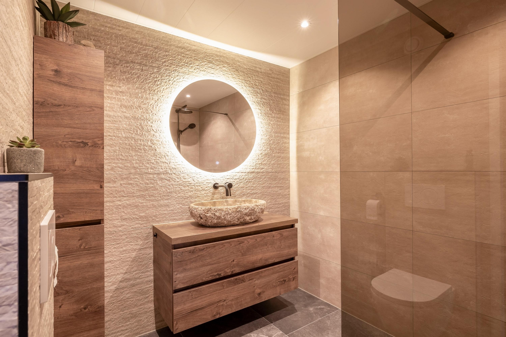 De badkamer is stijlvol en recent vernieuwd, voorzien van inloopdouche, wastafelmeubel en toilet.