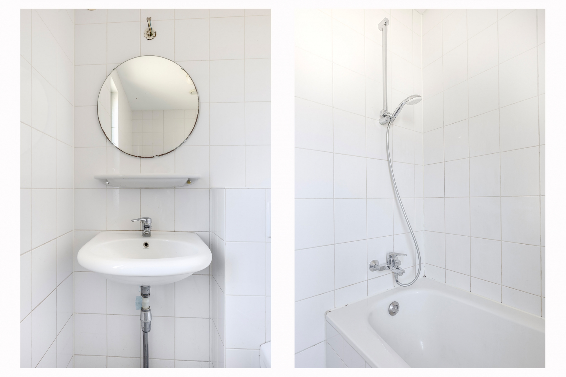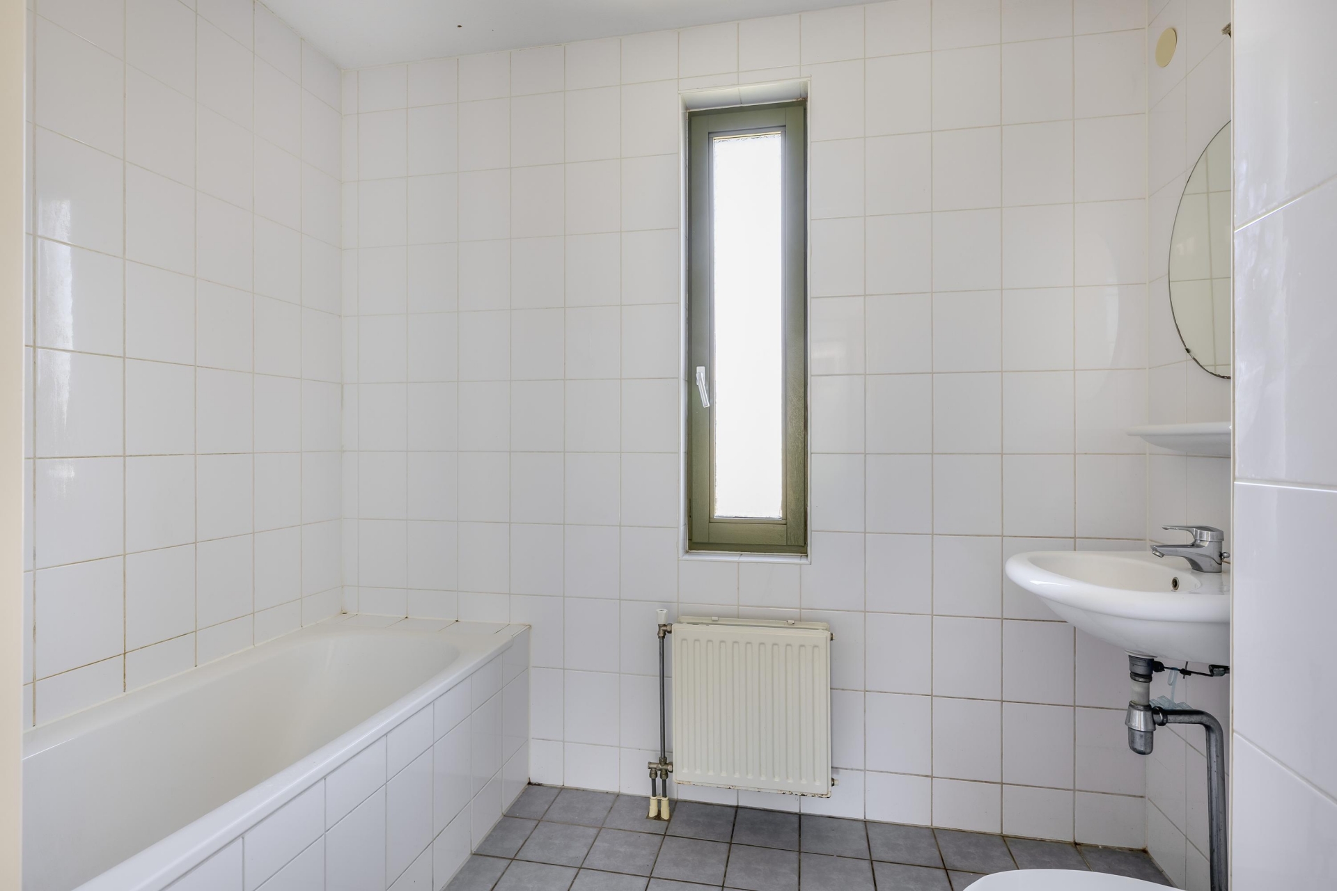 De badkamer is volledig betegeld en voorzien van een ligbad, wastafel en toilet. Ook hier is de uitvoering netjes, maar eenvoudig. Met een update maak je er eenvoudig een frisse, eigentijdse badkamer van die past bij de rest van je nieuwe thuis.