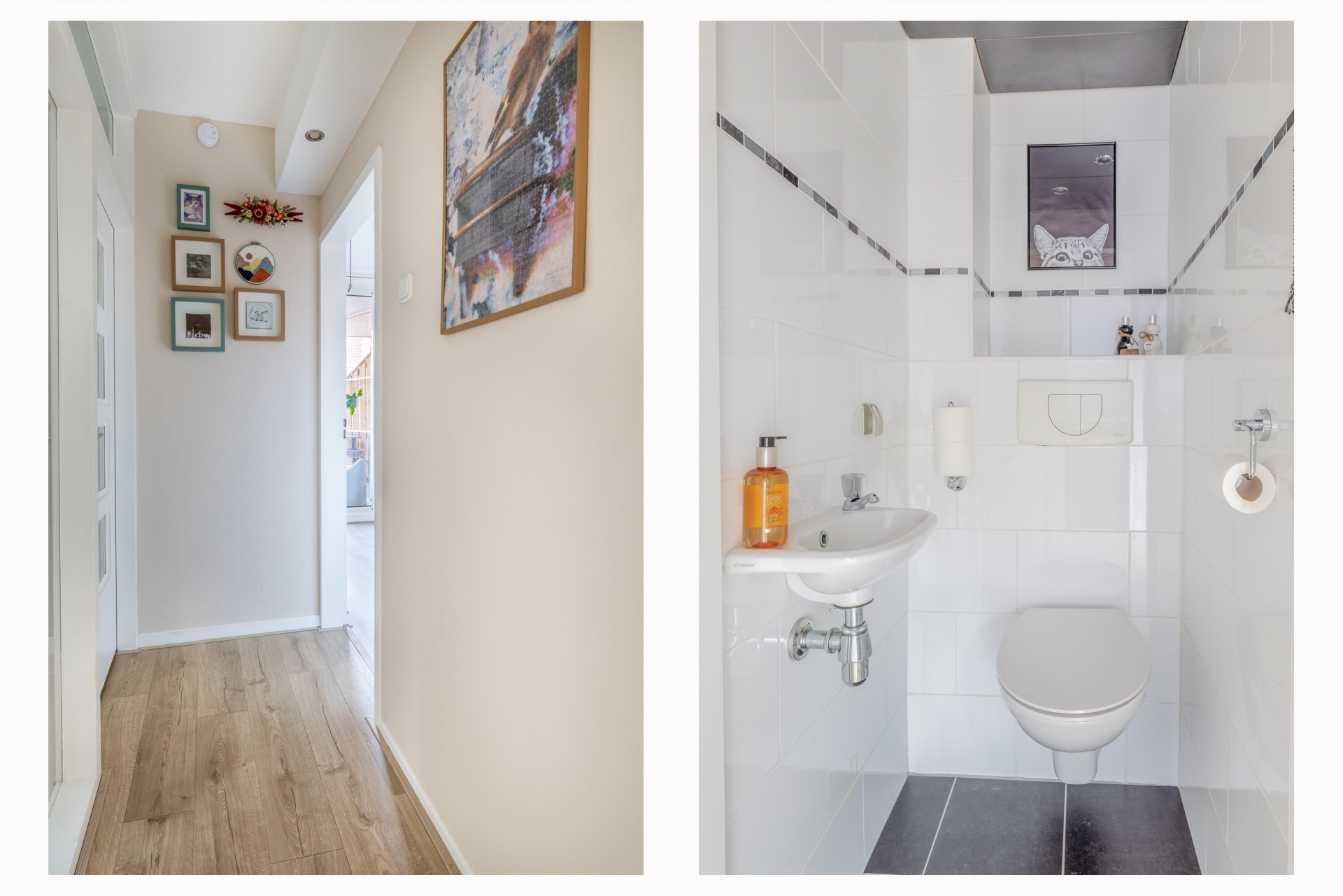 Naast de keuken ligt de tussenhal, die toegang biedt tot de twee slaapkamers, een separaat toilet met fonteintje en de badkamer.