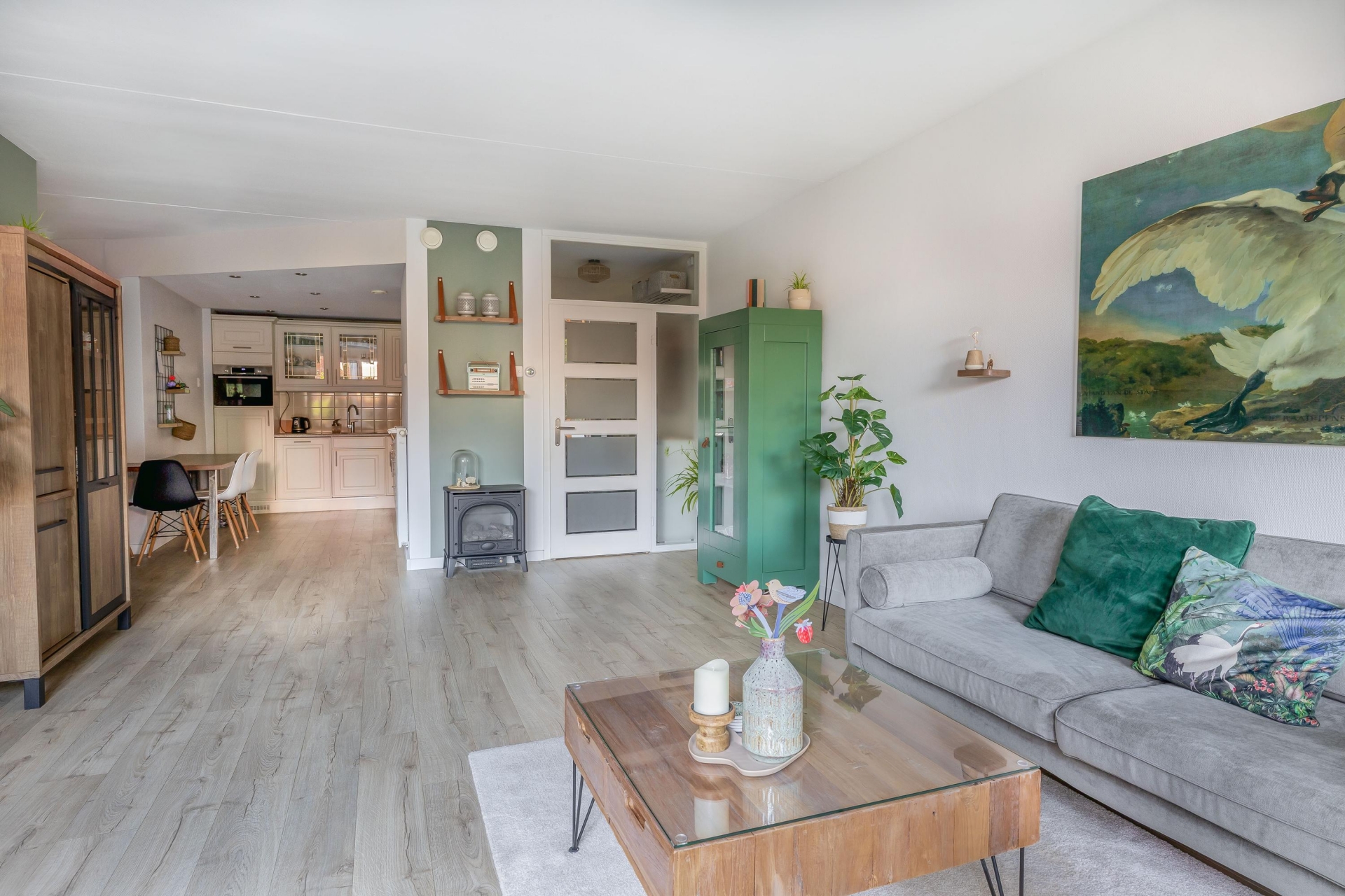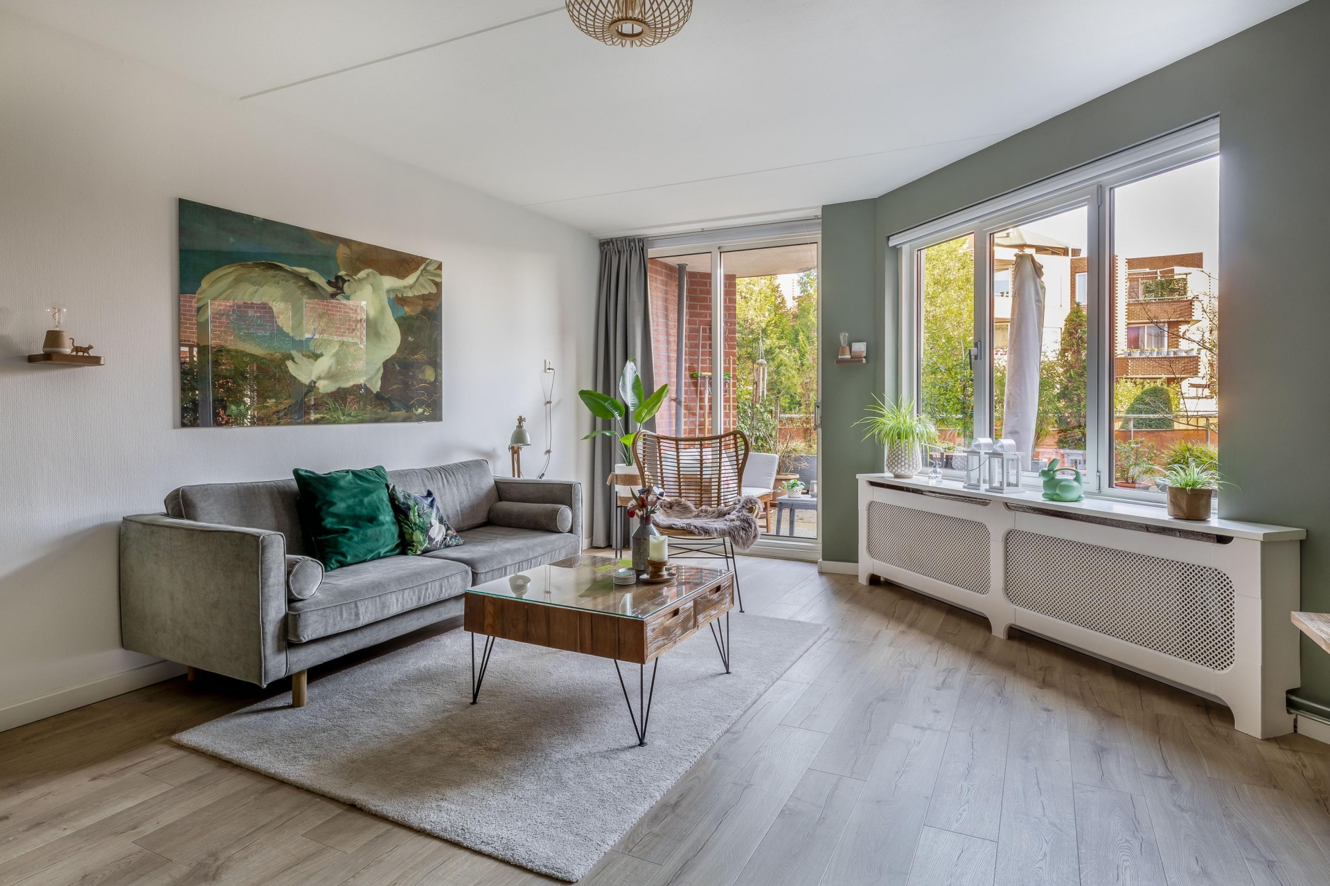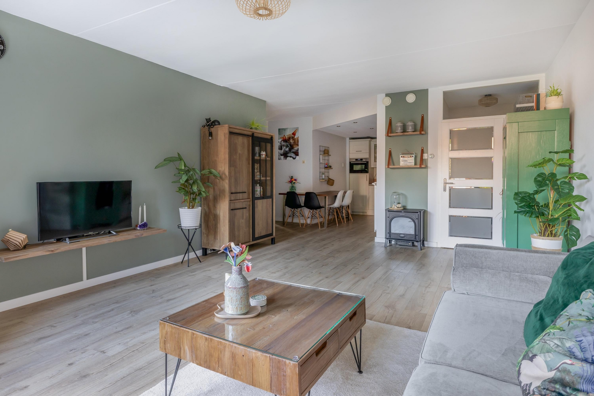 Bij binnenkomst in de woonkamer valt direct de royale ruimte op. Het prachtige lichtinval, gecombineerd met de grote ramen en de schuifpui naar het terras, zorgt ervoor dat binnen en buiten naadloos in elkaar overlopen.