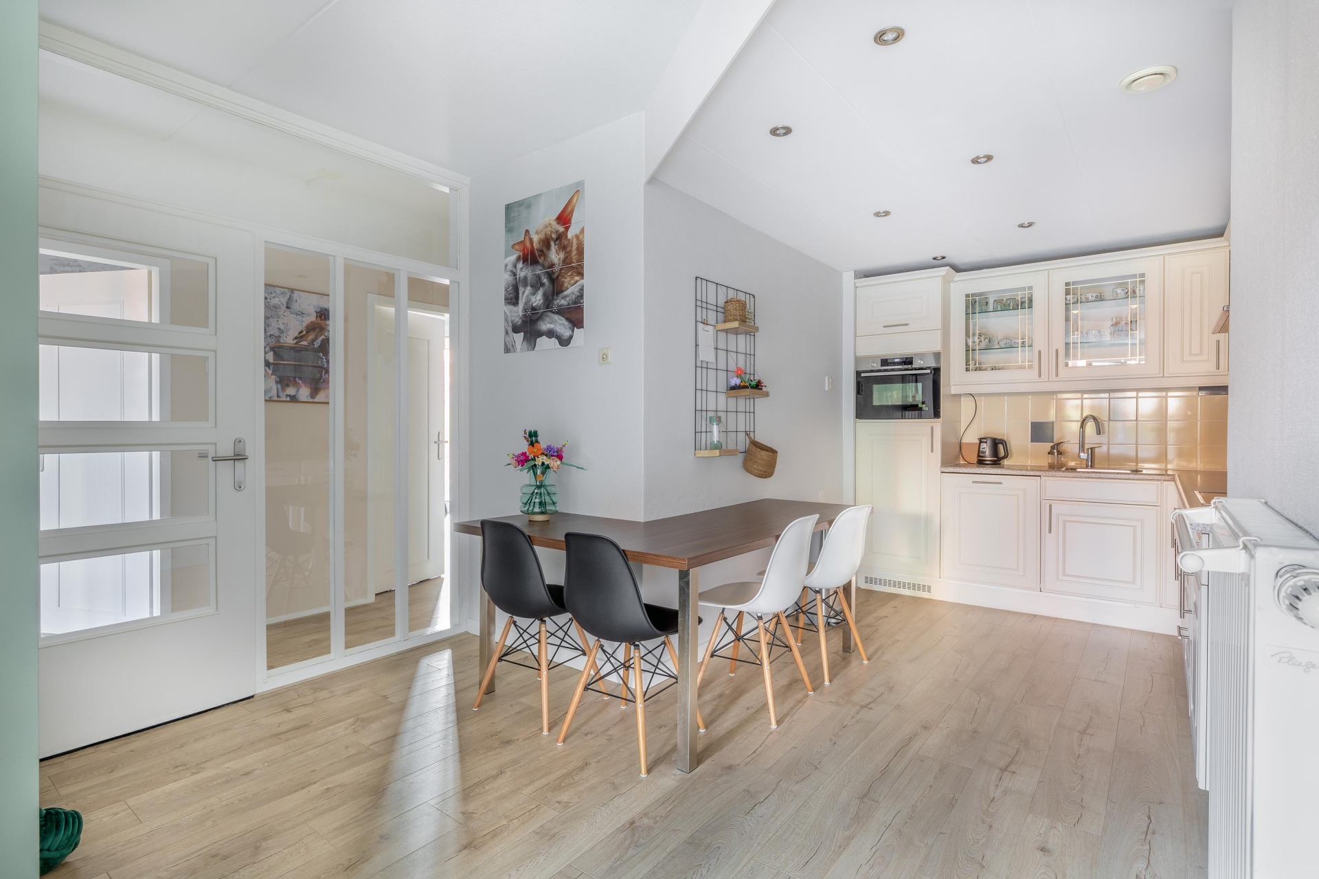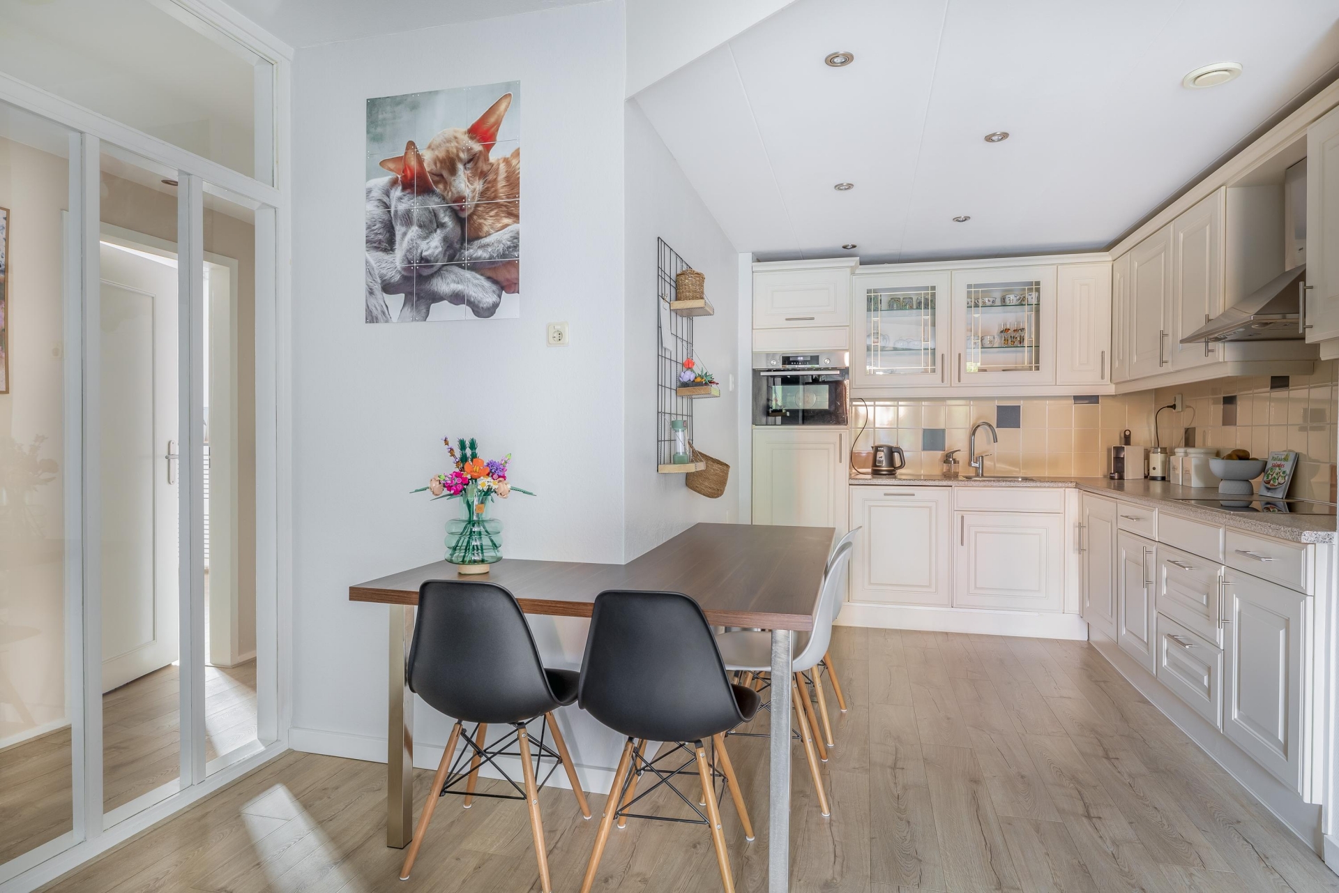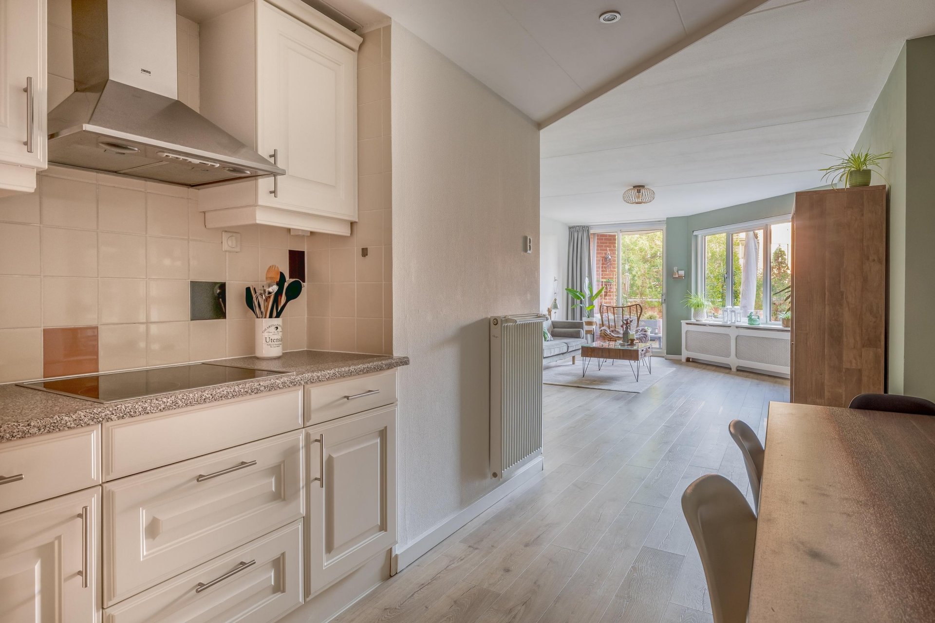 Aansluitend aan de woonkamer bevindt zich de landelijke keuken. Deze heeft een L-opstelling, waardoor er een ruimtelijk gevoel ontstaat en er veel werk- en opbergruimte is. De keuken is uitgerust met diverse inbouwapparatuur, waaronder een elektrische kookplaat met afzuigkap, combi-oven, vaatwasser, koelkast en grote vriezer.