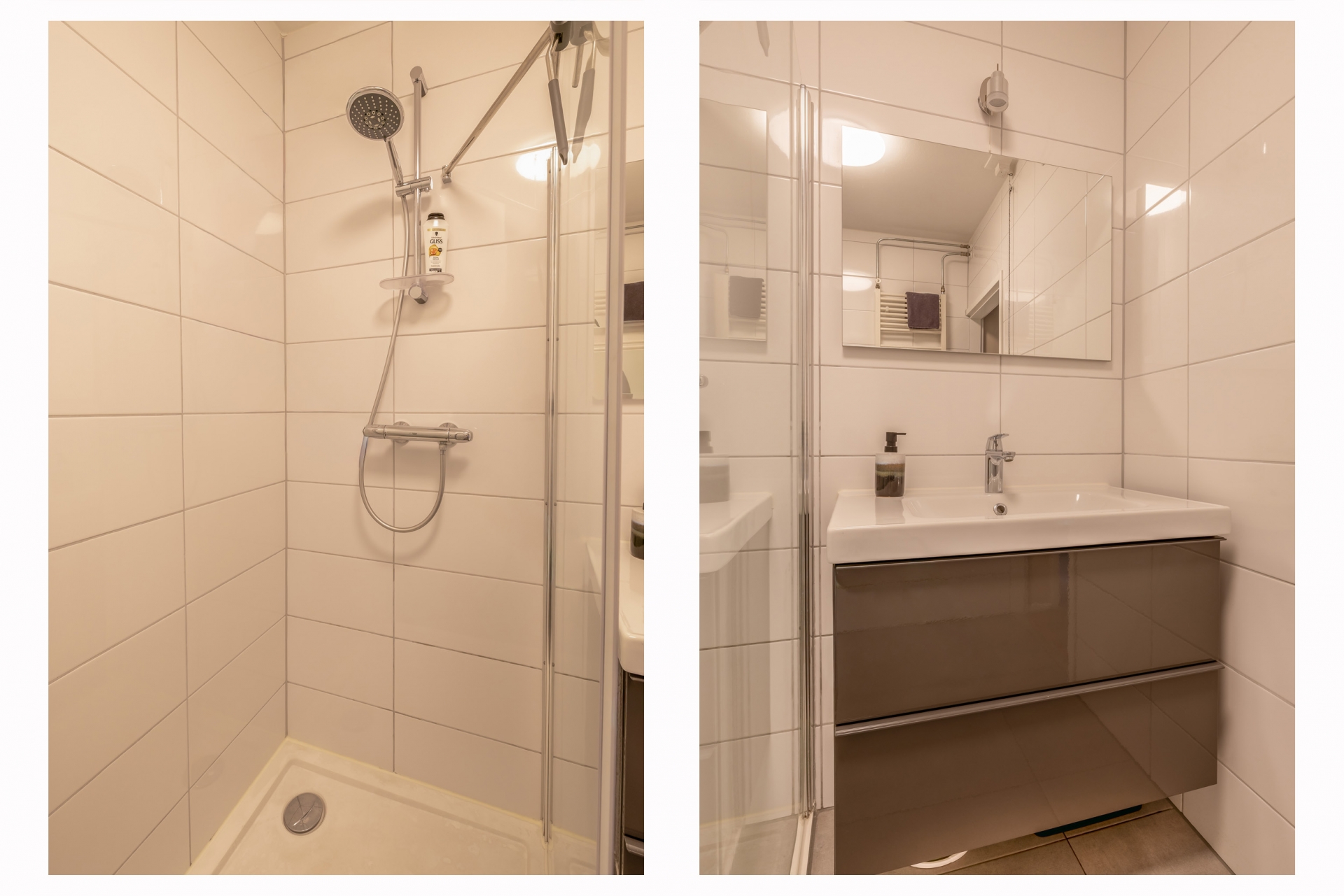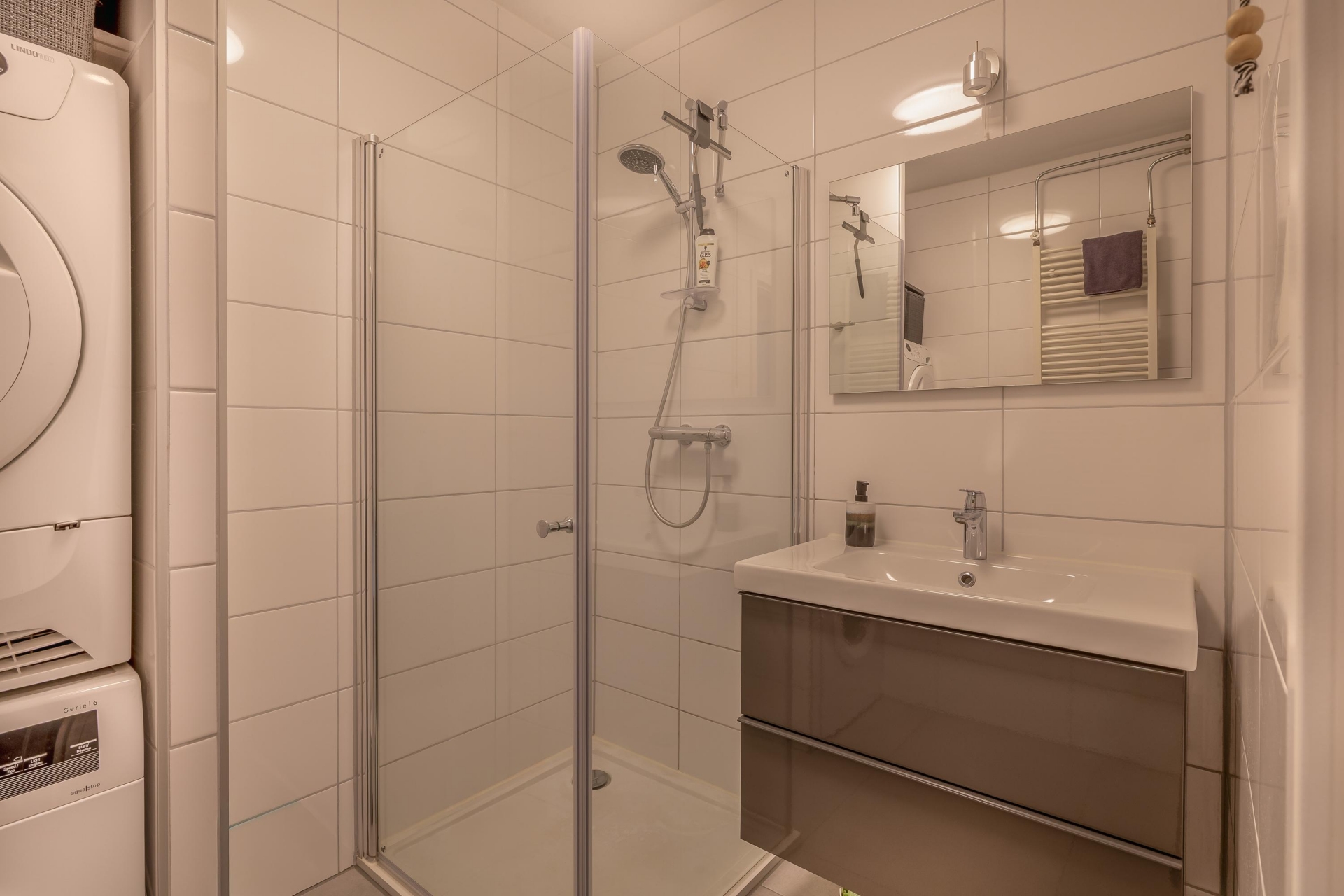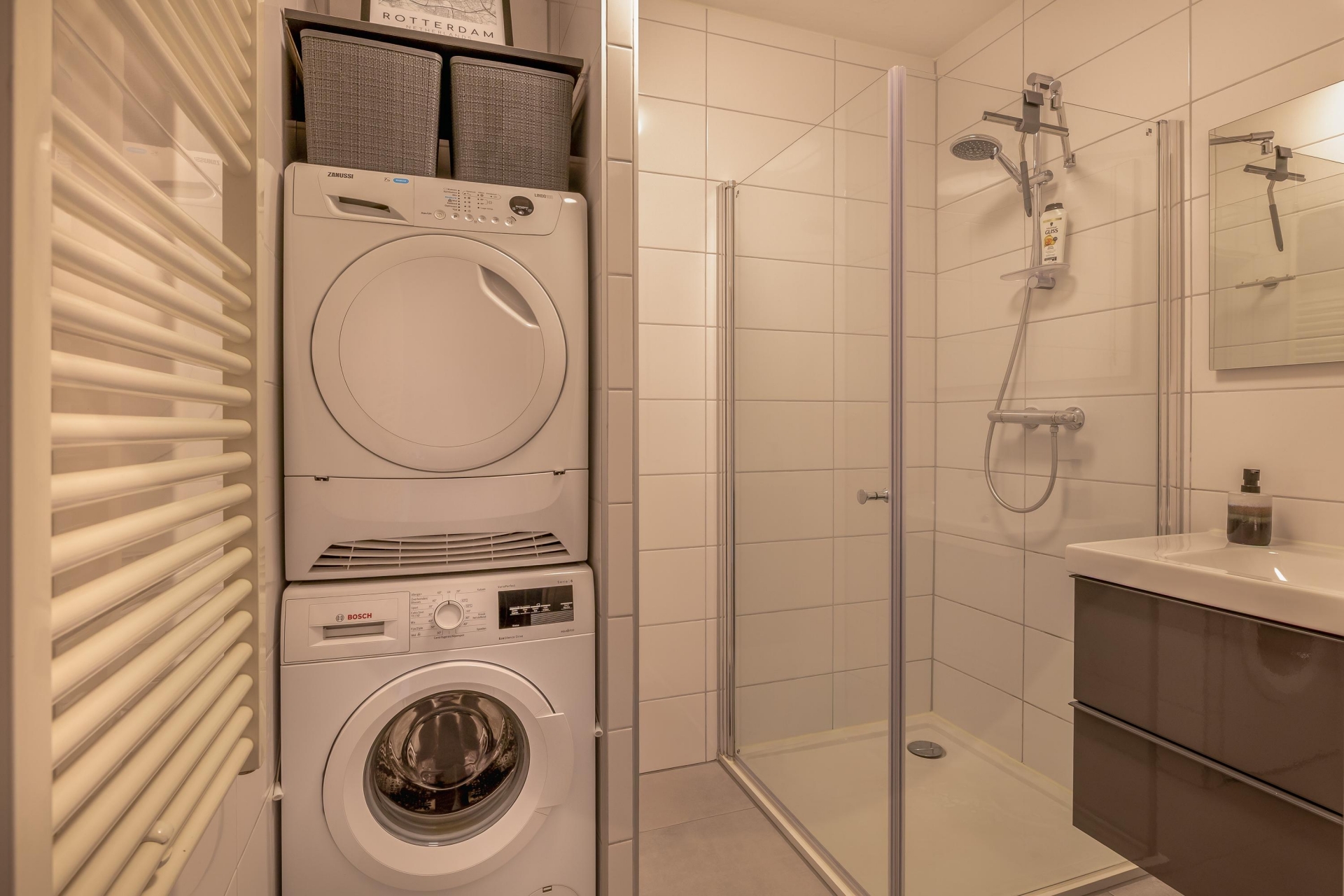 De badkamer is compleet ingericht met een douchecabine, wastafelmeubel en een aparte ruimte voor de wasmachine en droger.