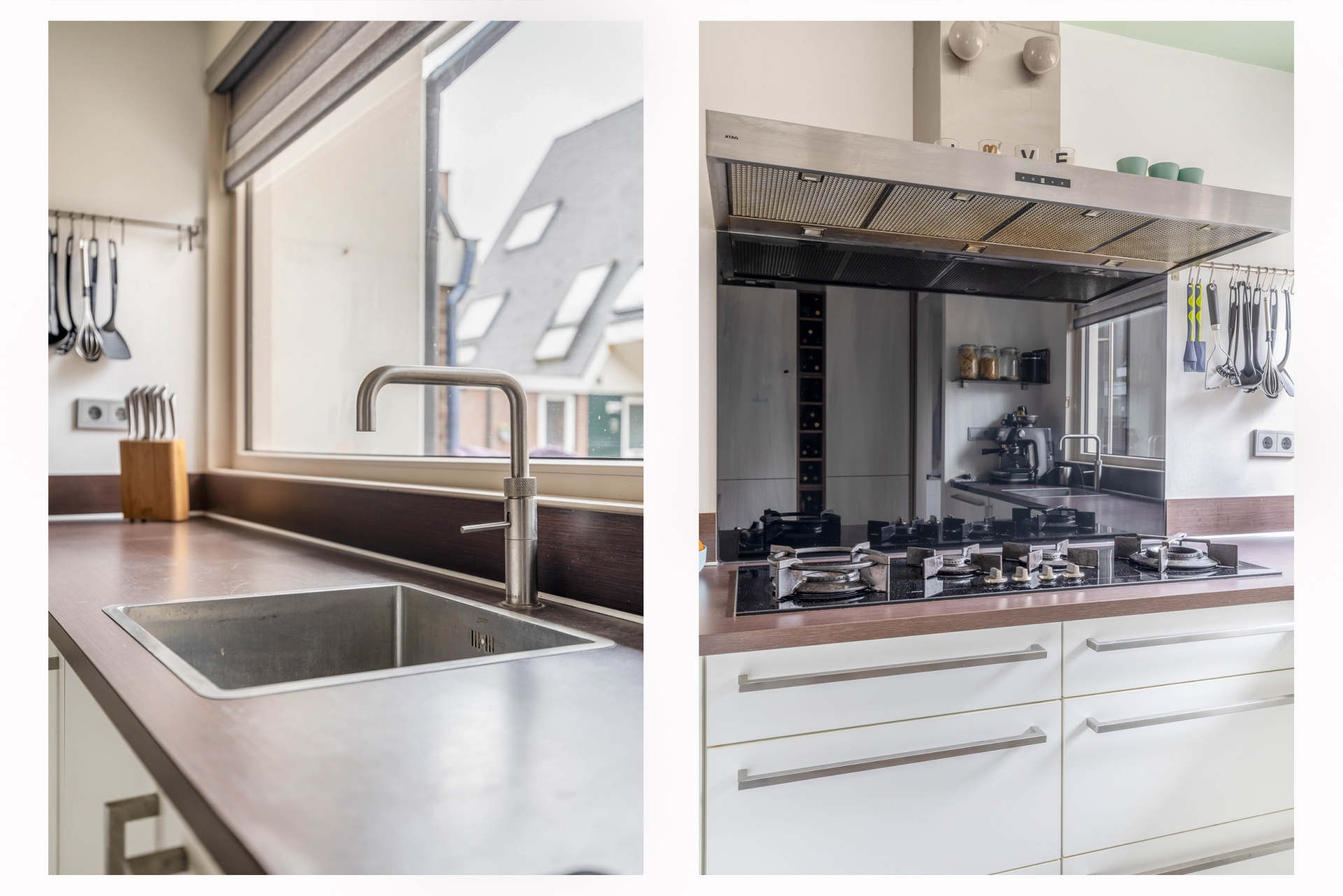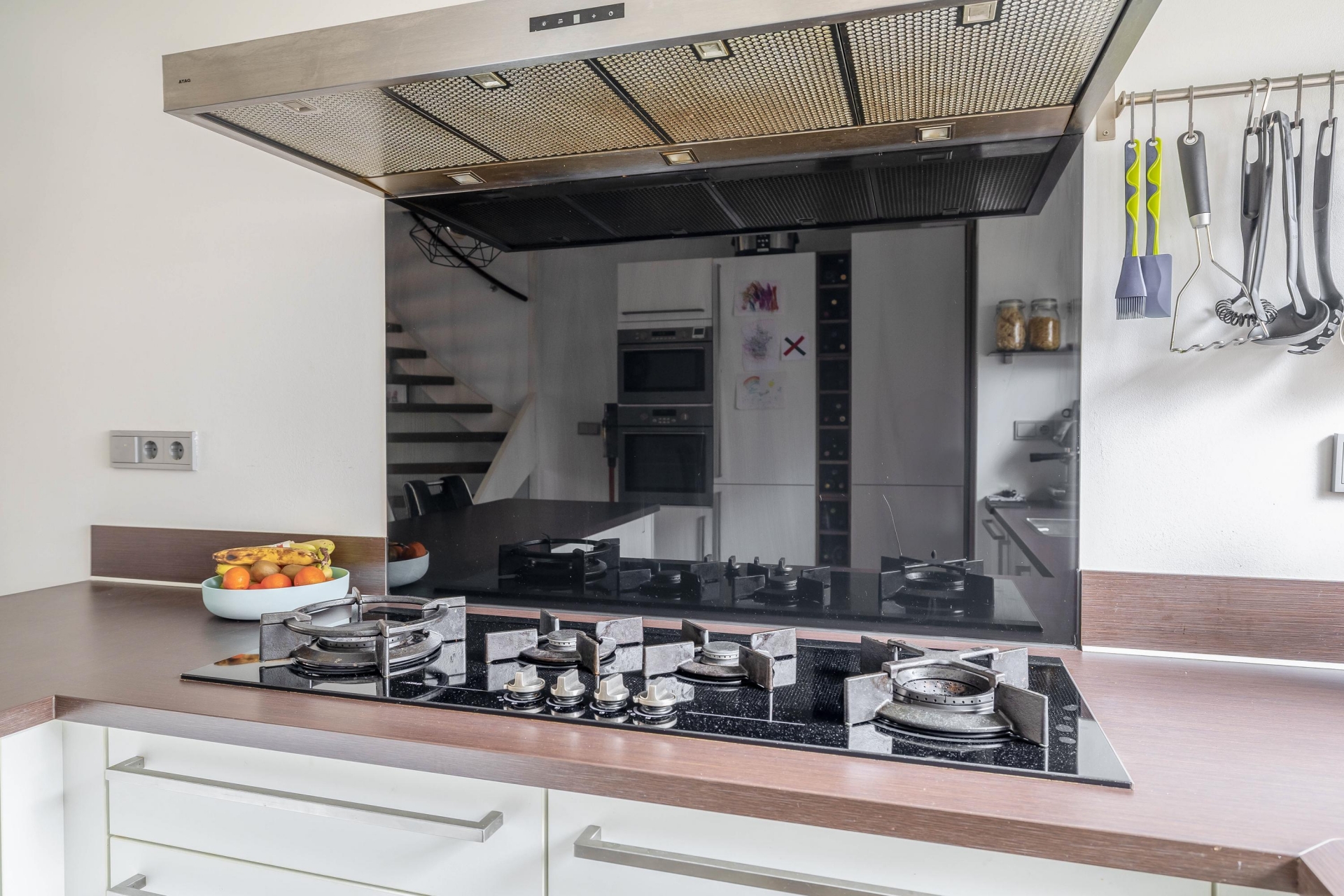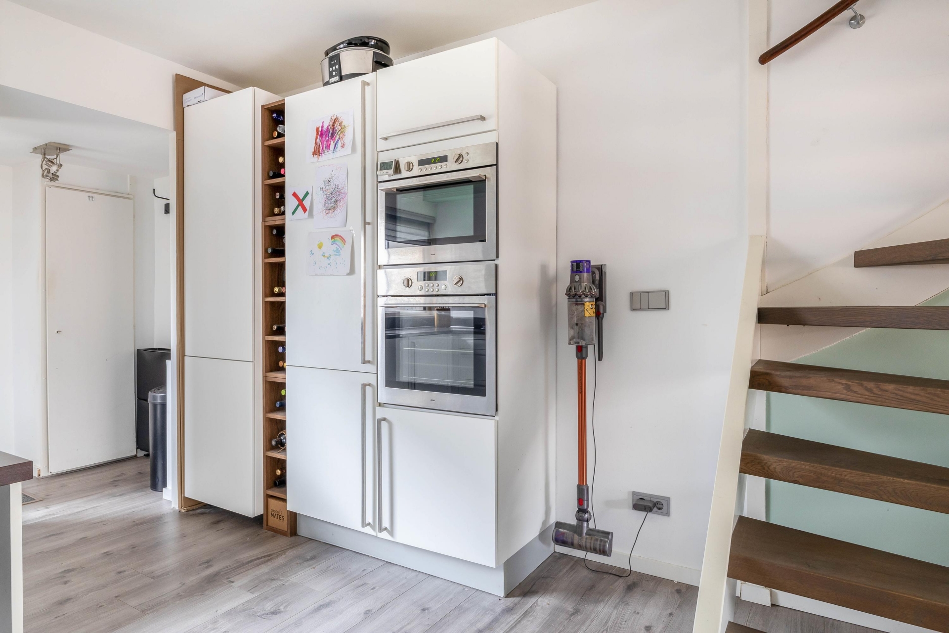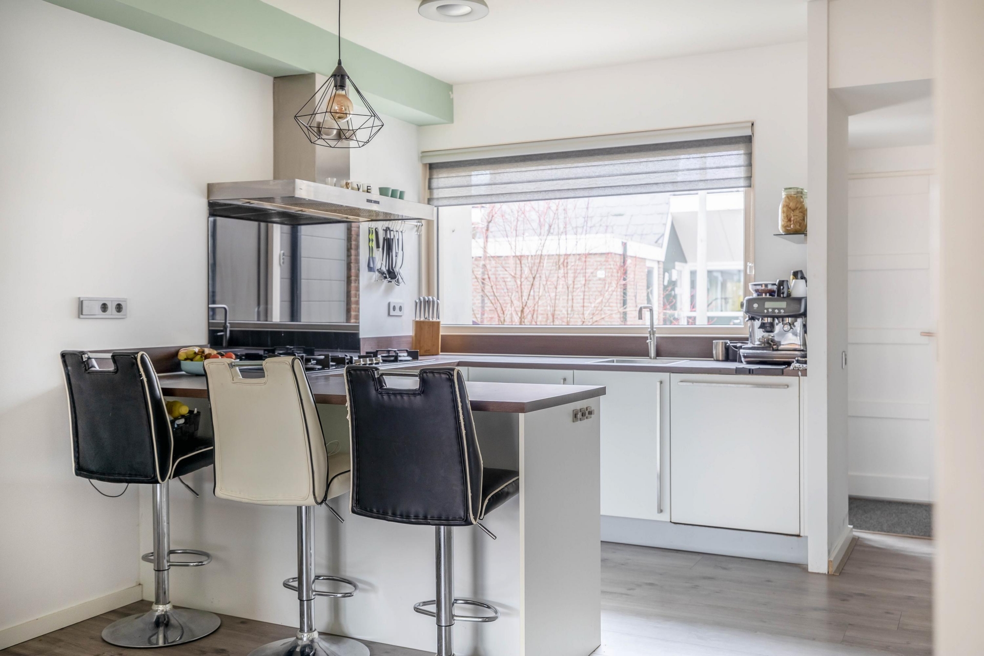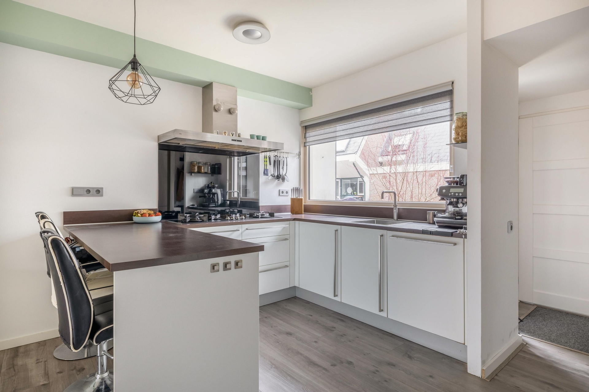 Entree, hal met vernieuwde meterkast en een modern betegeld toilet met hangcloset en fonteintje. Aan de voorzijde van de woning bevindt zich de gezellige en moderne keuken, uitgevoerd in een U-opstelling met kastenwand. De keuken is afgewerkt met witte kasten en een kunststof werkblad en voorzien van diverse inbouwapparatuur: een 4-pits gas-op-glas kookplaat, afzuigkap, vaatwasser, oven, magnetron en een koel-/vriescombinatie. Aan de keuken is een gezellig barretje gerealiseerd.