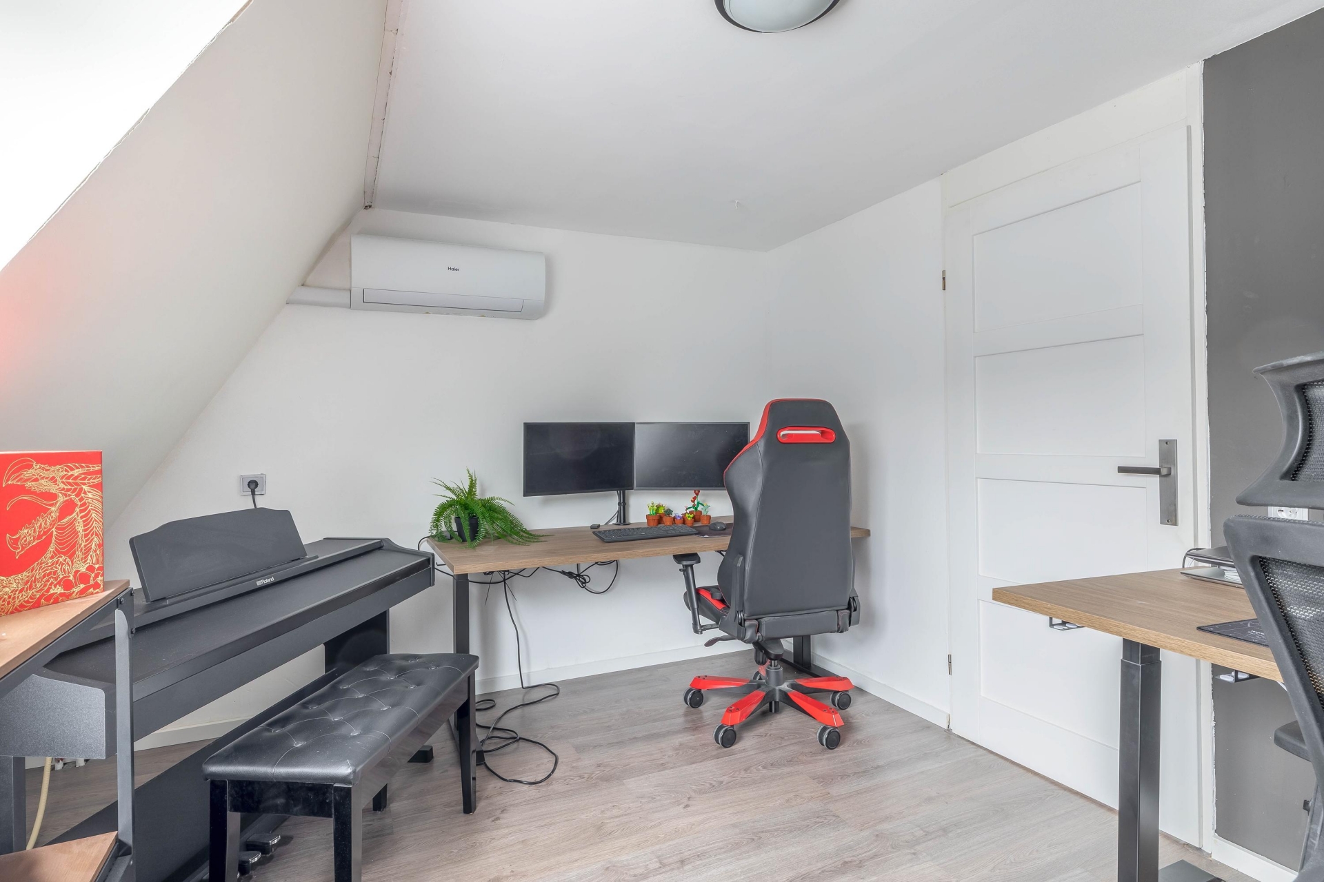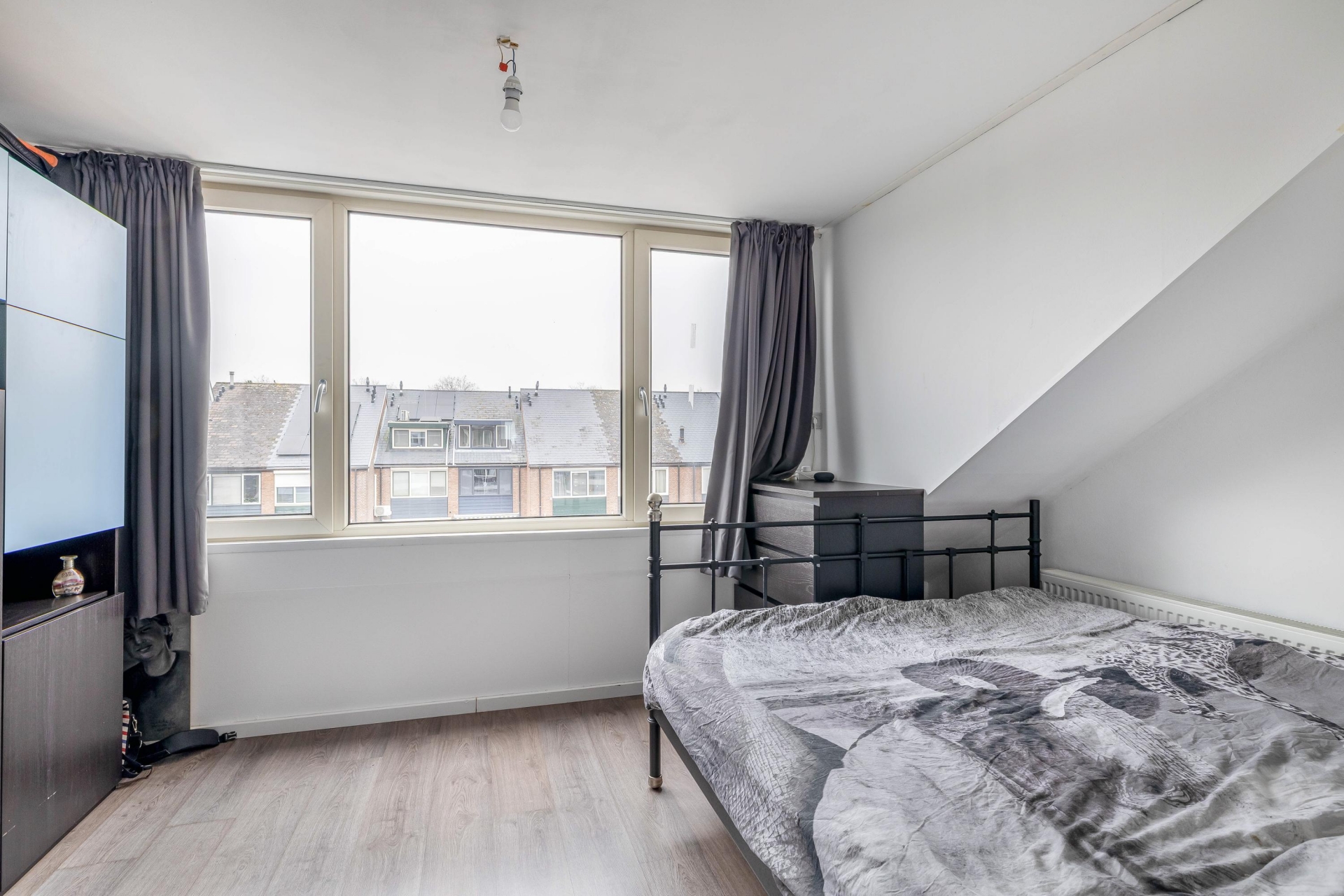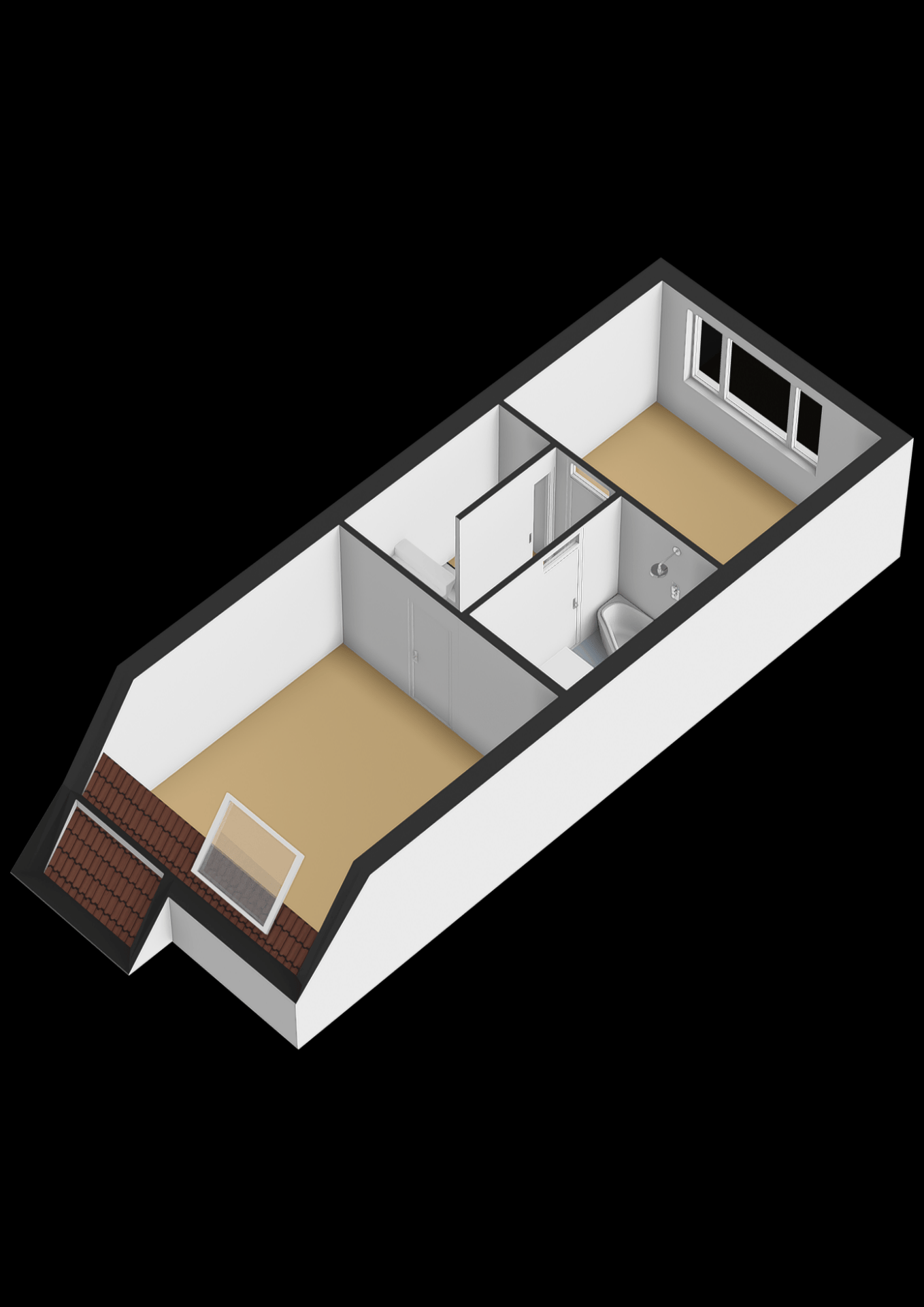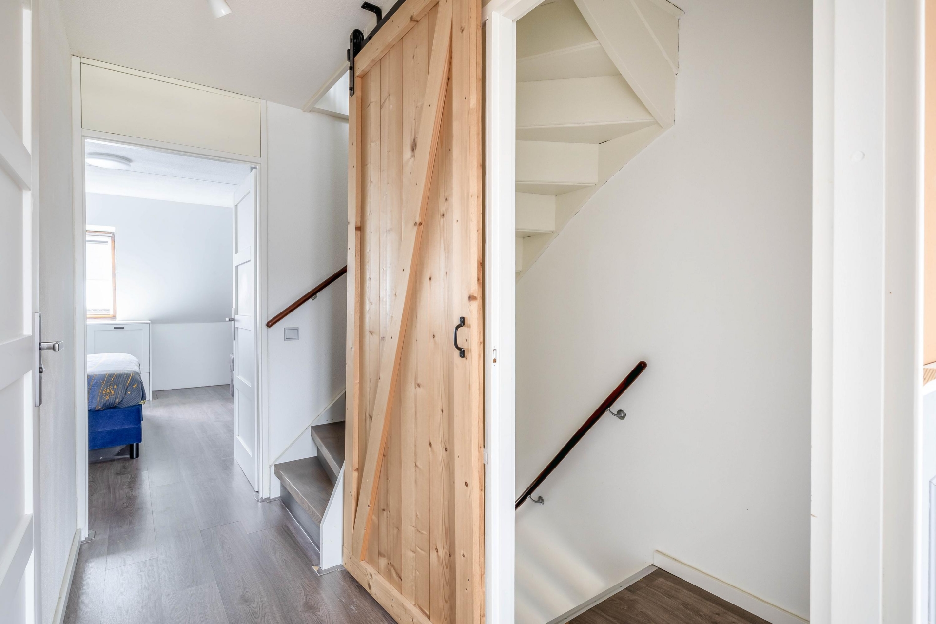 Overloop met toegang tot twee slaapkamers en de badkamer. De royale masterbedroom aan de voorzijde beschikt over een groot dakraam en een ingebouwde kast. De tweede slaapkamer is gelegen aan de achterzijde van de woning.