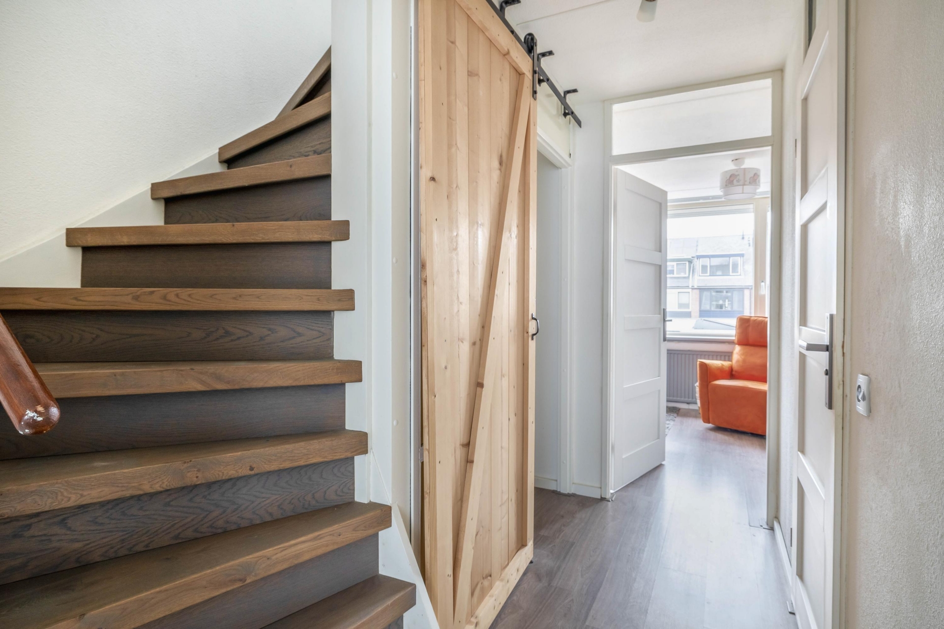 De ruime woonkamer is tuingericht en beschikt over een kunststof schuifpui naar de achtertuin. De open trap is volledig gerenoveerd, net als de trap naar de tweede verdieping. Het open contact met de keuken maakt deze leefruimte ideaal voor gezinnen of gezellige avonden met visite. De gehele begane grond is voorzien van een laminaatvloer met vloerverwarming.
