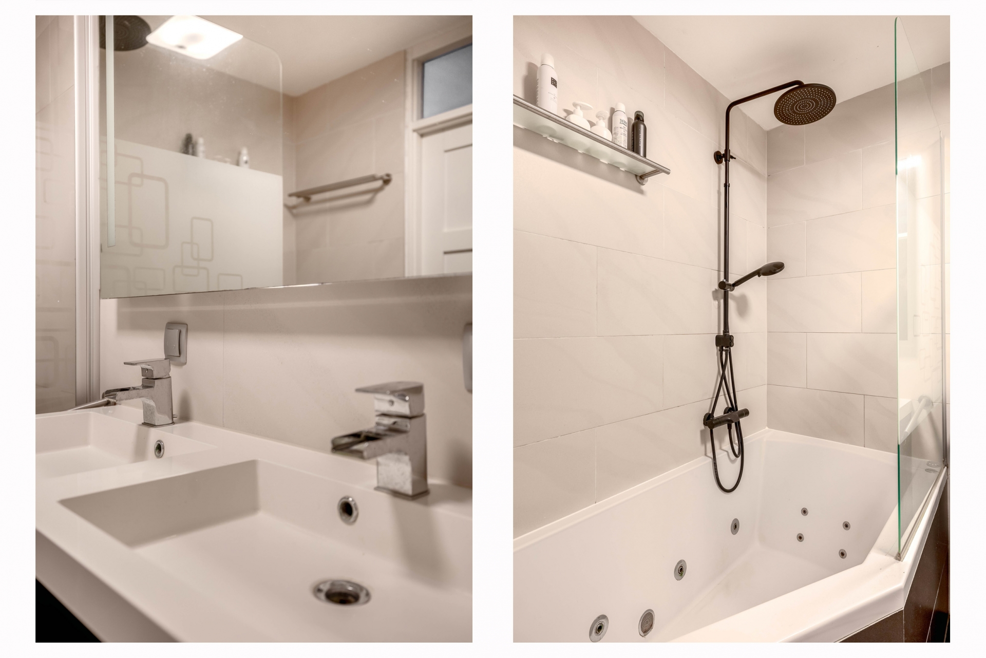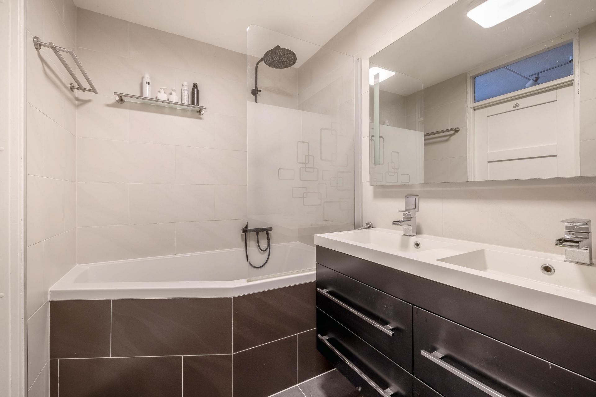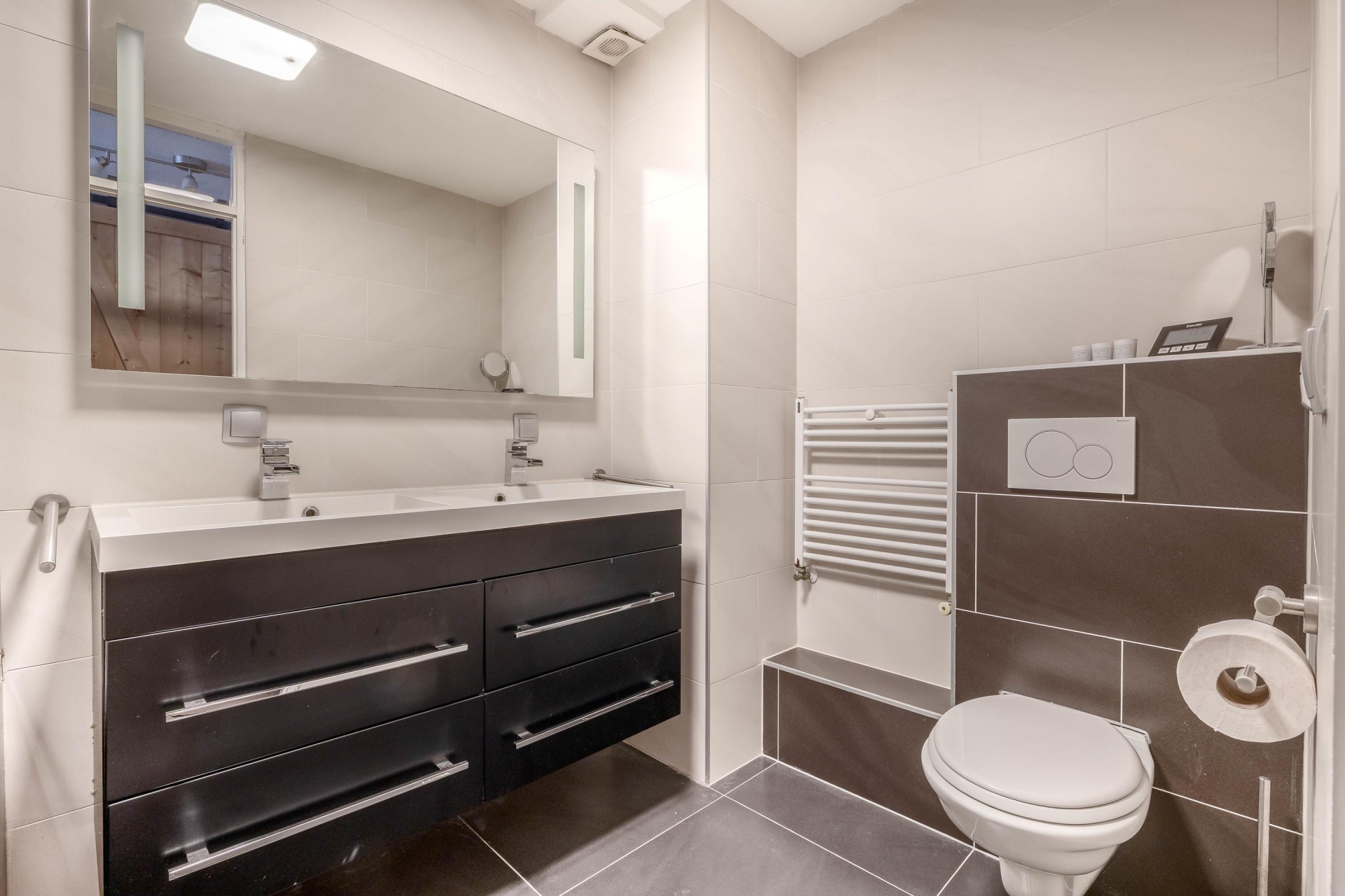 De ruime badkamer bevindt zich centraal op deze verdieping en is uitgevoerd met een ligbad/douchecombinatie, een wastafelmeubel met dubbele wastafel en een tweede toilet (hangcloset). De badkamer is volledig betegeld in grijze en beige tinten. De gehele verdieping is voorzien van een laminaatvloer.