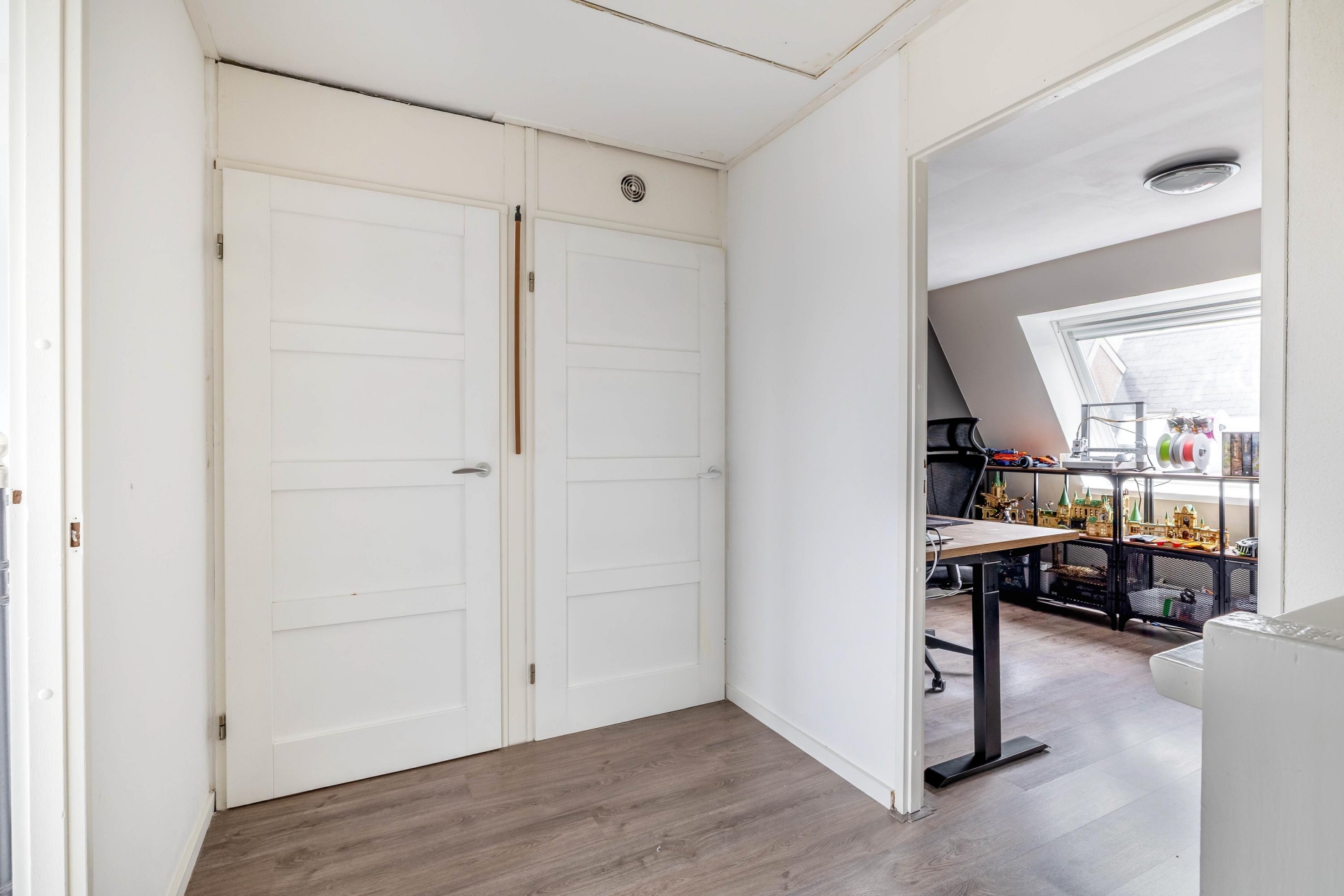 Vanaf de overloop is er toegang tot de kast met wasaansluiting, de kast met de Remeha CV-combiketel en de ruime vliering.