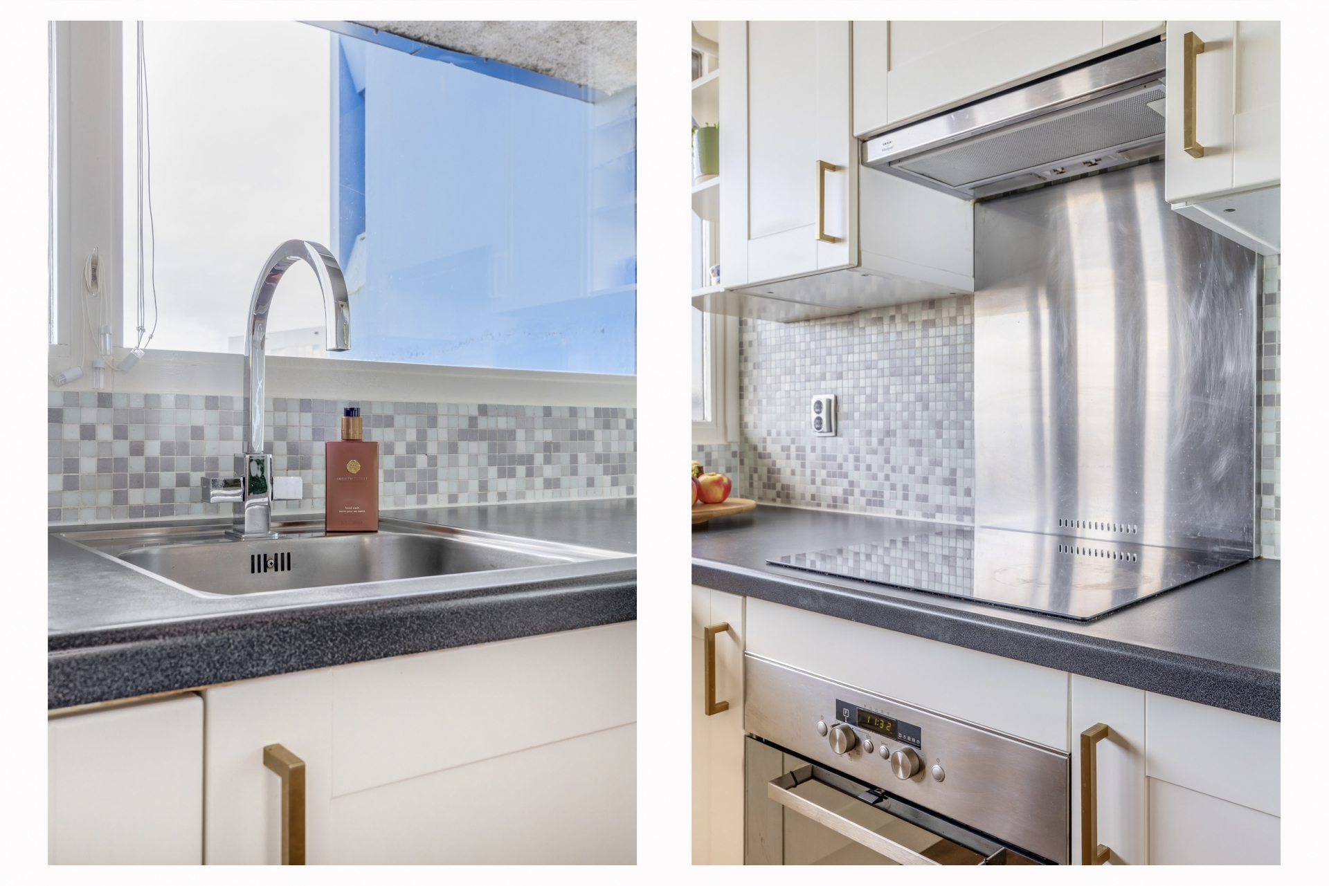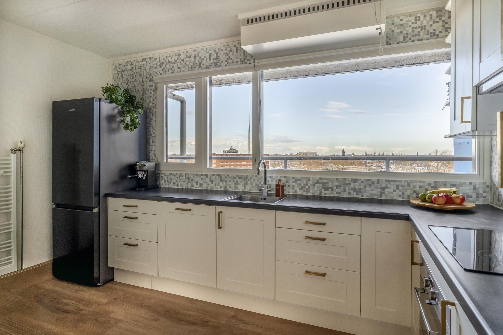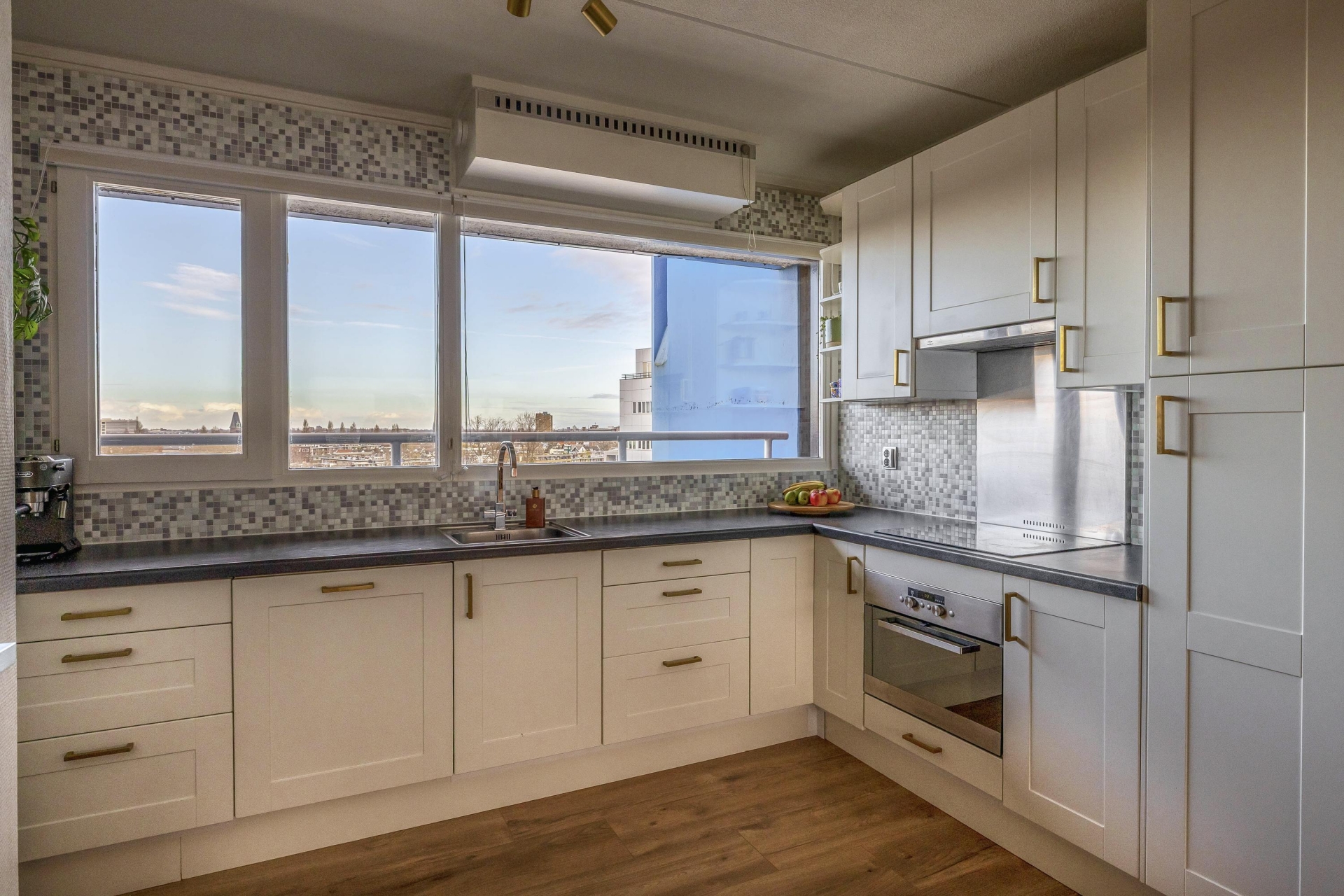 De open keuken aan de achterzijde sluit naadloos aan op het woongedeelte en is uitgevoerd in een frisse stijl met karakteristieke mozaïektegels. De L-vormige opstelling is niet alleen praktisch, maar ook voorzien van alle inbouwapparatuur: combi-oven/magnetron, koelkast, vriezer, vaatwasser en een inductiekookplaat. Vanuit hier kijk je weer uit over een heel ander, verrassend stukje stad. Extra handig is de aparte bergkast met aansluiting voor wasmachine en droger.