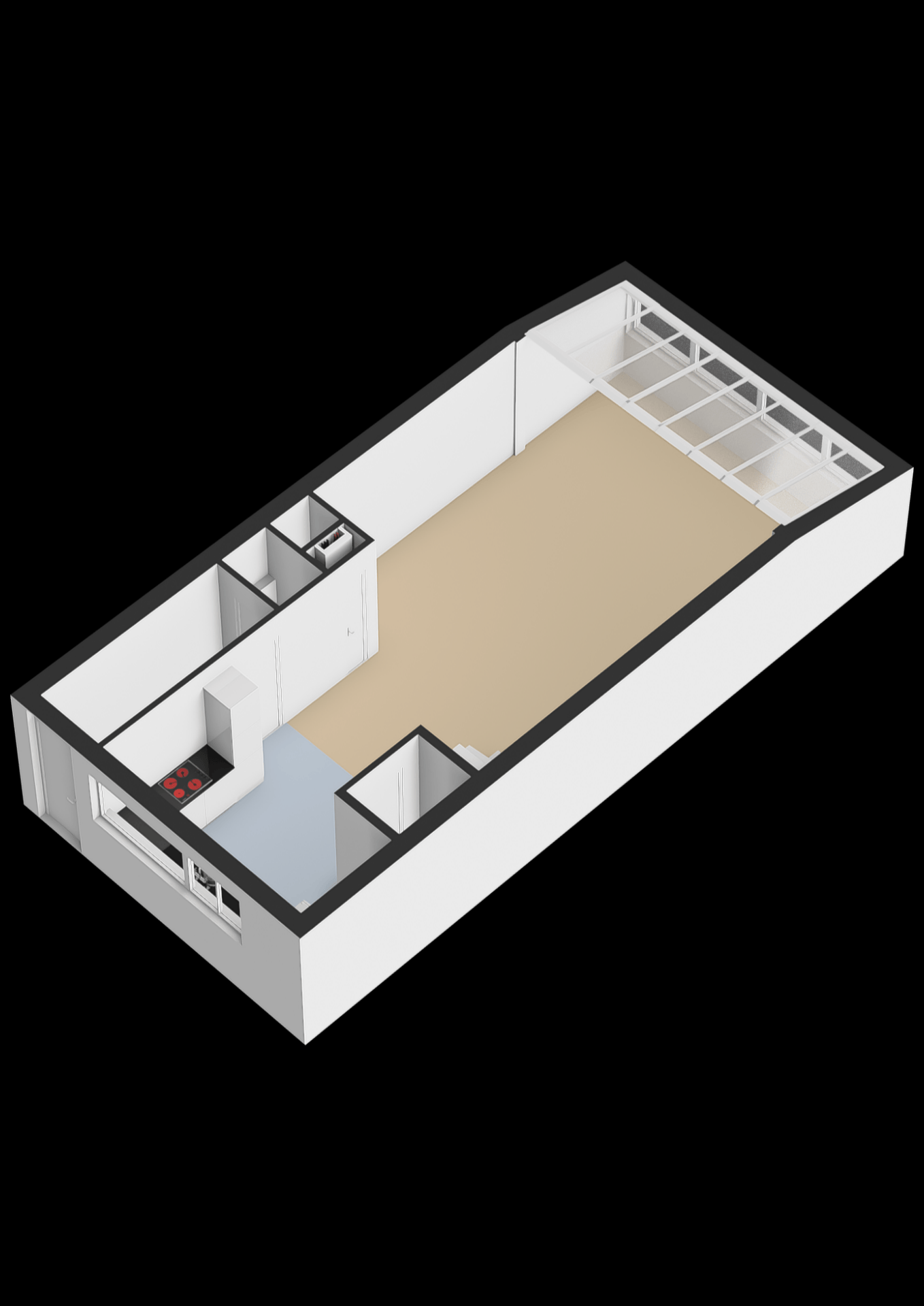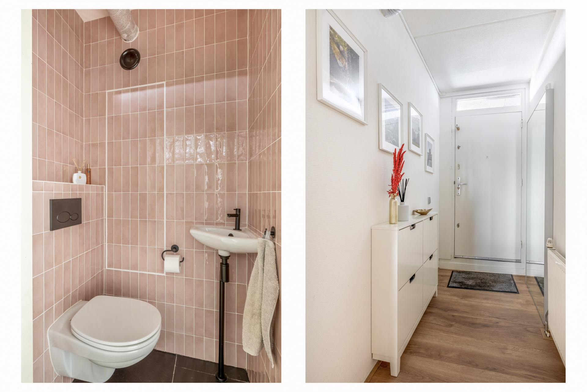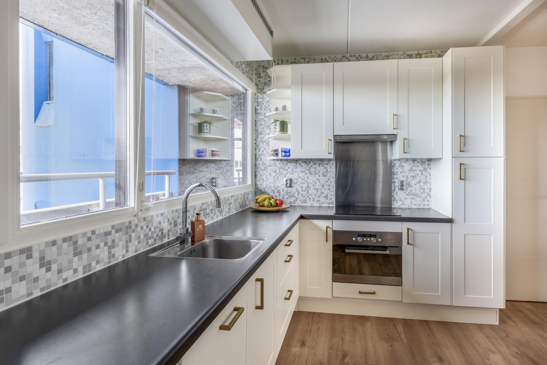 De open keuken aan de achterzijde sluit naadloos aan op het woongedeelte en is uitgevoerd in een frisse stijl met karakteristieke mozaïektegels. De L-vormige opstelling is niet alleen praktisch, maar ook voorzien van alle inbouwapparatuur: combi-oven/magnetron, koelkast, vriezer, vaatwasser en een inductiekookplaat. Vanuit hier kijk je weer uit over een heel ander, verrassend stukje stad. Extra handig is de aparte bergkast met aansluiting voor wasmachine en droger.