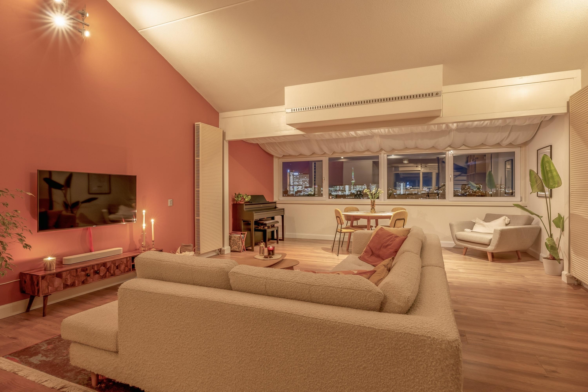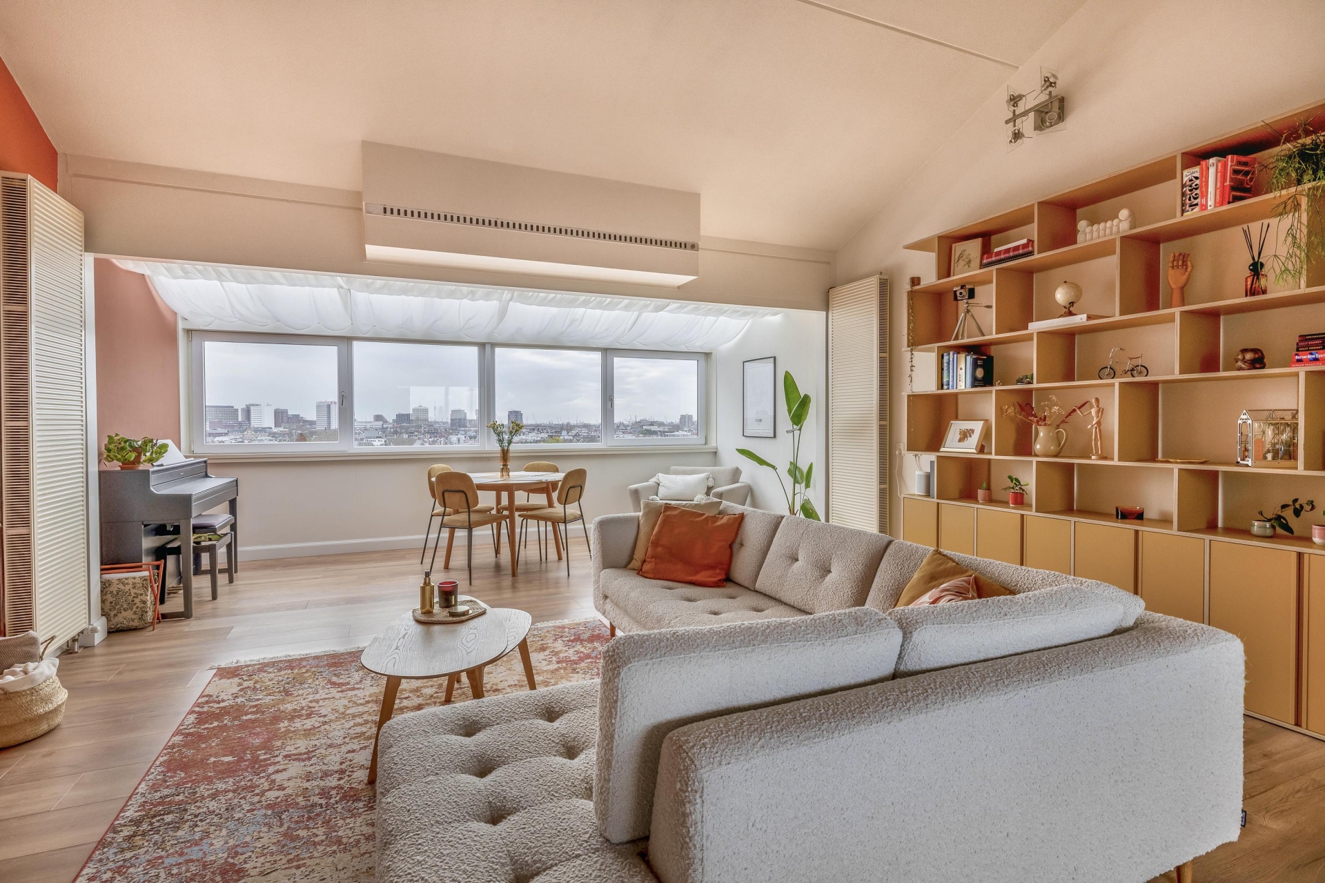 Op de negende etage kom je binnen in een appartement dat anders is dan anders. De living valt direct op door de speelse vide en het indrukwekkend hoge plafond. Dit zorgt niet alleen voor een bijzonder ruimtelijk gevoel, maar geeft ook een eigen karakter aan de ruimte. Dankzij grote raampartijen aan weerszijden geniet je hier de hele dag van prachtig licht én een fenomenaal uitzicht. Vanuit de zithoek kijk je uit op onder andere de Euromast, het Depot van Boijmans van Beuningen, de Erasmusbrug en de skyline van de stad, ofterwijl Rotterdam op z’n best! De living biedt daarnaast voldoende ruimte voor een comfortabele zithoek én een fijne eethoek.