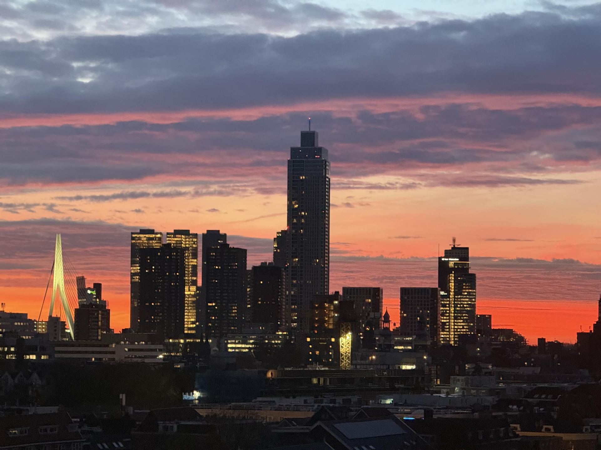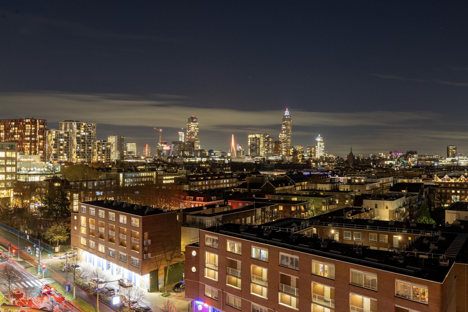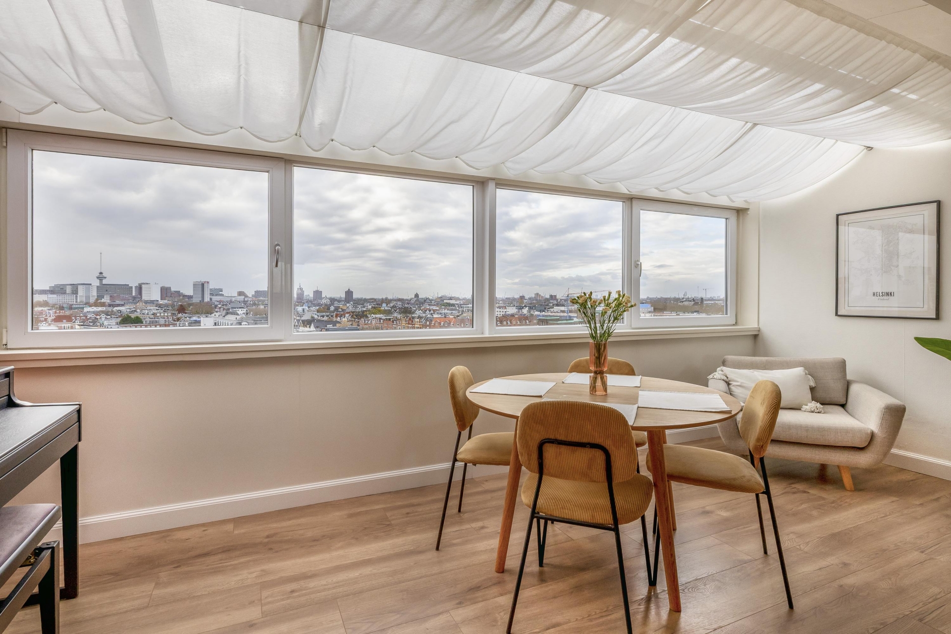 Uitzicht over de skyline van Rotterdam, speelse vide en een parkeerplek in de afgesloten garage.