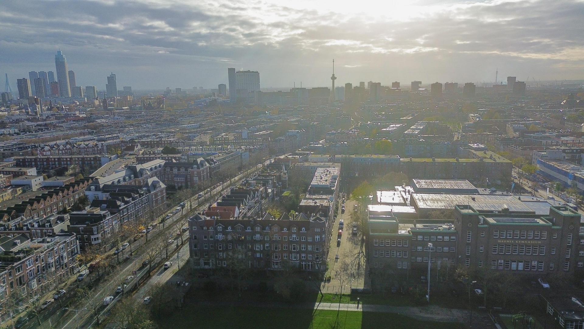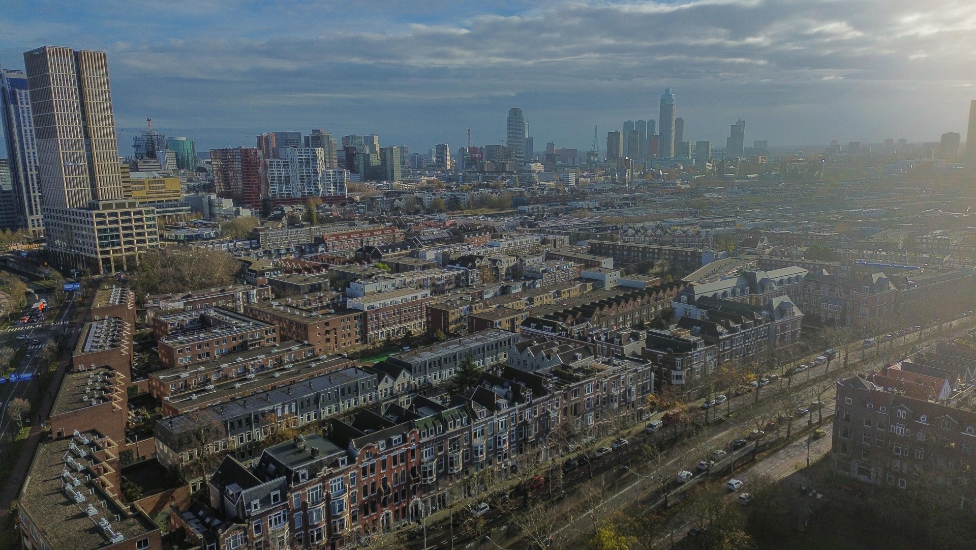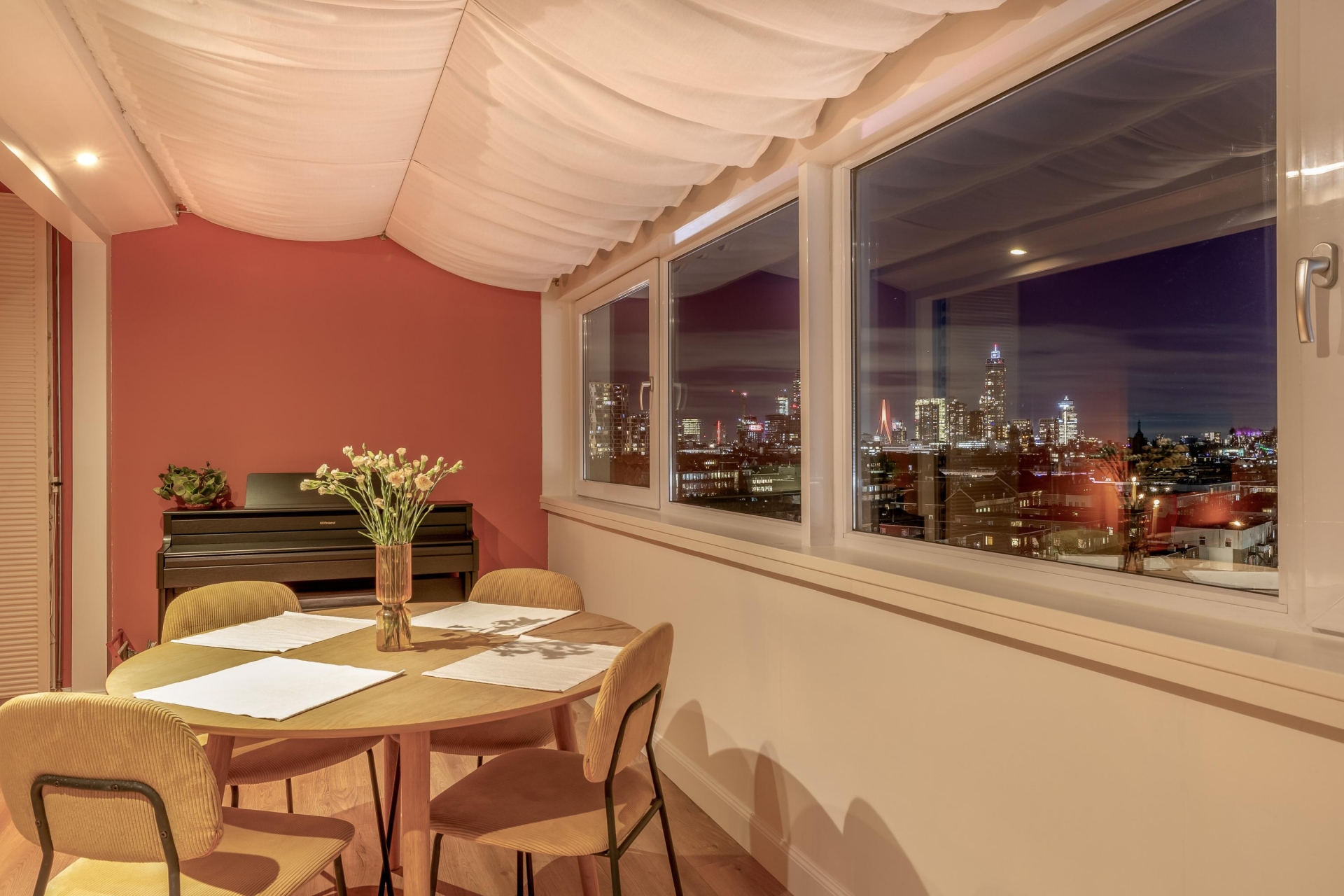 Uitzicht over de skyline van Rotterdam, speelse vide en een parkeerplek in de afgesloten garage.