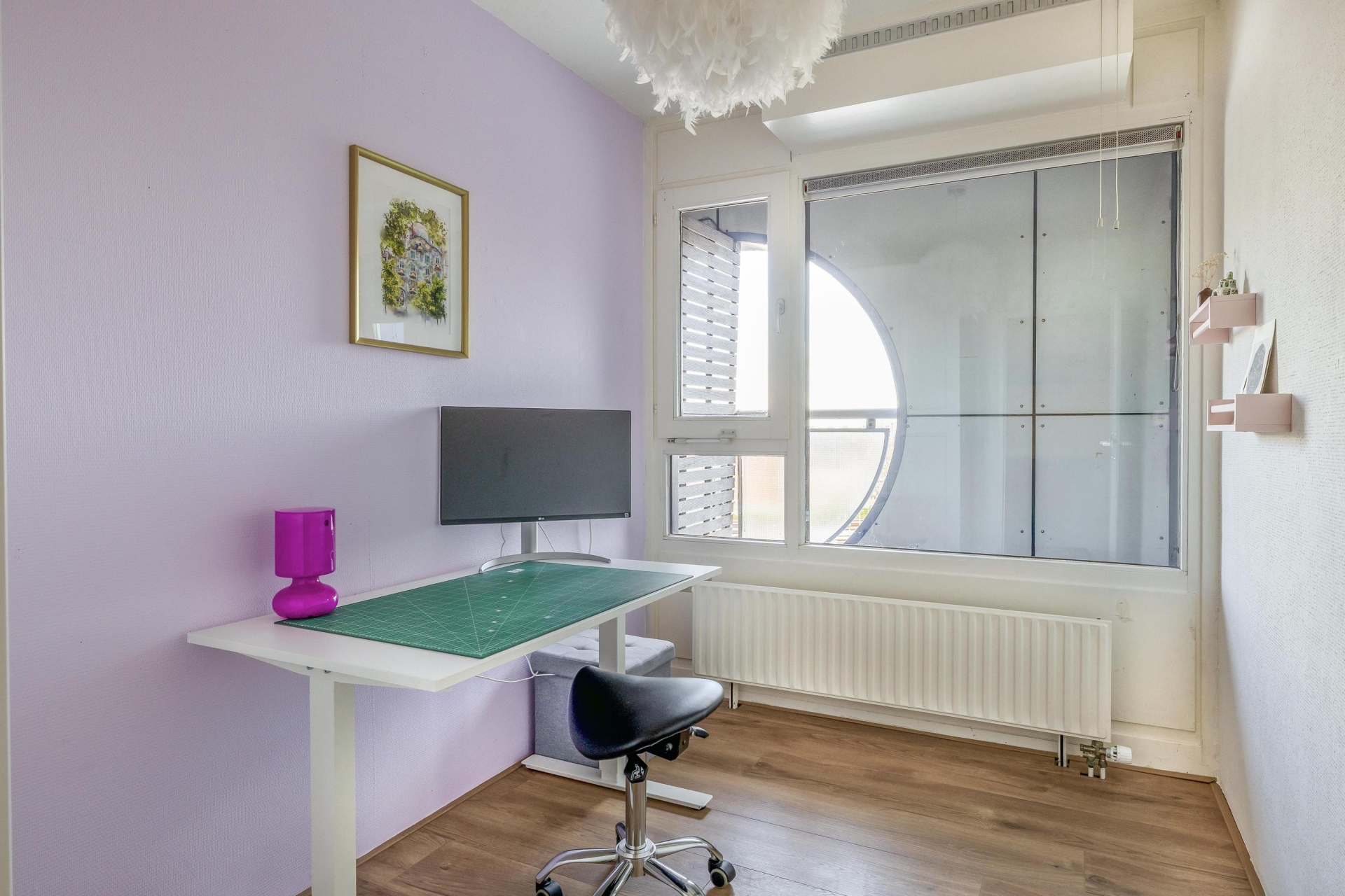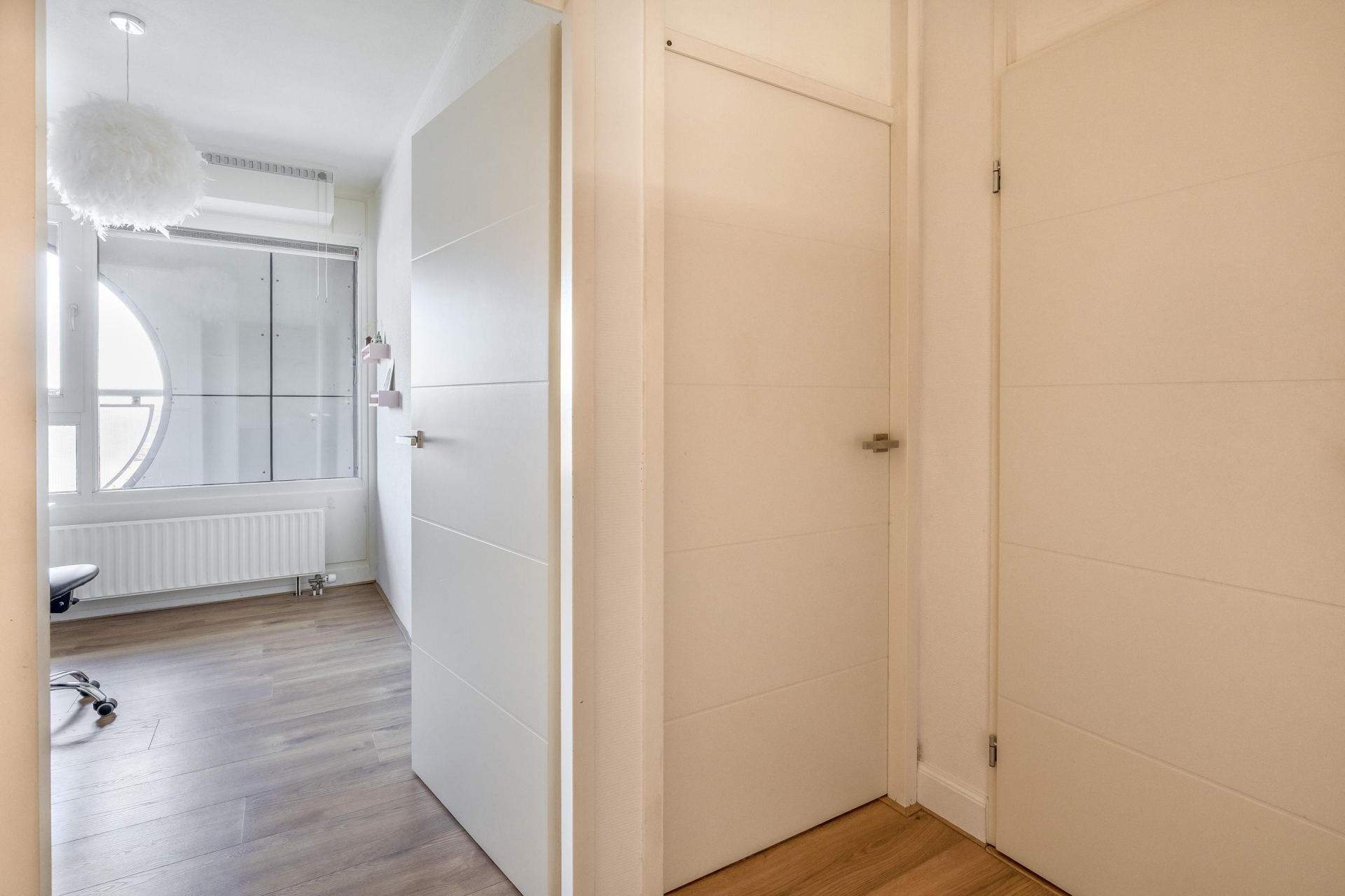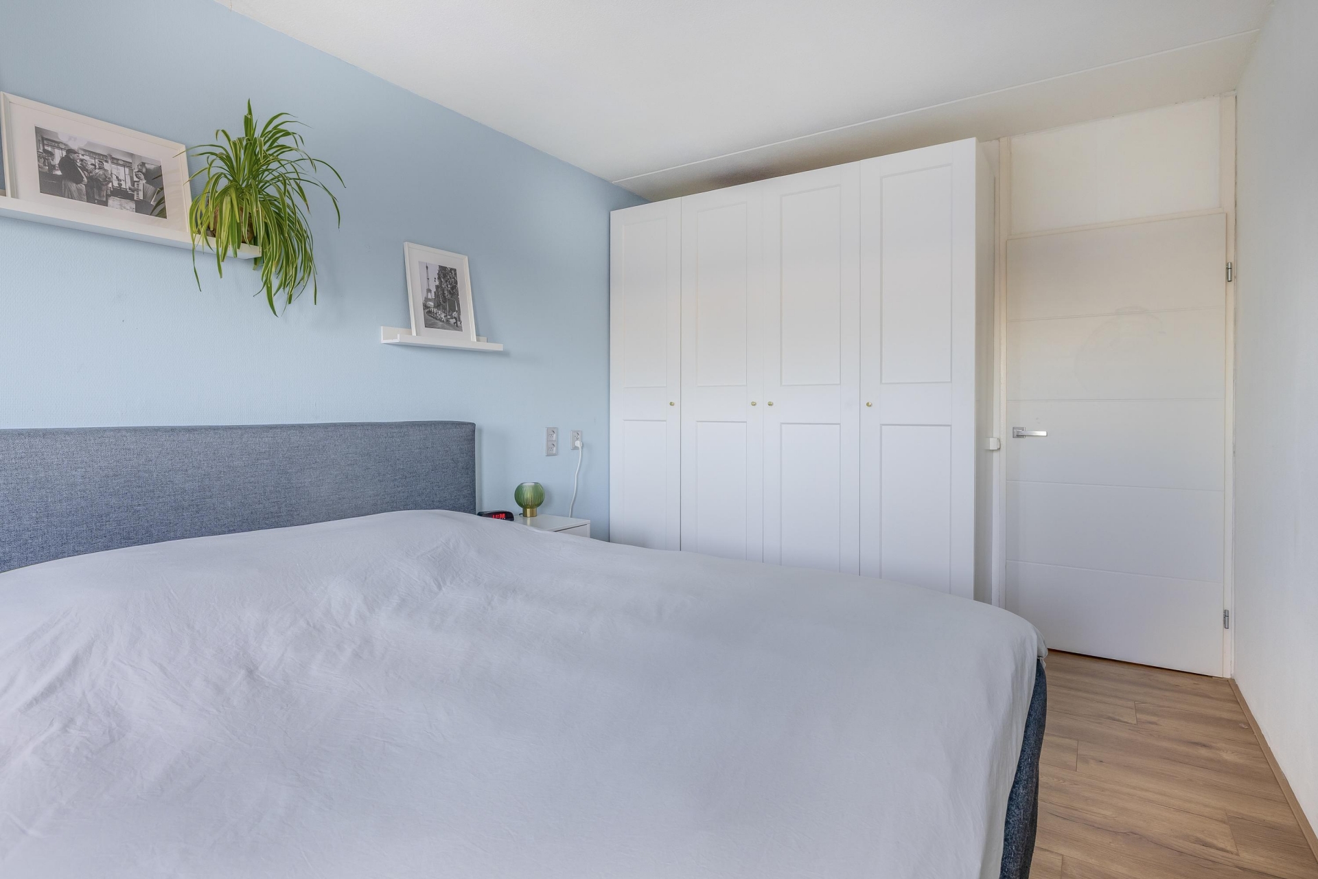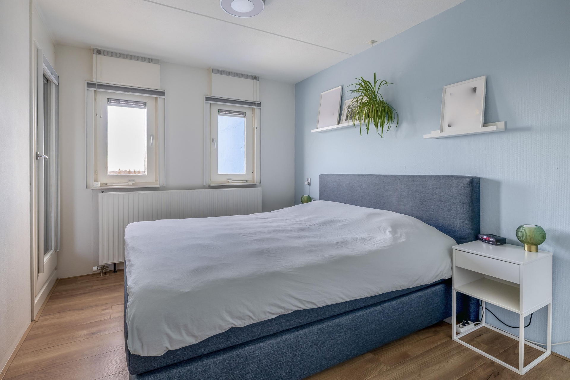 Via de open trap in de woonkamer bereik je de tiende etage. Hier vind je twee slaapkamers, slim gescheiden door de overloop. De hoofdslaapkamer is lekker ruim en biedt meer dan genoeg plek voor een kingsize bed en een royale kledingkast. Deze kamer heeft bovendien directe toegang tot het balkon, een heerlijke plek om even te ontsnappen aan de drukte van de stad. De tweede slaapkamer is wat compacter, maar perfect als thuiswerkplek, logeerkamer of babykamer.