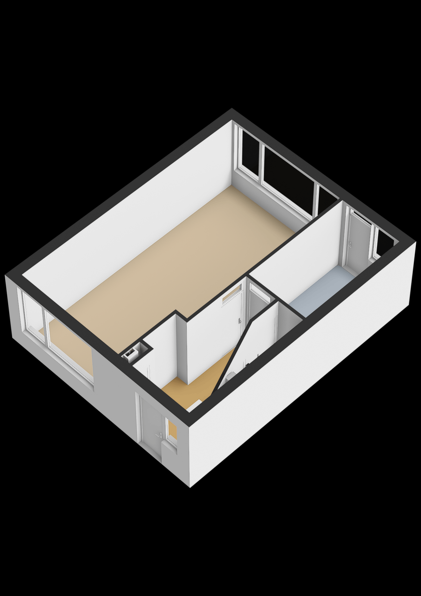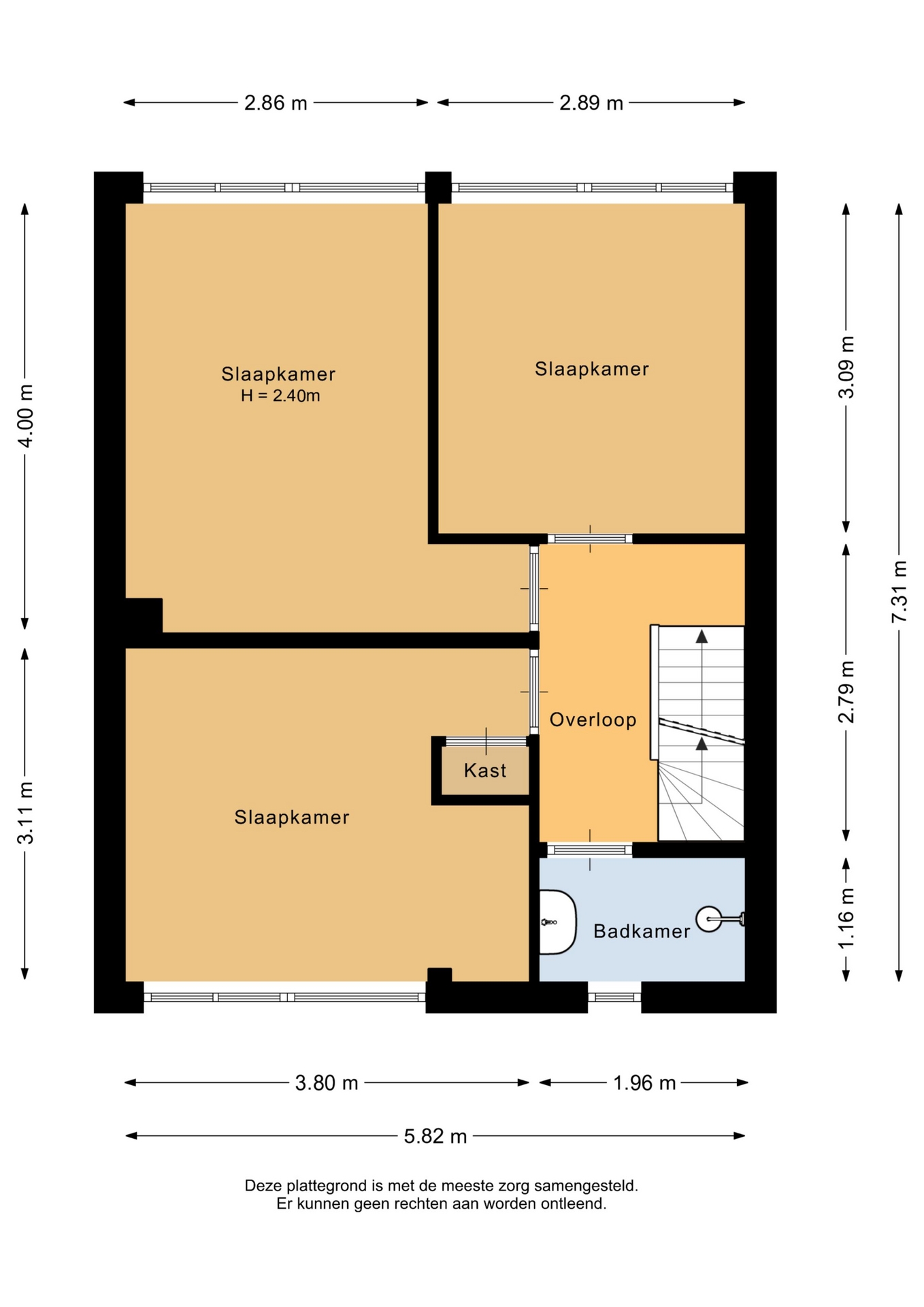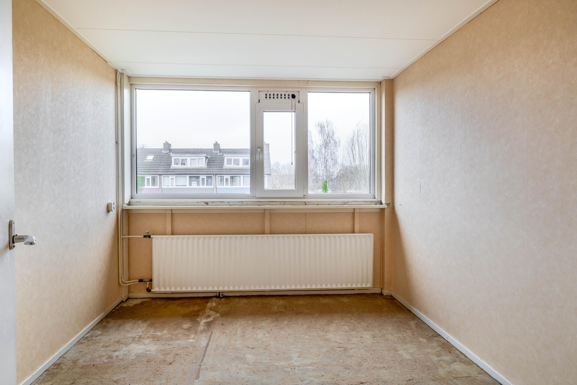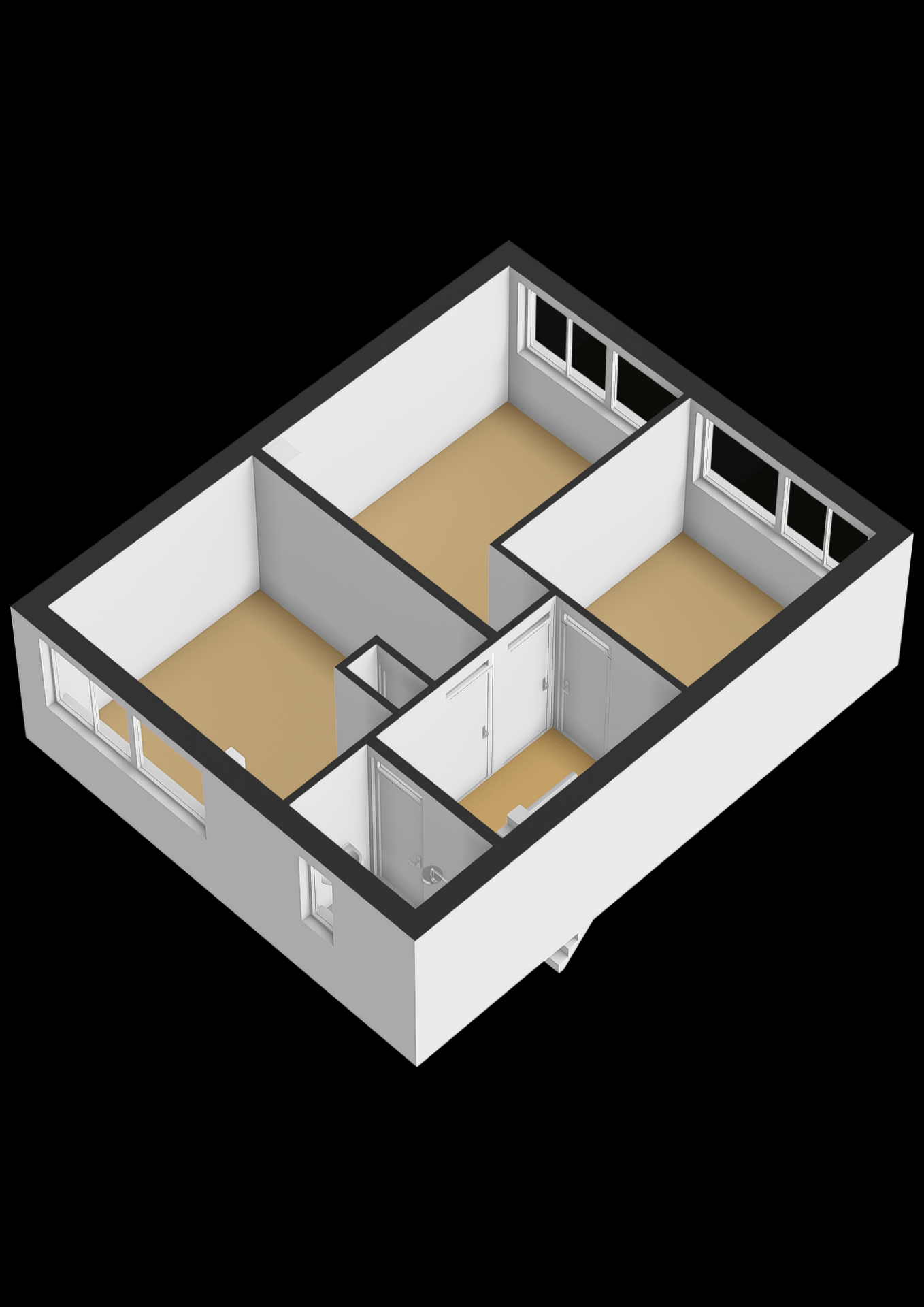 Hal; slaapkamer 1; slaapkamer 2; badkamer met douche en wastafel; 3e slaapkamer aan de voorzijde van de woning.