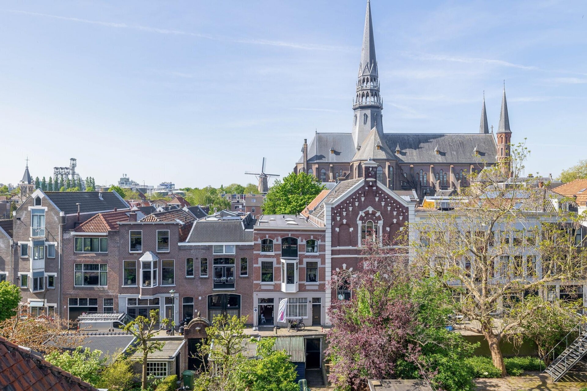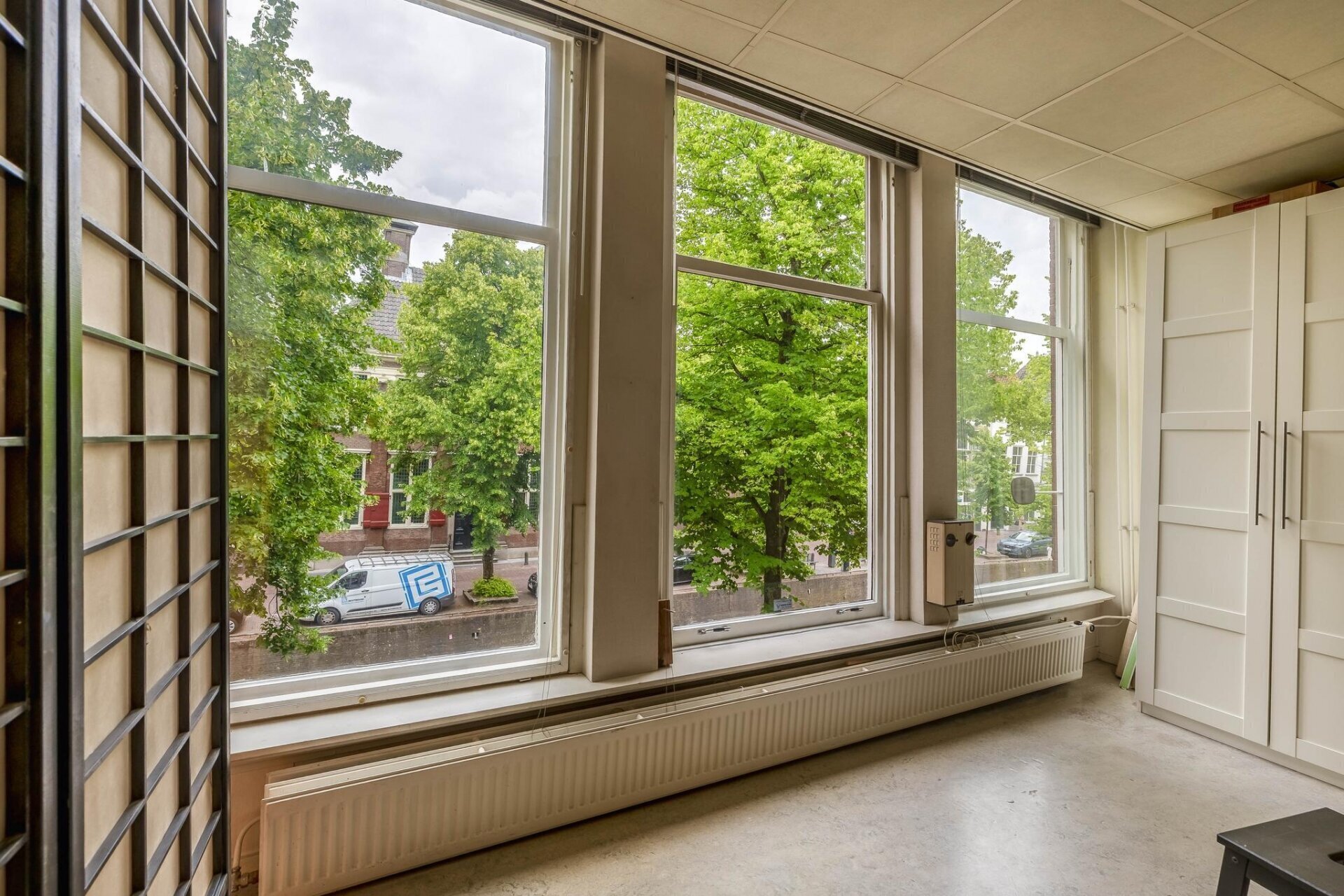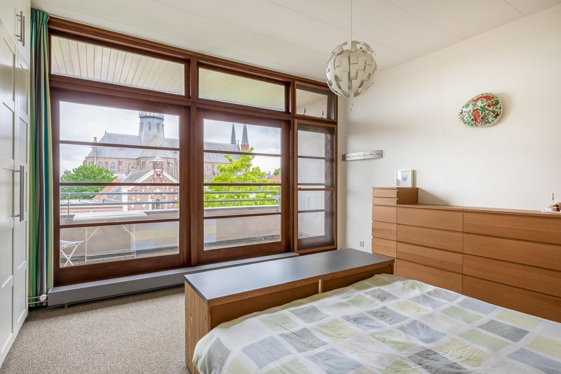 slaapkamer aan achterzijde met nieuwe achterpui met deur met terras en schitterend uitzicht over de historische panden van de Goudse binnenstad, slaapkamer met vaste kastenwand, airco, cv-ruimte en slaapkamer aan voorzijde met zicht op het museum en de St Janskerk