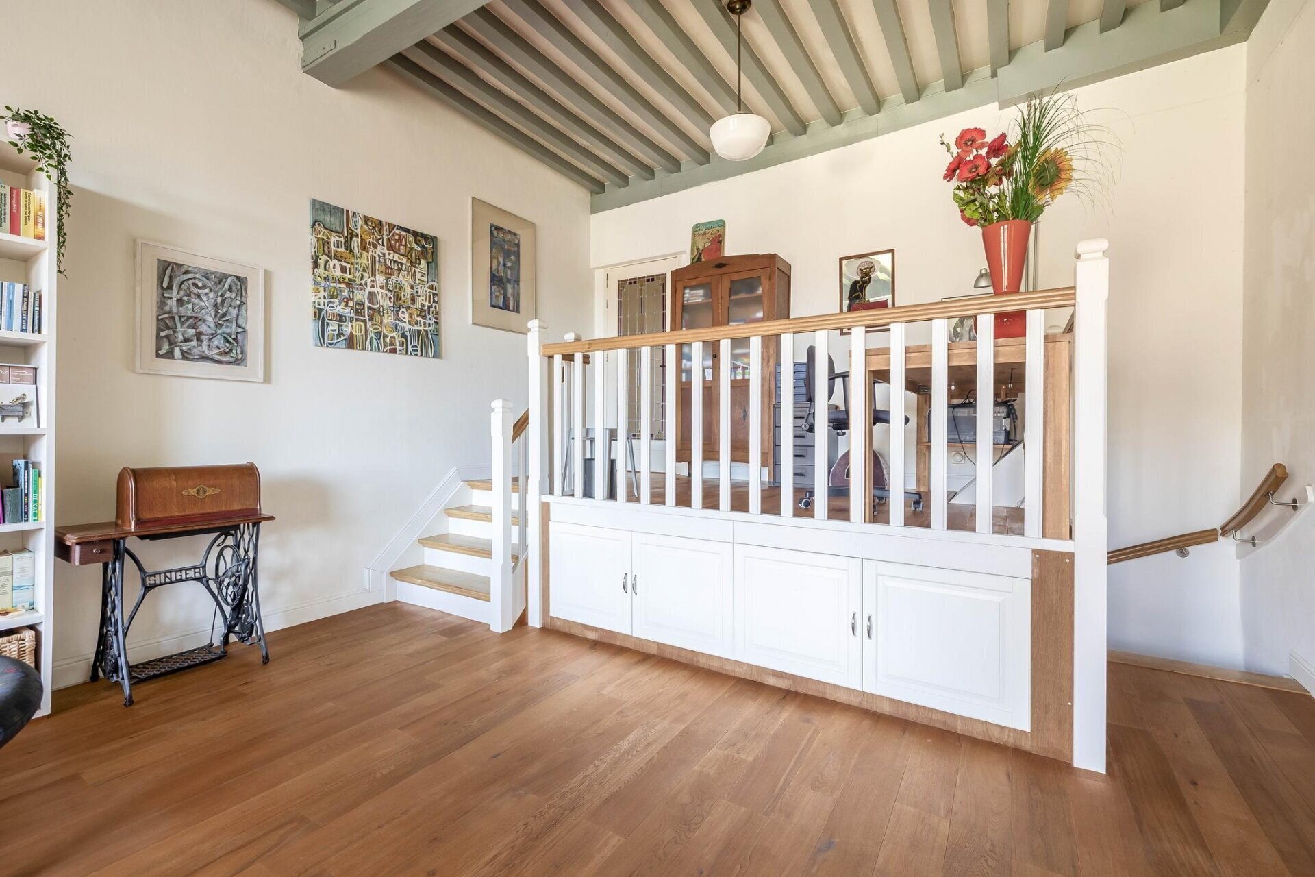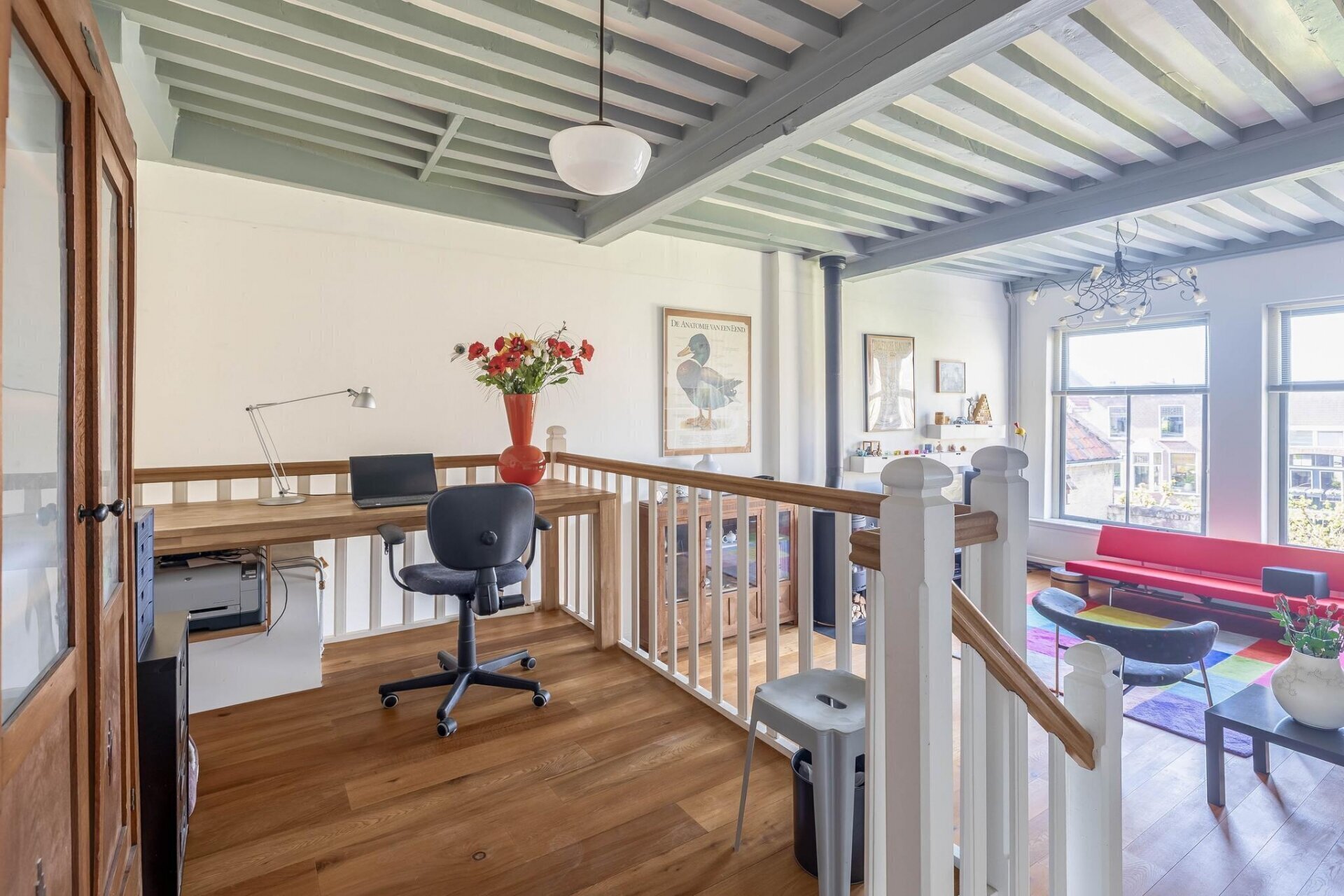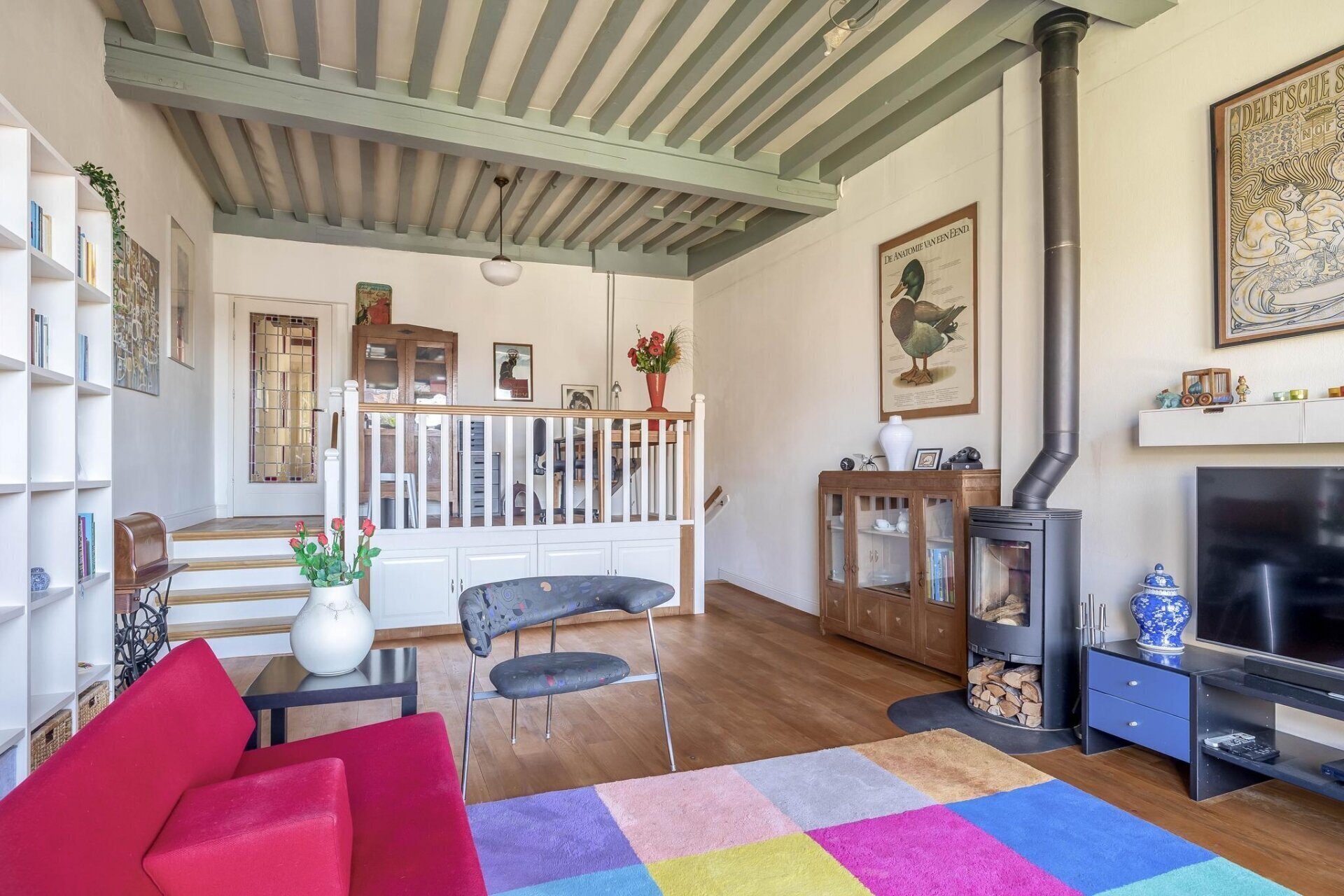 woonkamer met houten vloer, balkenplafond, HR houtkachel met buitenluchttoevoer, speelse verhoogde werkplek,