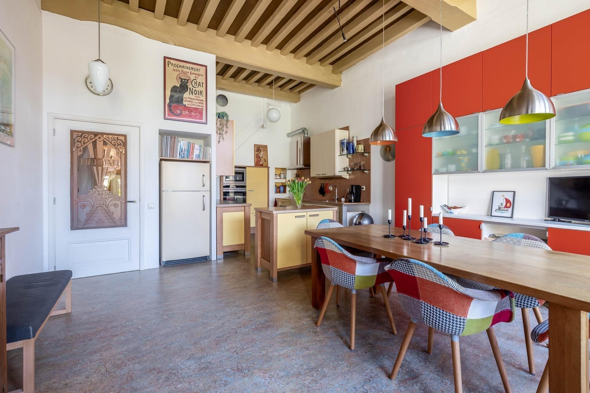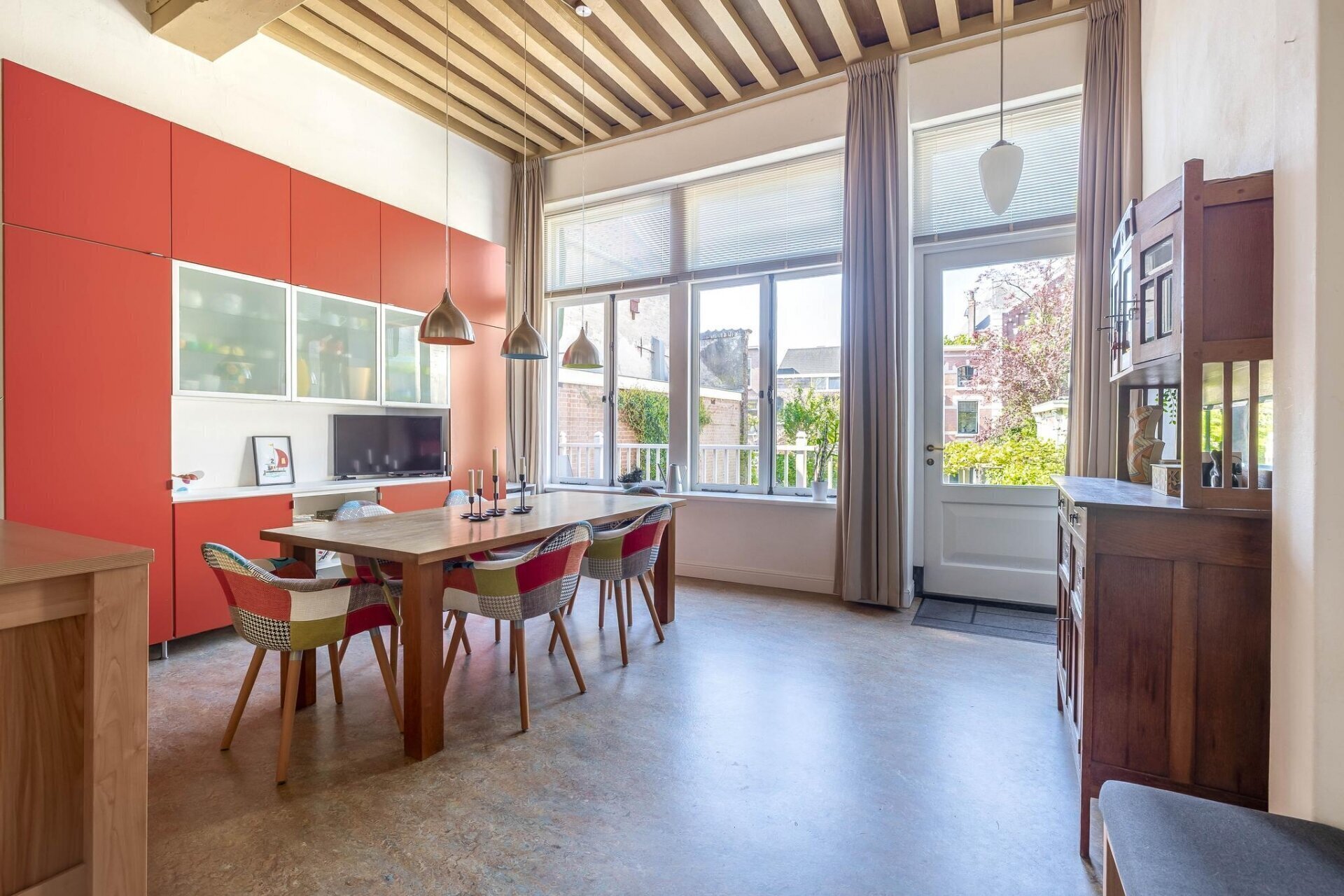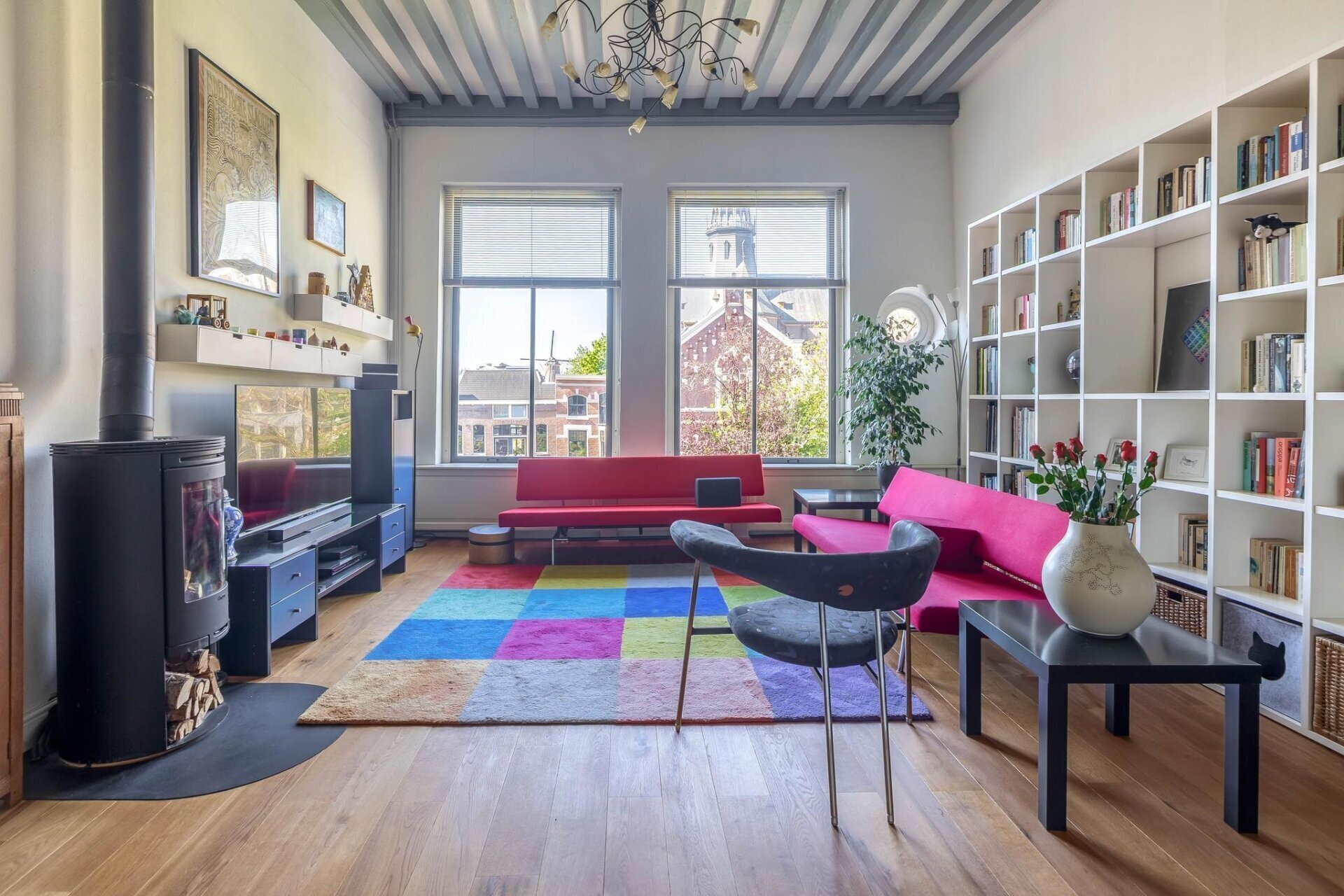 woonkamer met houten vloer, balkenplafond, HR houtkachel met buitenluchttoevoer, speelse verhoogde werkplek,