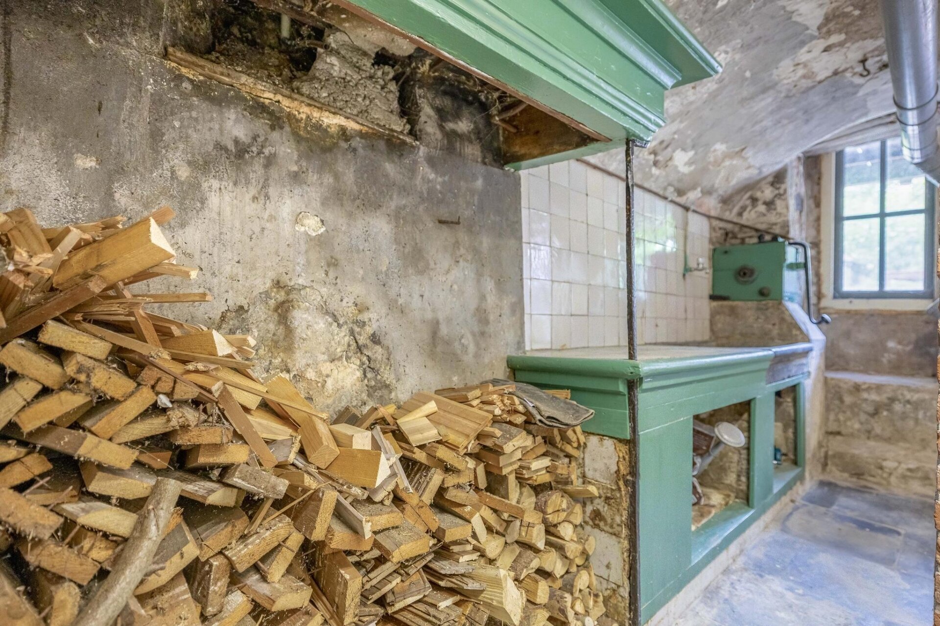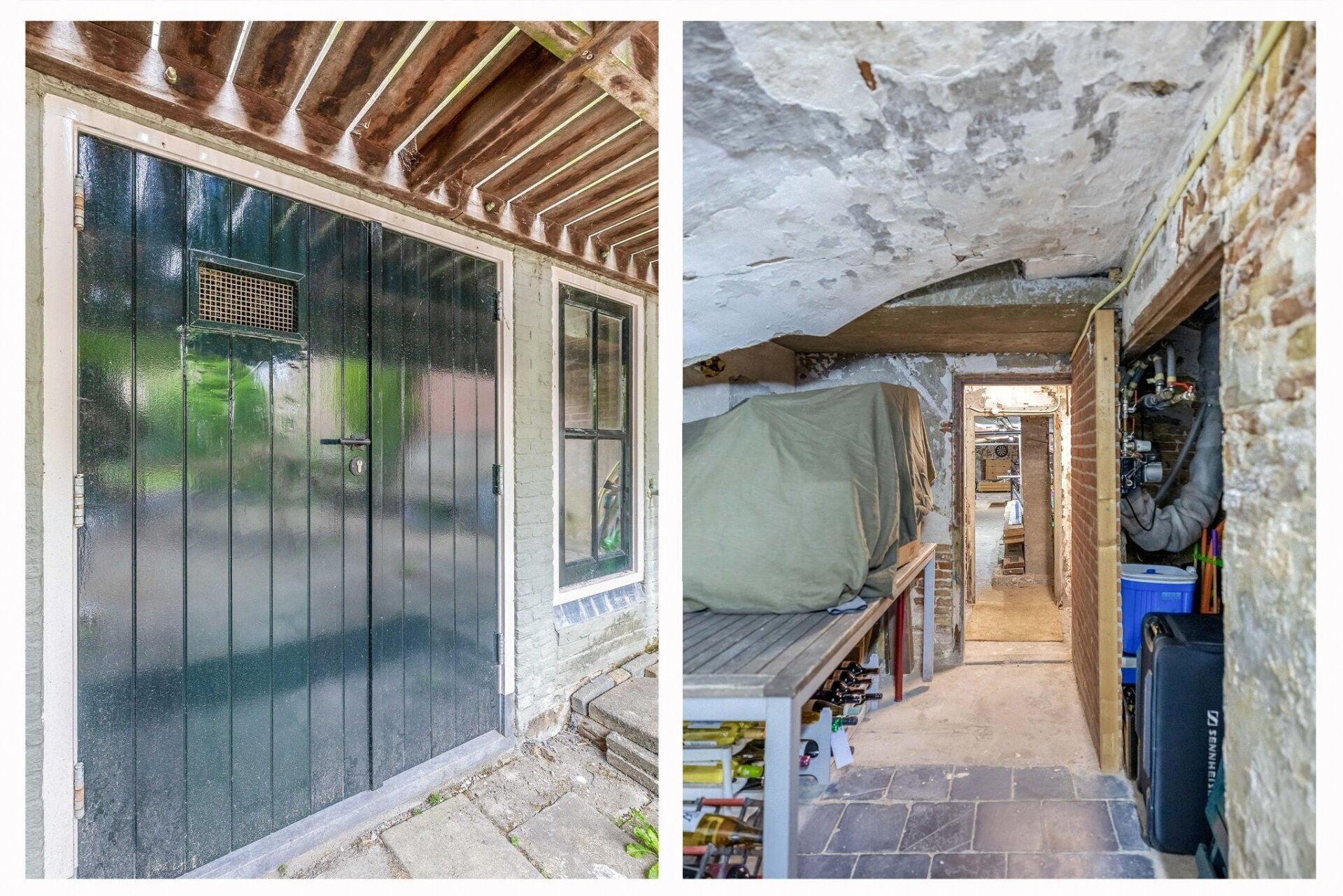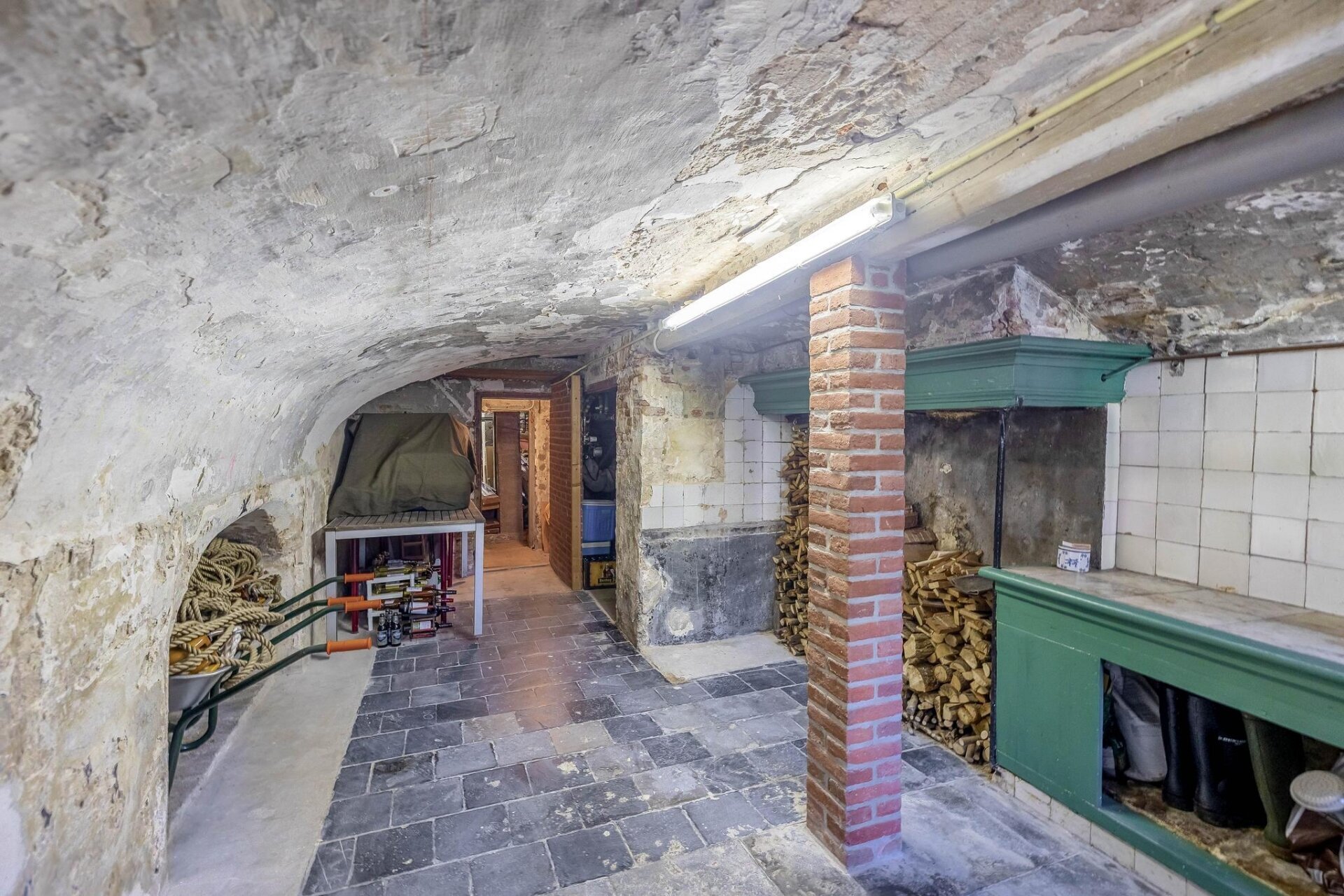 Kelder; Gemetseld tongewelf met authentieke keuken met hardstenen gootsteen, originele waterpomp en zeer veel bergruimte