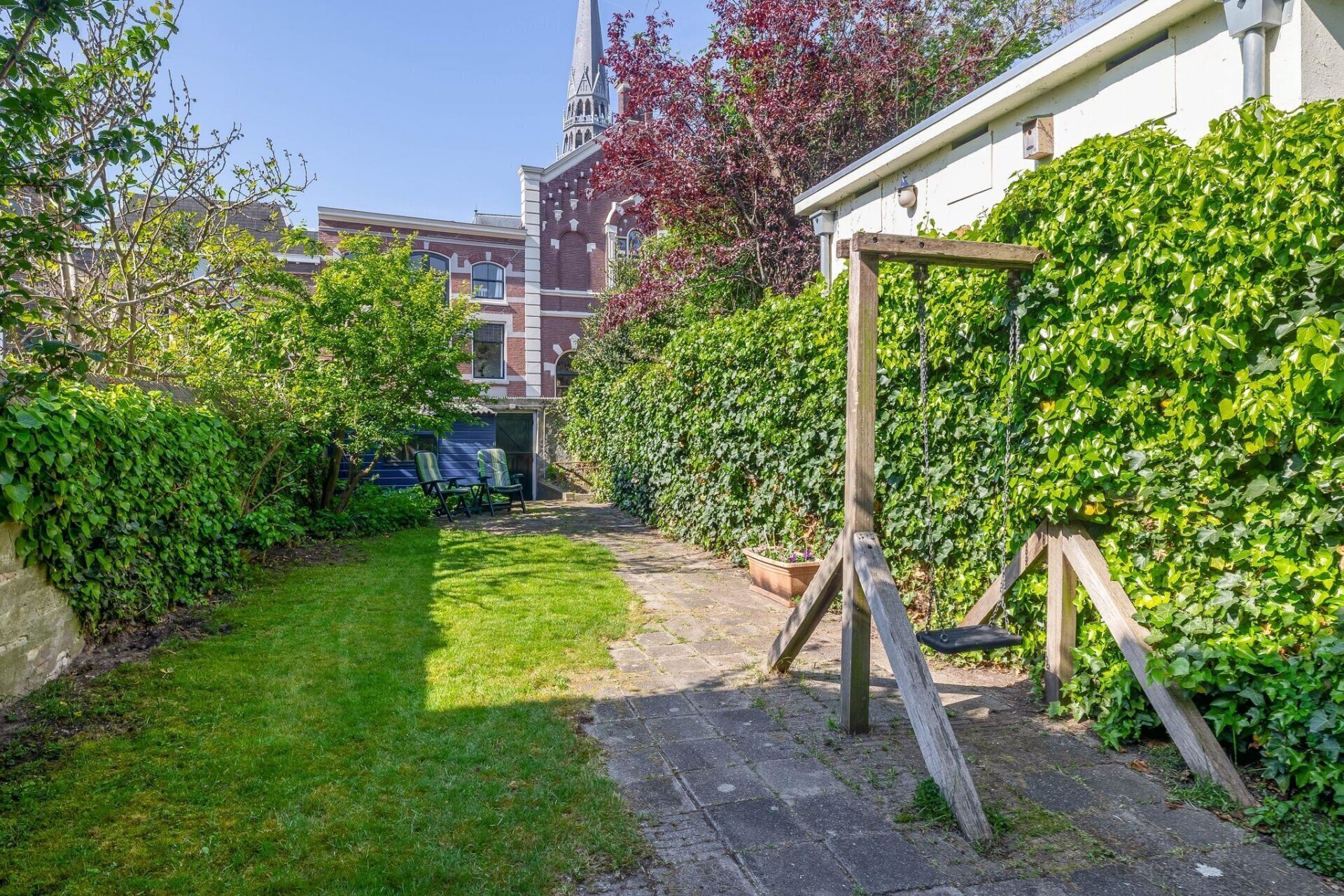HEERLIJK DIEPE TUIN OP HET ZUID-WESTEN MET ZICHT OP DE GOUWE KERK