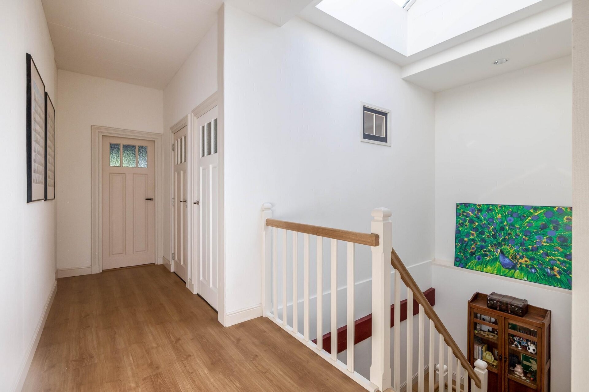 royale overloop met lichtstraat, laminaat, toiletruimte (met zwevend toilet en fonteintje), lichte badkamer met inloopdouche, ligbad, wastafel, ramen, geheel betegeld en designradiator