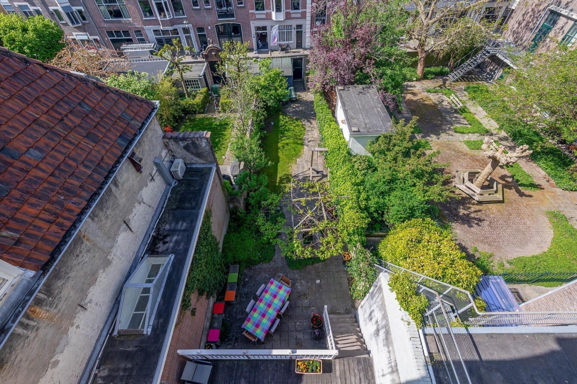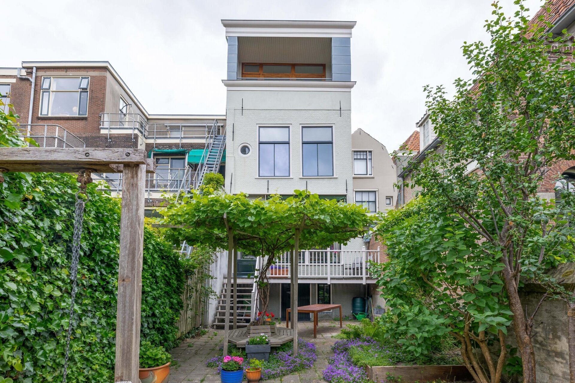 De zonnige en sfeervolle tuin is ruim 25 meter diep en heeft diverse terrassen, toegang tot de kelder, een schuur achter in de tuin, een houten toegangsbrug aan achterzijde vanuit de Peperstraat en een gerenoveerde stadsmuur. Vanuit de tuin, maar ook vanuit het huis heeft u fantastisch uitzicht over monumentaal Gouda.