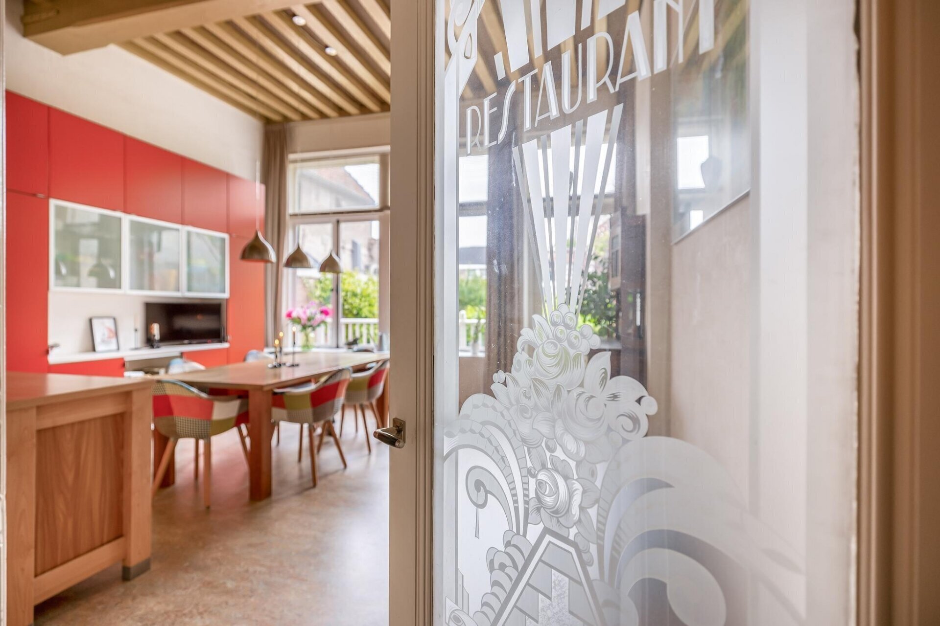winkelruimte met prachtig houten lijstenplafond, trappartij (geheel vernieuwd), atelier met vlizotrap naar bergvliering, toiletruimte, 2e trappartij (geheel vernieuwd), grote woonkeuken met schitterend uitzicht op de tuin, keukenopstelling met inductiekookplaat, afzuigkap, combi-oven, heteluchtoven, vaatwasser, keukenboiler, marmoleum met vloerverwarming en deur naar het terras op het zuid-westen.