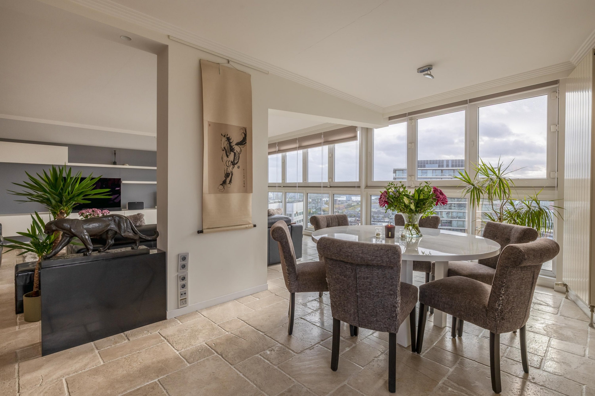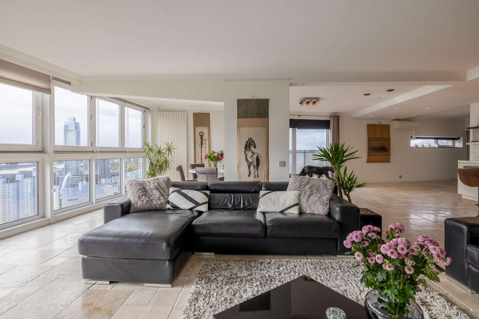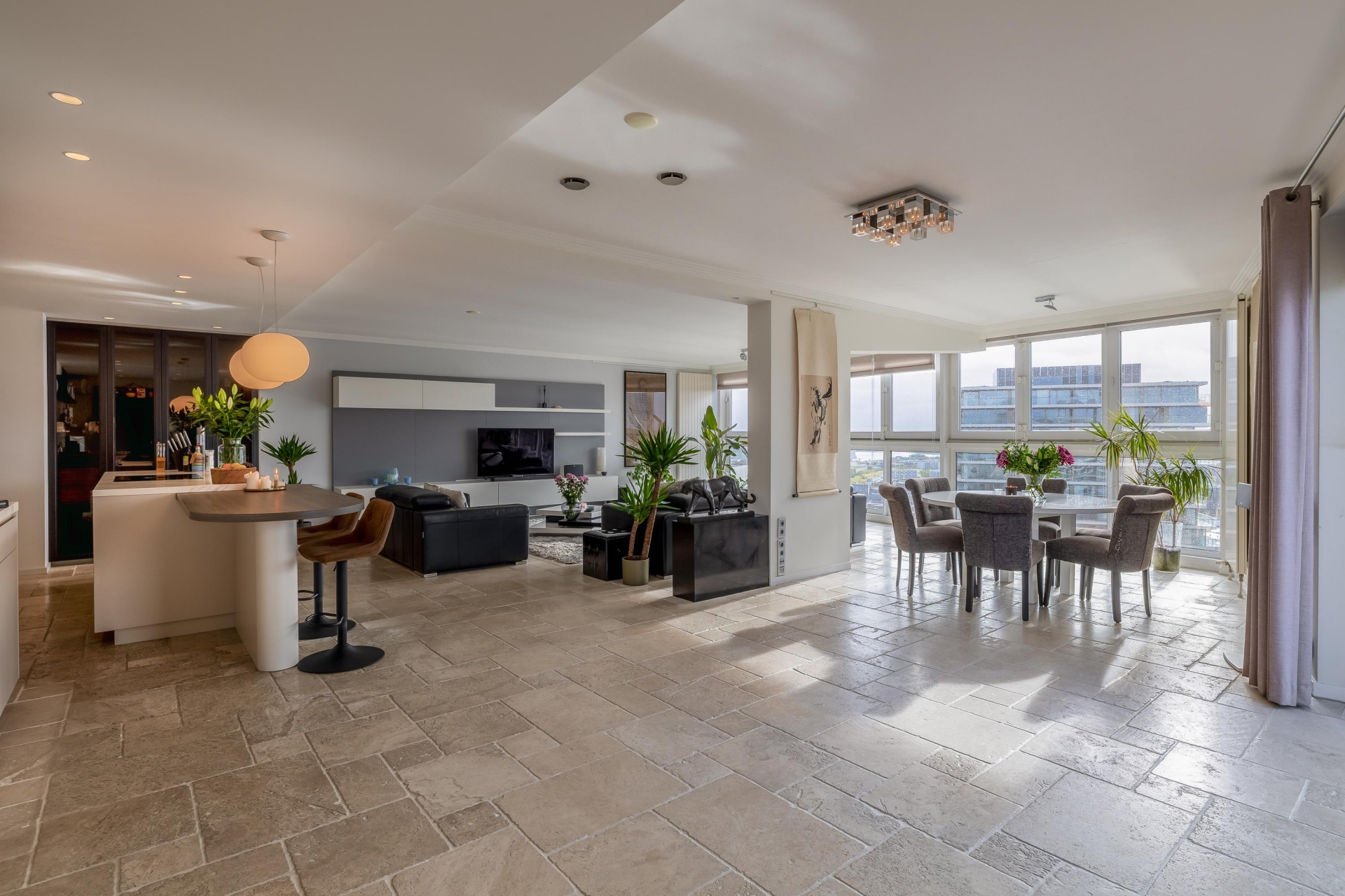 De royale living is een open, lichte ruimte die perfect aansluit bij het hoogwaardige karakter van het penthouse. De grote raampartijen rondom halen buiten naar binnen en zorgen voor een constante verbinding met de stad. De neutrale kleurstelling en de natuurstenen vloer geven het geheel een warme, luxe uitstraling.