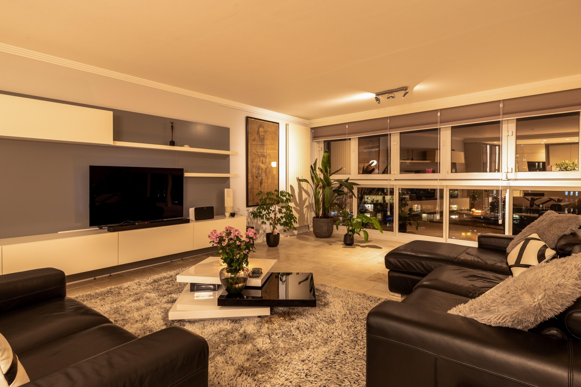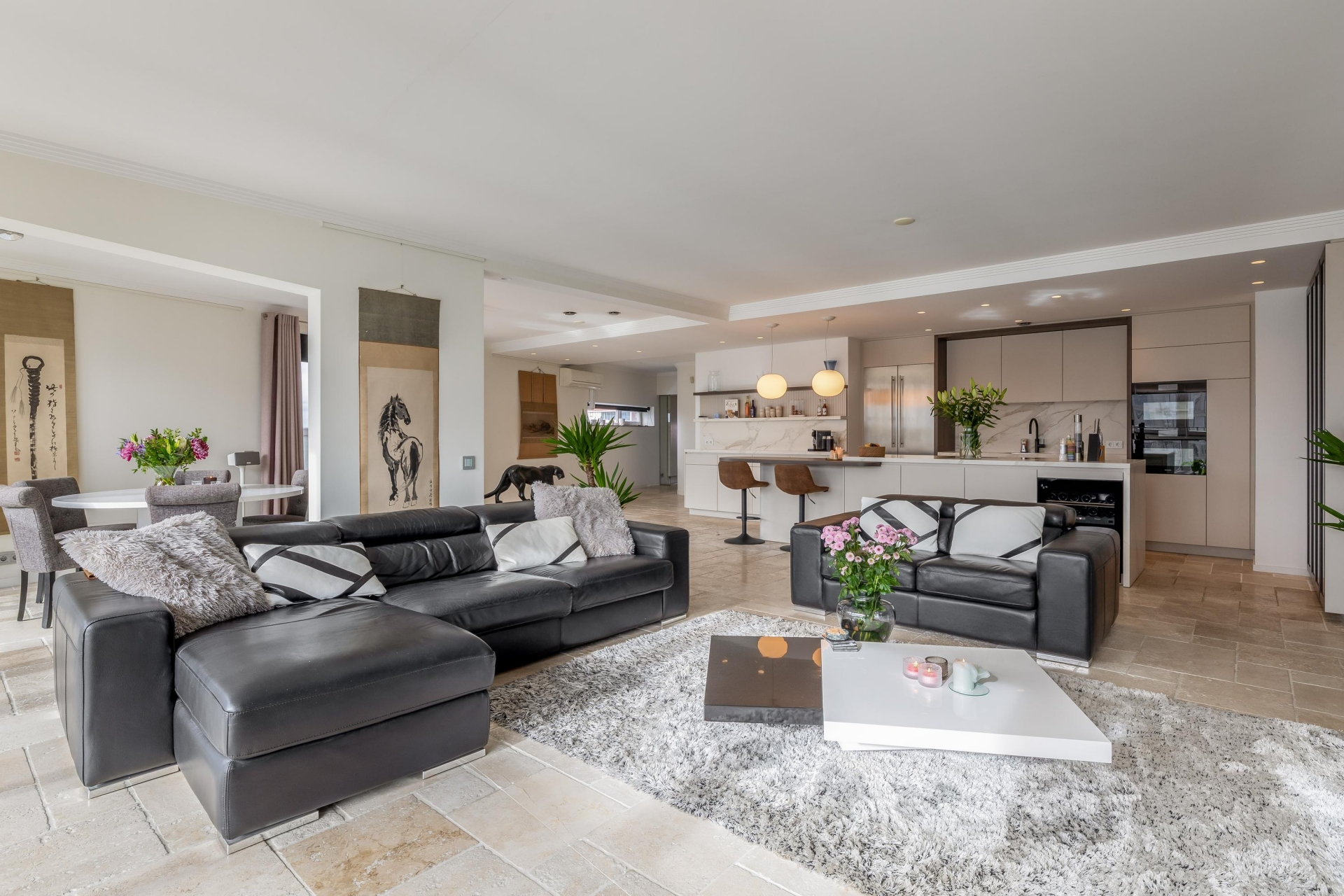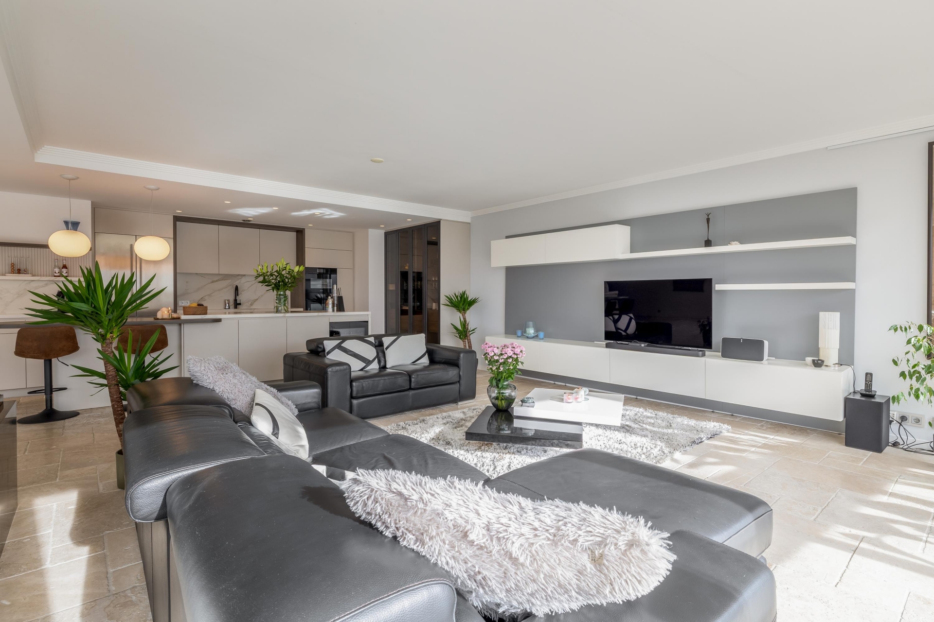 De royale living is een open, lichte ruimte die perfect aansluit bij het hoogwaardige karakter van het penthouse. De grote raampartijen rondom halen buiten naar binnen en zorgen voor een constante verbinding met de stad. De neutrale kleurstelling en de natuurstenen vloer geven het geheel een warme, luxe uitstraling.