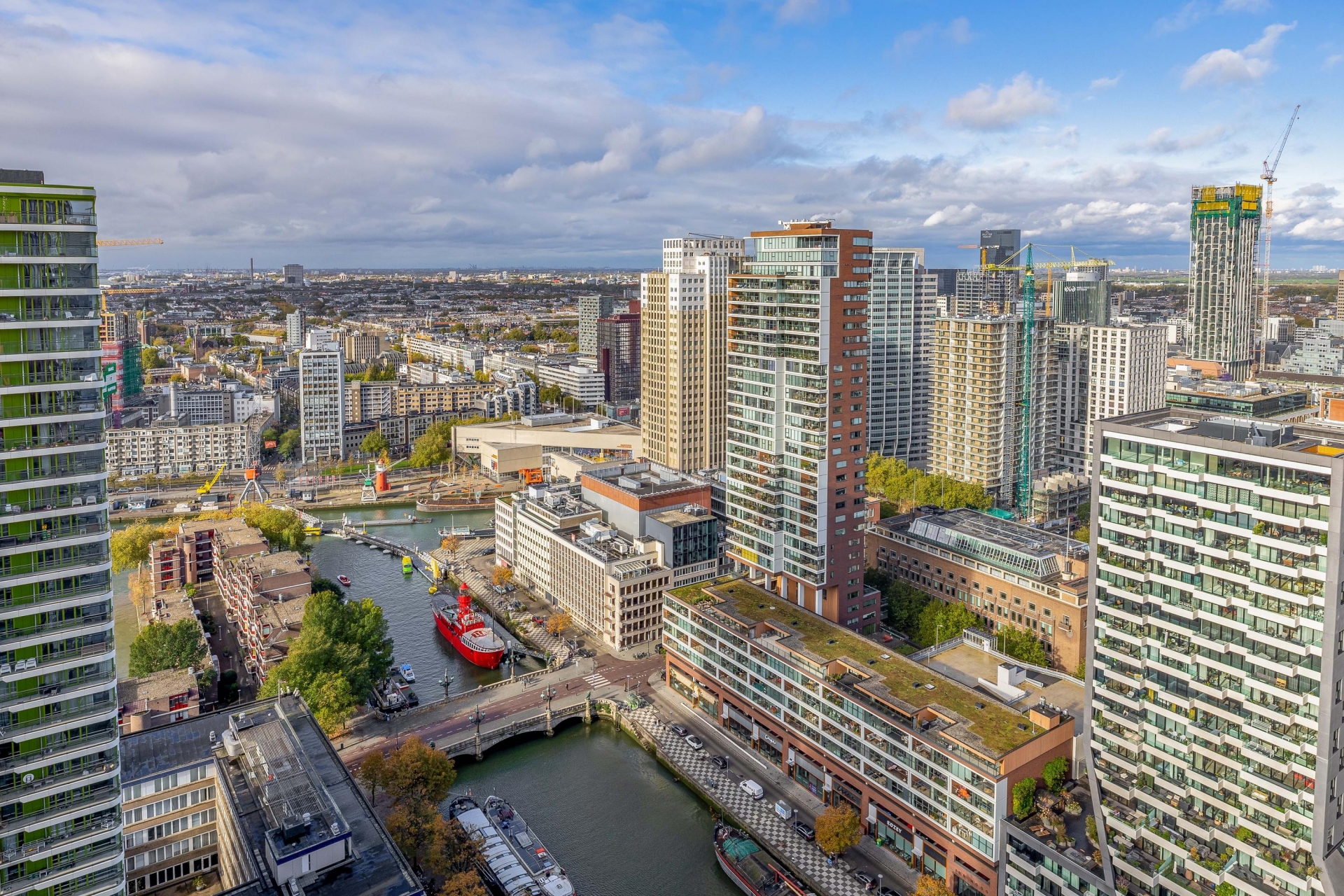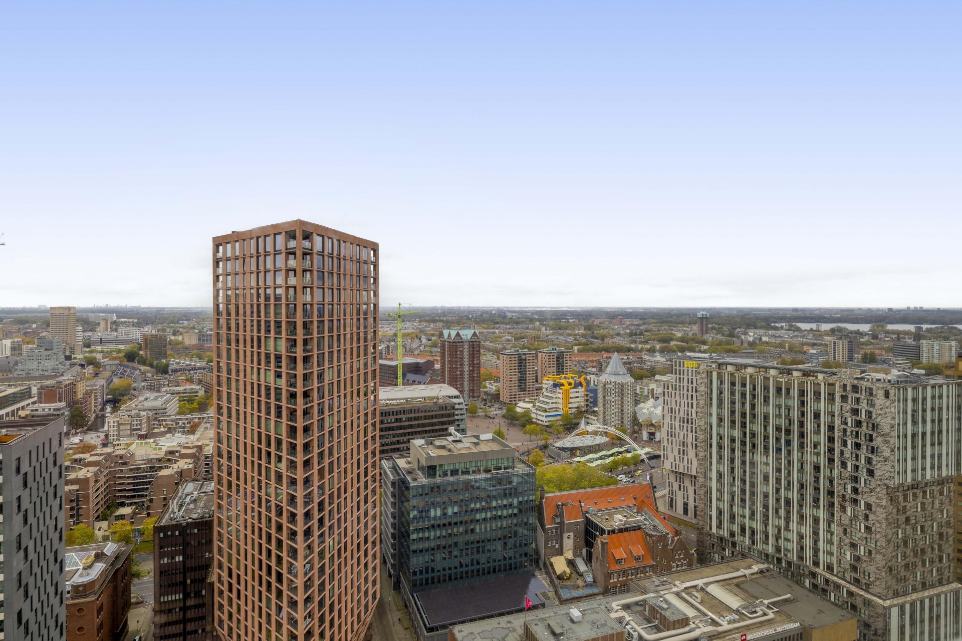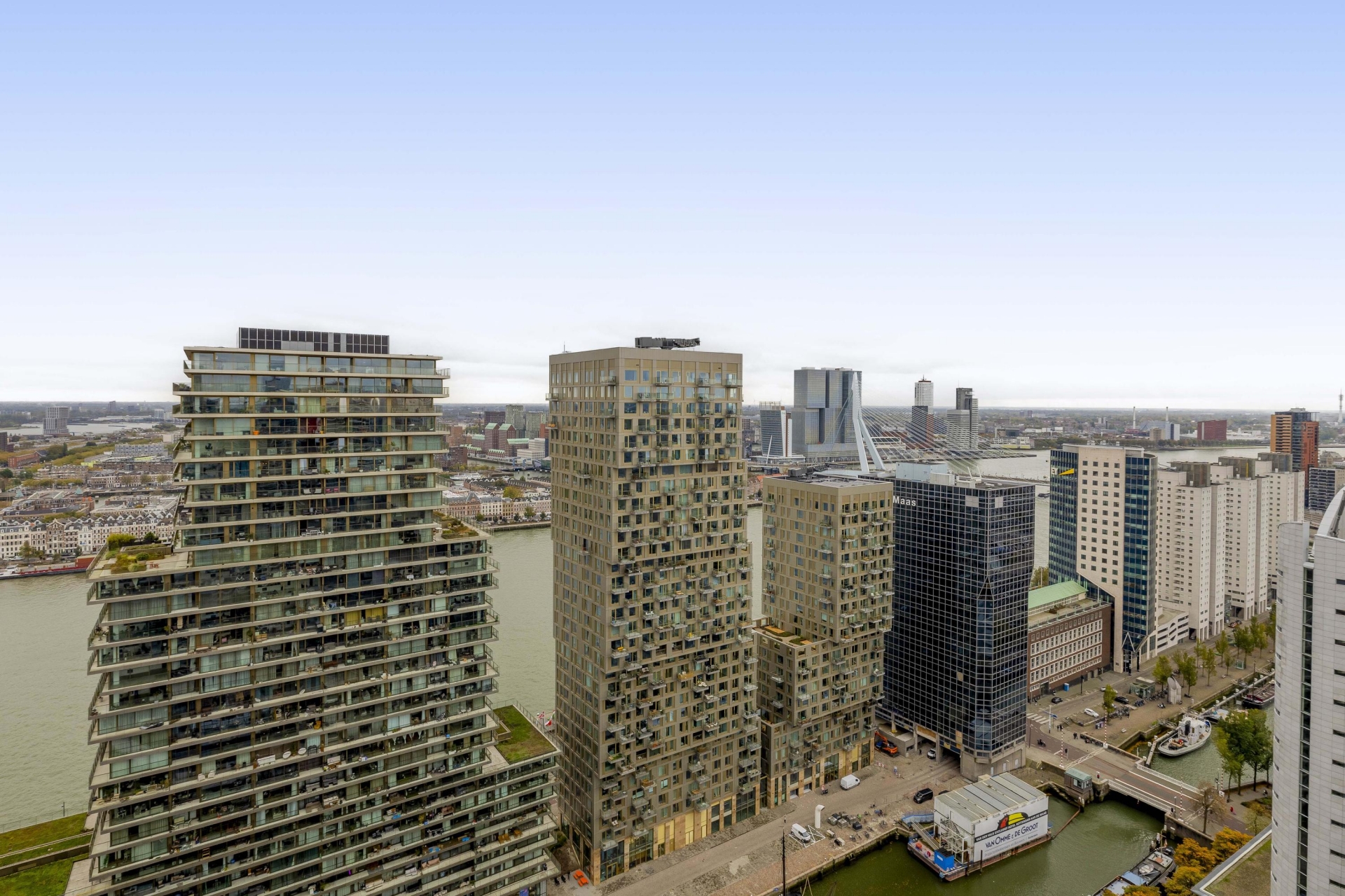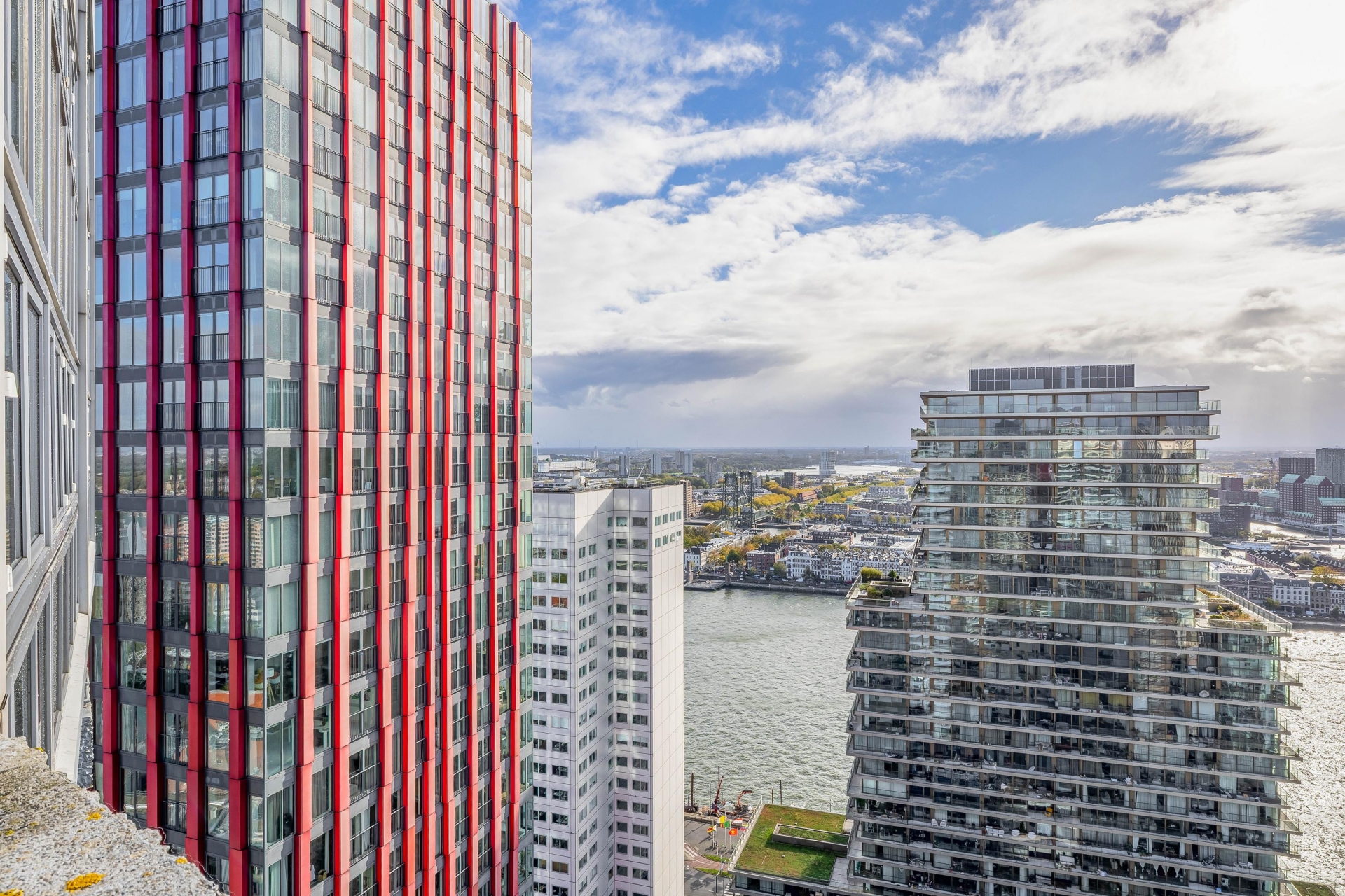 Binnenkomend via de centrale entree en lift kom je aan op de 34e verdieping. Daar opent zich een verrassend royale leefruimte, waar comfort en afwerking tot in detail samenkomen. Het panoramische uitzicht is werkelijk adembenemend; overdag kijk je uit over de stad en het water, 's avonds zorgen de duizenden lichtjes van Rotterdam voor een sfeer die nooit verveelt.
