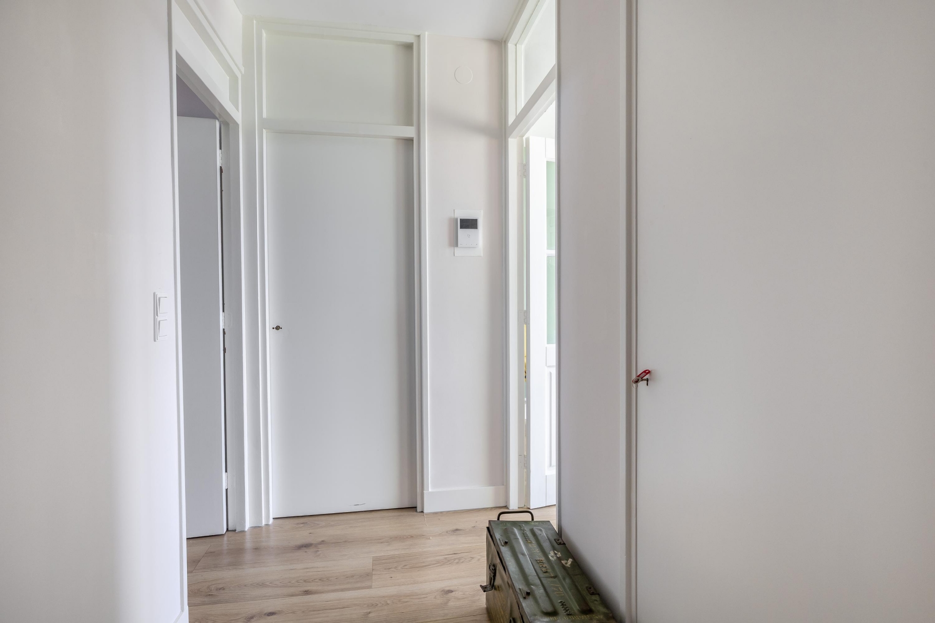 De woonkamer is zonder twijfel het hart van dit appartement. Dankzij de grote ramen en de noordwestelijke ligging geniet je hier tot laat van het daglicht en in de avond van sfeervolle zonsondergangen boven de stad. Het uitzicht over het groen van Schiebroek en waterpartijen maakt dit een plek waar je elke dag opnieuw van geniet. De ruimte is strak afgewerkt met een moderne vloer en rustige kleuren.