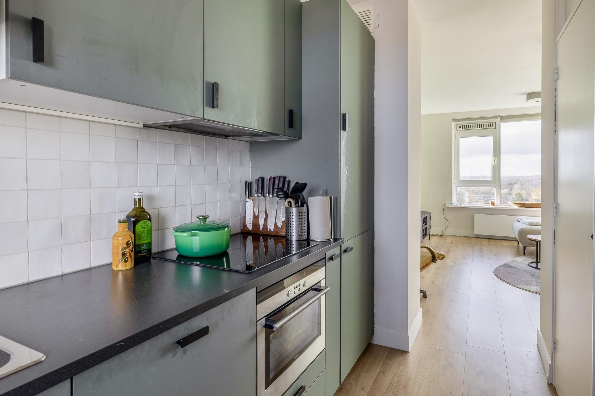 Aangrenzend vind je de semi-afgesloten keuken, uitgevoerd in een stijlvolle kleur, wederom met prachtig uitzicht. Hier kook je met plezier terwijl je over Rotterdam uitkijkt.