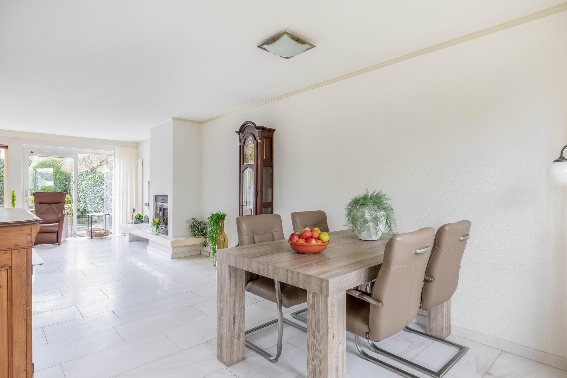 Zodra je binnenkomt valt direct de lichte en ruime opzet van de woonkamer op. Dankzij de grote raampartijen aan de achterzijde en de schuifpui naar de tuin stroomt het daglicht rijkelijk naar binnen. De zithoek is tuingericht en biedt een fijn uitzicht op het groen. Er is ook meer dan genoeg ruimte voor een royale eettafel. De indeling is praktisch en prettig: er is een duidelijke scheiding tussen zit- en eetgedeelte, zonder dat het zijn open karakter verliest. De open haard zorgt voor extra sfeer op de koudere dagen, terwijl je in de zomer juist de tuin eenvoudig bij de leefruimte betrekt.