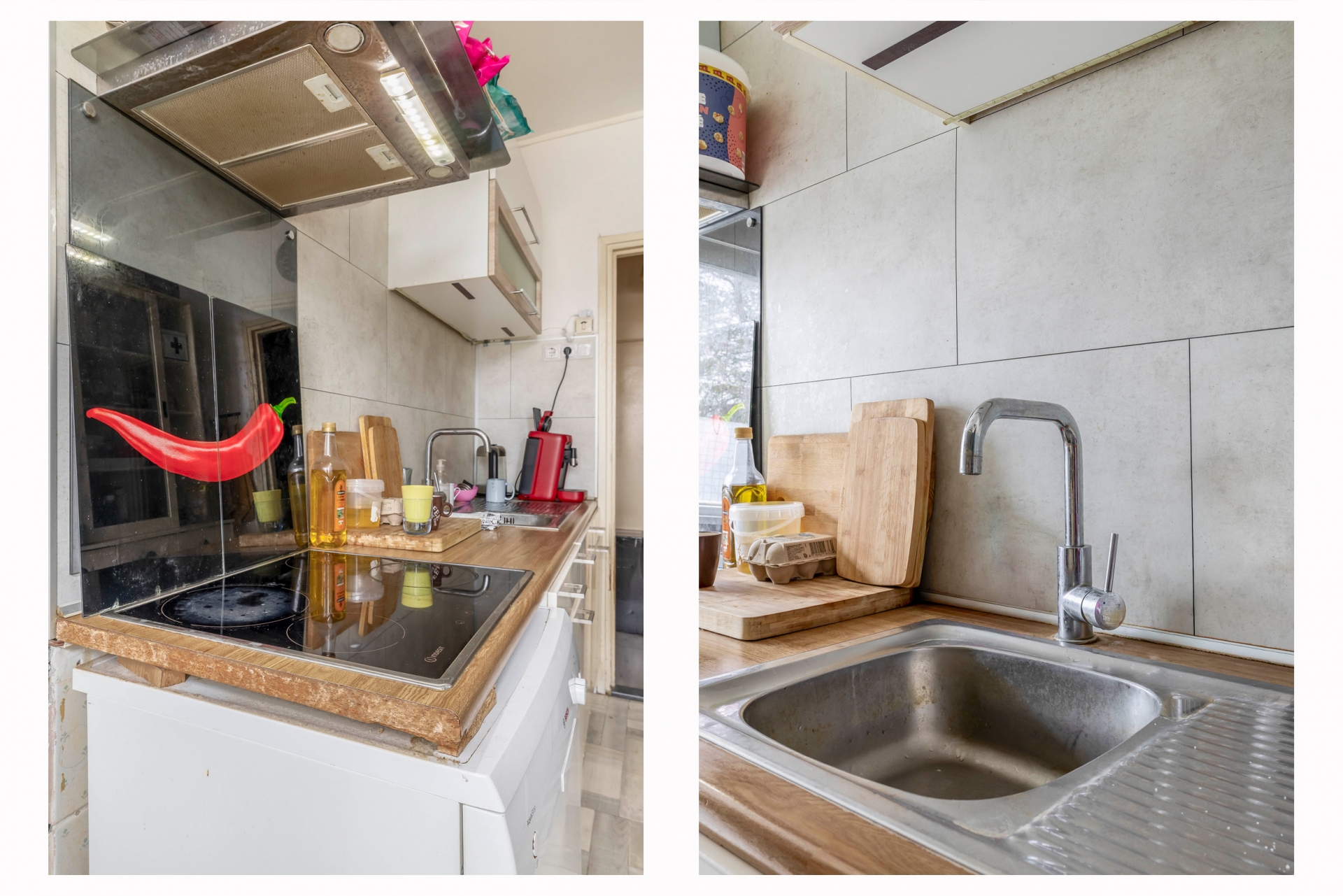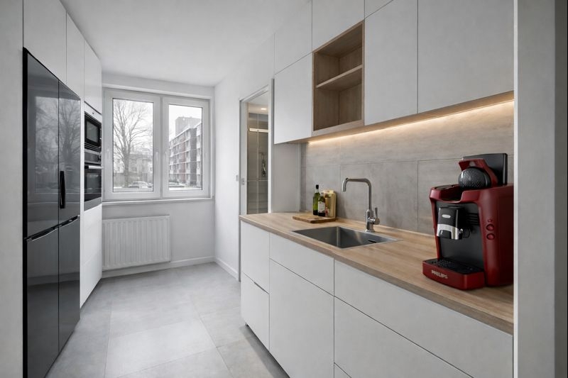 Bij binnenkomst stap je de hal binnen van waaruit je toegang hebt tot alle vertrekken. De woonkamer is knus maar licht, met grote raampartijen die zorgen voor een prettige sfeer. Er is genoeg plek voor een zit- en eethoek en via de kleine slaapkamer bereik je het balkon – gelegen op het westen. Ideaal voor een avondzonnetje na je werk. De aparte keuken heeft een rechte opstelling met voldoende werkruimte, en biedt tevens toegang tot de badkamer. Het toilet is apart gesitueerd, wat extra comfort biedt. De keuken is netjes en functioneel ingericht, met een lichte kleurstelling en praktische indeling.