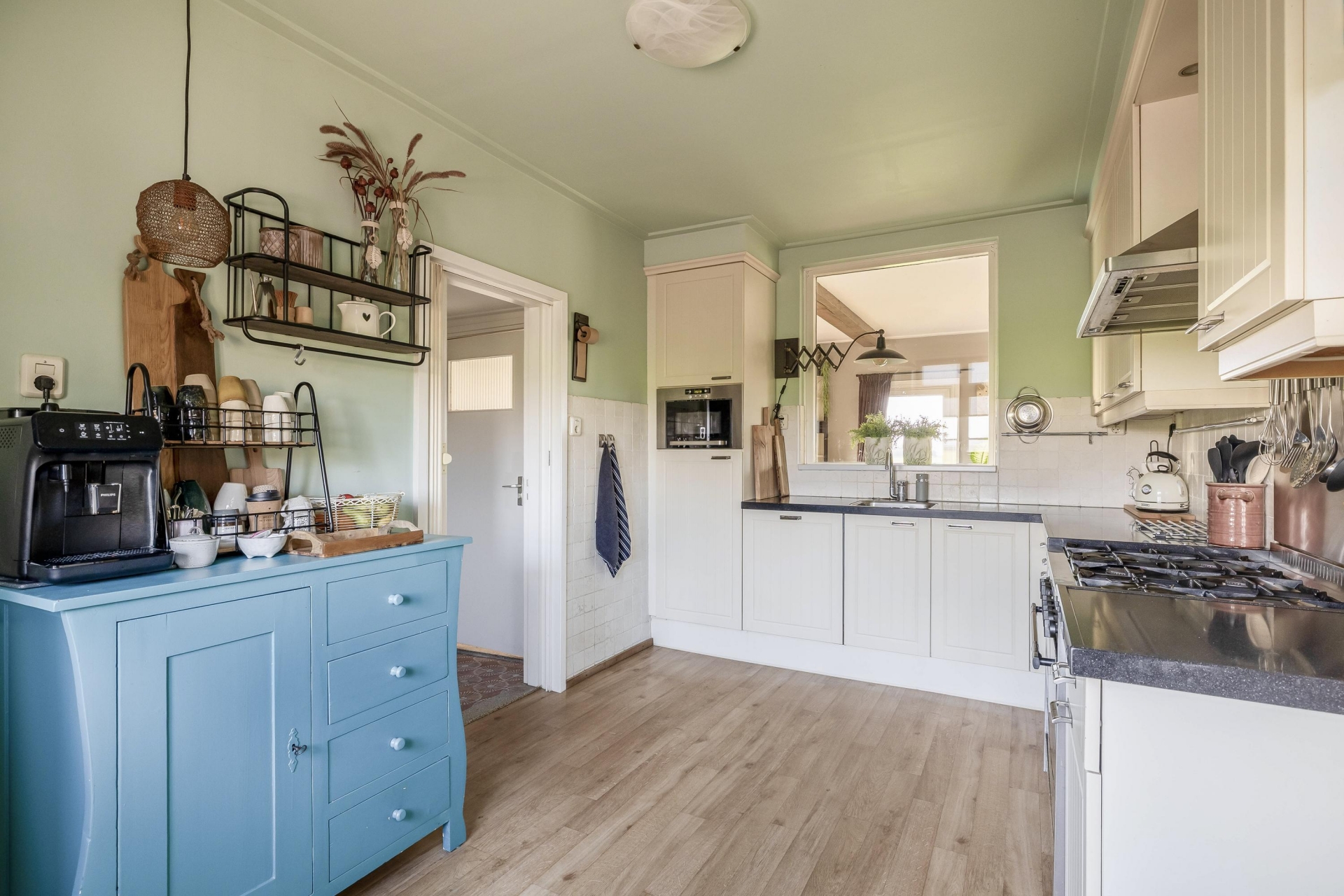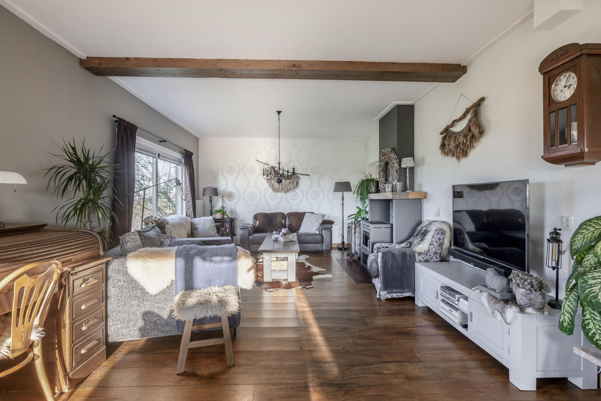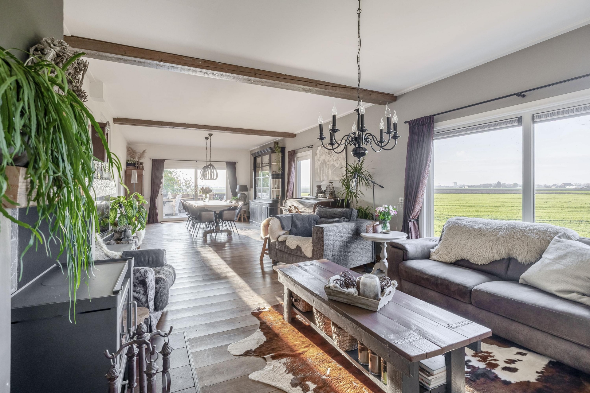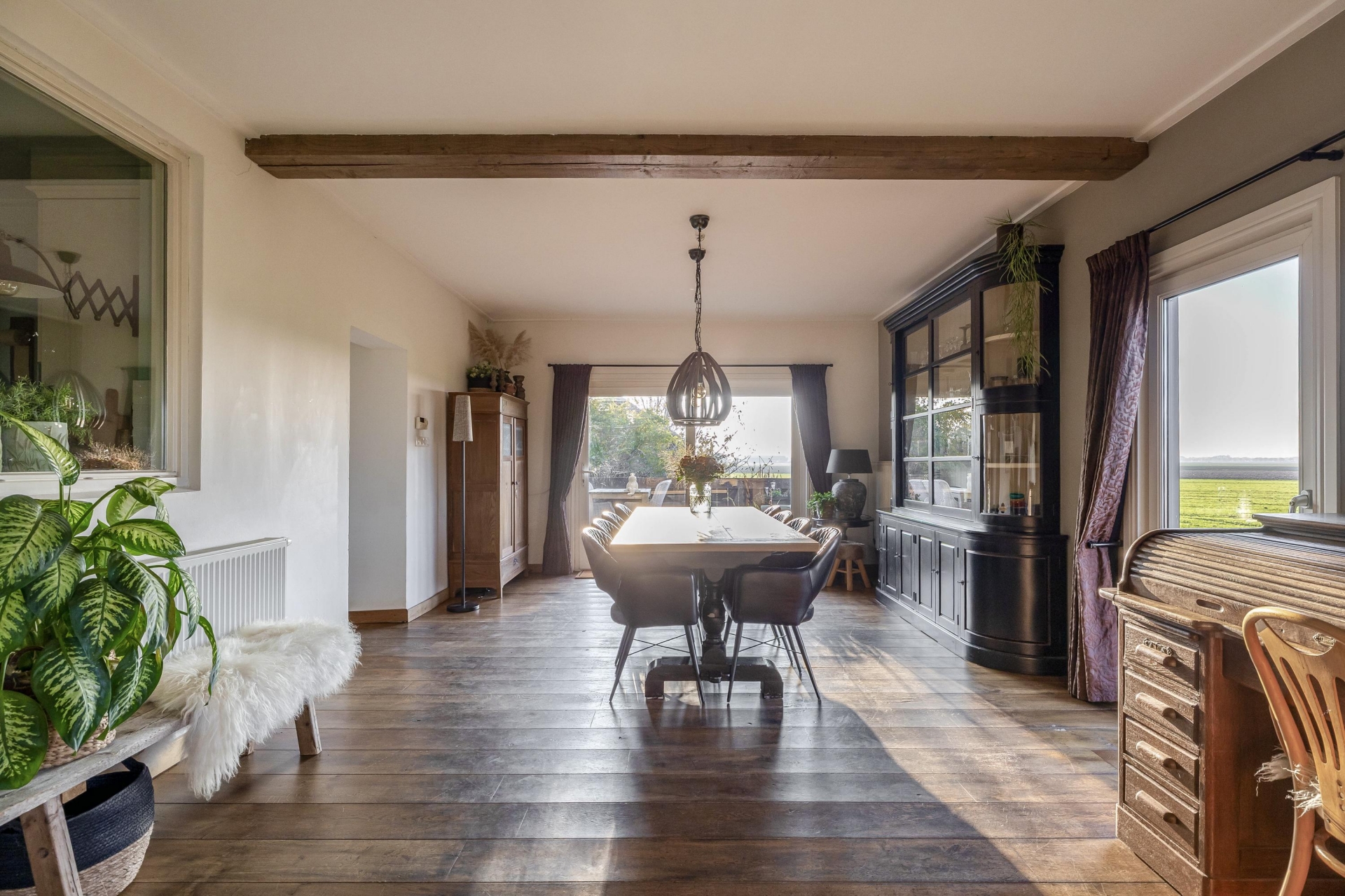 Bij binnenkomst valt direct de warme sfeer op. De gezellige woonkamer is voorzien van houten vloeren, een houtkachel en grote ramen die uitkijken over de landerijen. Aan de achterzijde is de woonkamer uitgebouwd; deze uitbreiding is direct op fundering geplaatst met oog op een toekomstige opbouw, waardoor er in de toekomst eenvoudig extra woonruimte op de verdieping kan worden gerealiseerd. Aan de rechterzijde vind je een royale zithoek, terwijl links ruimte is voor een grote eettafel met toegang tot de veranda. De afgesloten keuken heeft een landelijke uitstraling, veel opbergruimte en een groot fornuis met oven. Aangrenzend bevindt zich de praktische bijkeuken met ruimte voor wasmachine, voorraad en extra bergruimte. Daarnaast zijn er een aparte entreehal en toiletruimte aanwezig. Op de begane grond ligt tevens een ruime slaapkamer, ideaal voor gelijkvloers wonen of als werk-/praktijkruimte. De eerste verdieping telt twee fijne slaapkamers met vaste kastruimte. De badkamer is ruim en licht, voorzien van een ligbad, aparte douche, wastafel en tweede toilet. Een bergvliering biedt extra opbergruimte.
