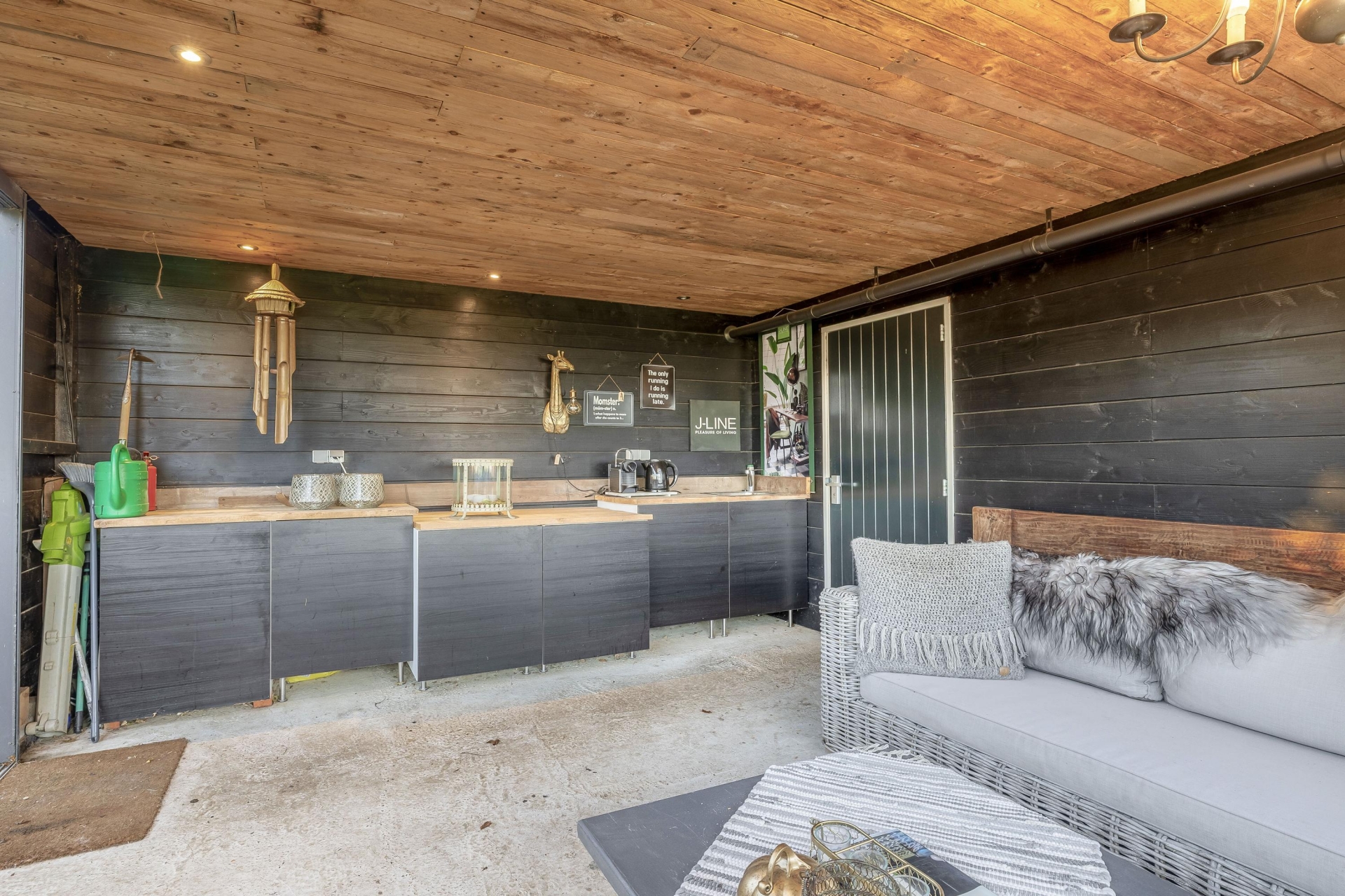De buitenruimte is een absoluut hoogtepunt. Met een perceel van circa 965 m² heb je volop ruimte voor tuinliefhebbers, speelgelegenheden of een zonnig terras. De zijtuin ligt op het zuidwesten, waardoor je de hele middag en avond van de zon kunt genieten. De veranda is een heerlijk beschutte plek waar je het hele jaar door buiten kunt zitten met vrij uitzicht over de velden. In het eerste deel van de tuin bevinden zich twee tuinhuizen met daartussen een ruime bijgebouw. Het bijgebouw is volledig voorzien van eigen stroom en wordt momenteel gebruikt als showroom. Deze ruimte is hiermee bijzonder geschikt als atelier, praktijkruimte, kantoor aan huis of hobbyruimte. Dankzij de slimme indeling van het perceel ervaar je zowel praktische functionaliteit als veel privacy.