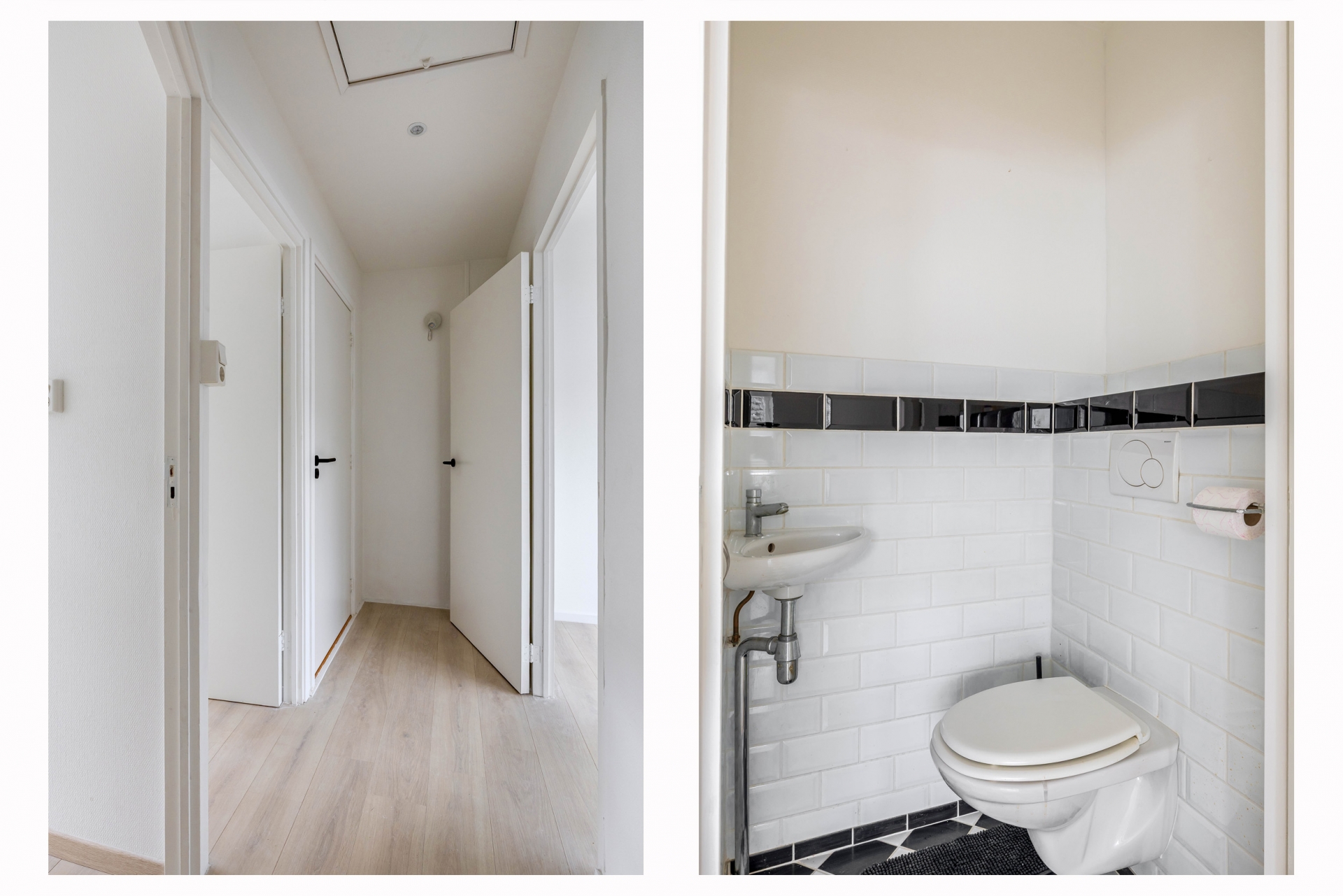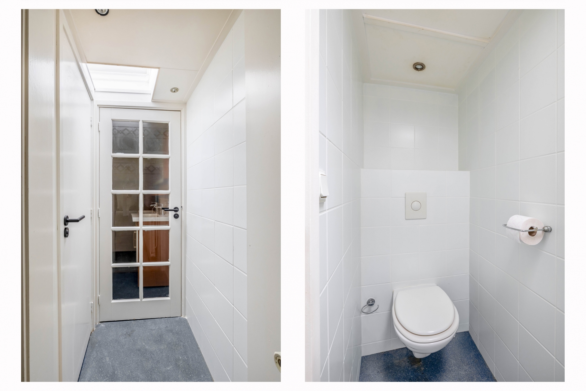 Op de overloop vind je een tweede, gedeeltelijk betegeld toilet. Daarnaast is er toegang tot de bergvliering, perfect voor het opbergen van seizoensspullen of koffers.