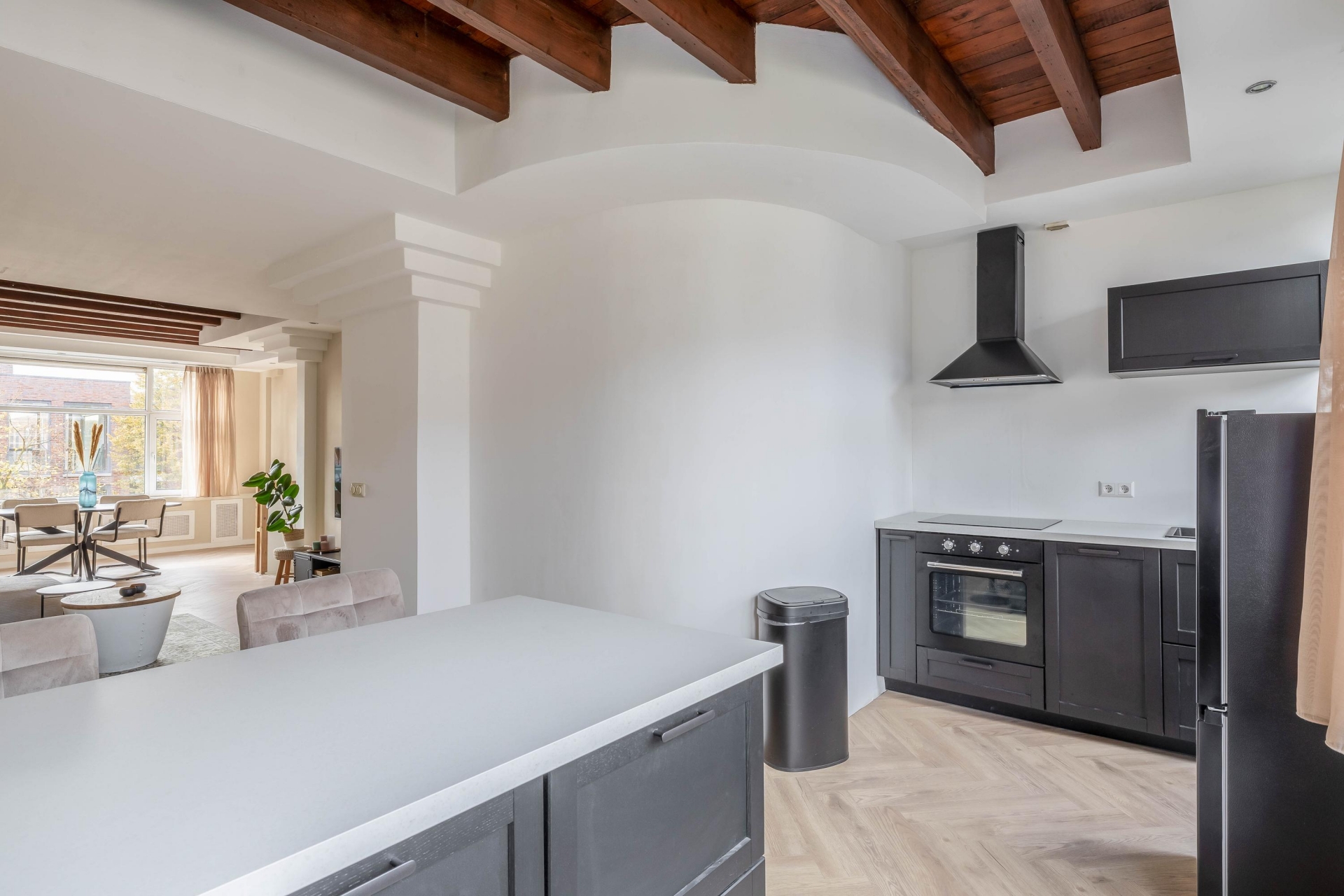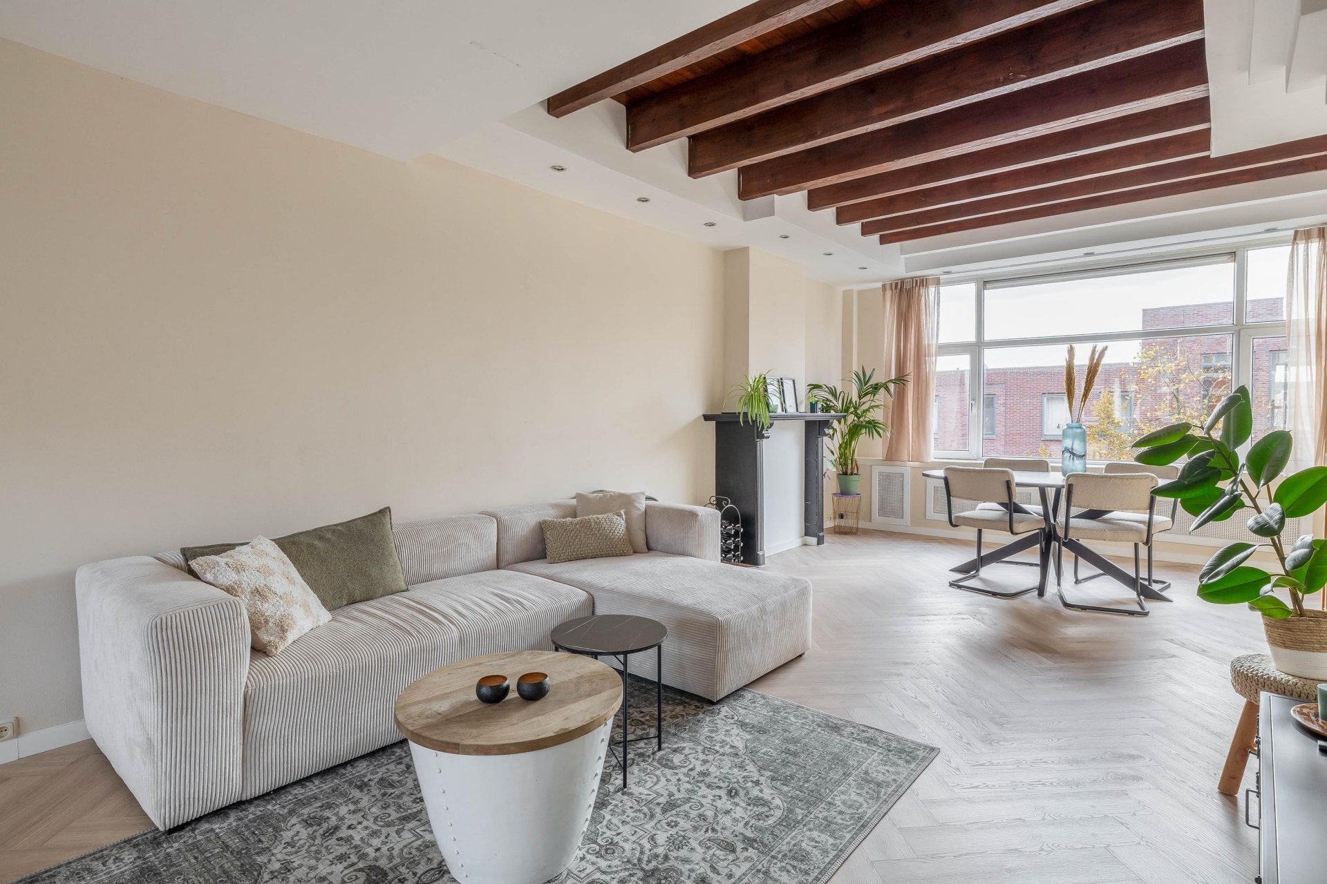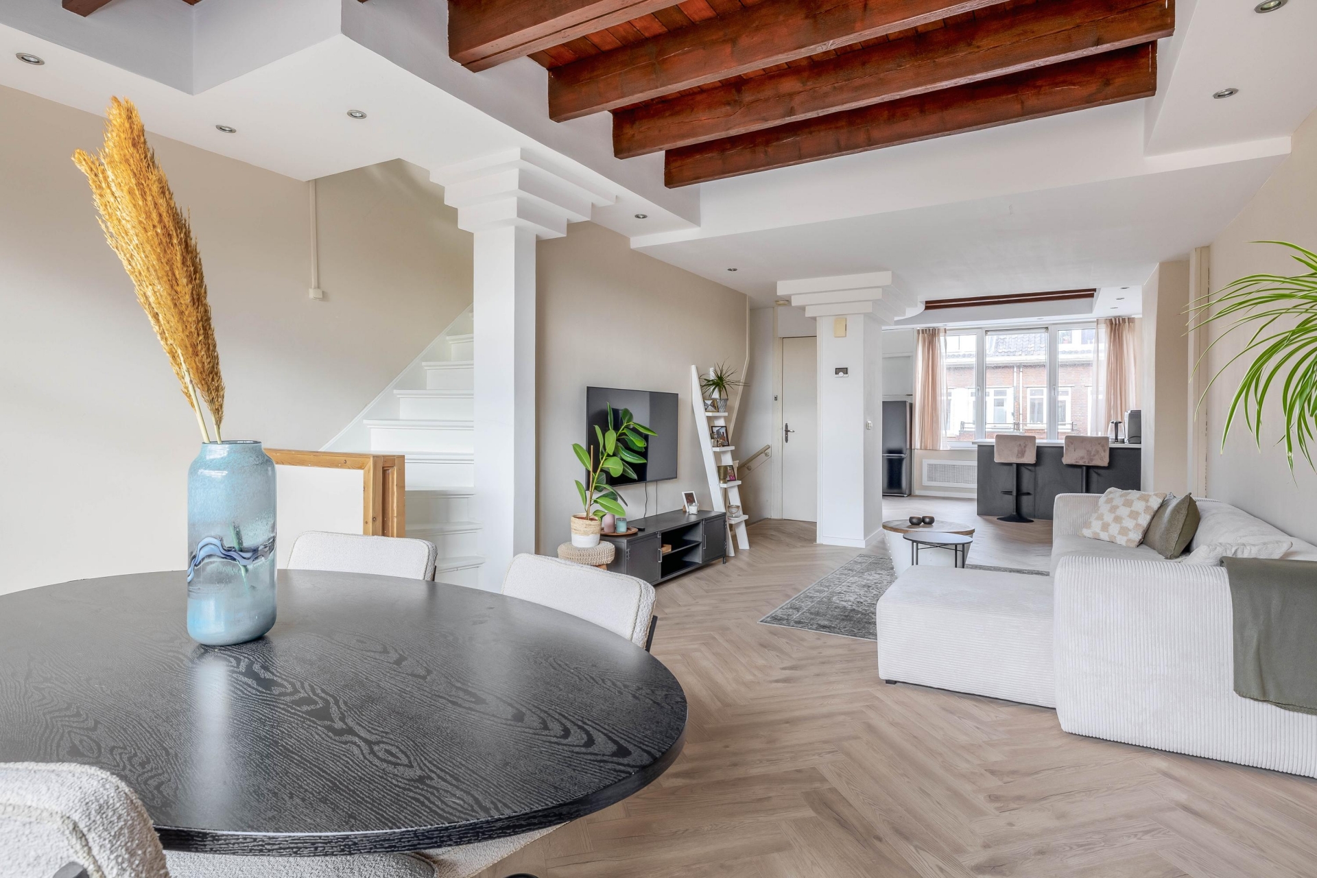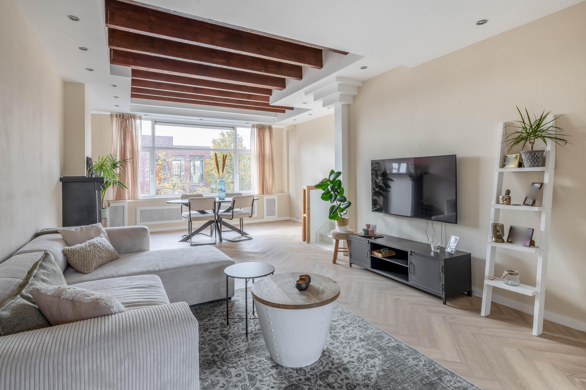 De woonkamer is een echte blikvanger: royaal van formaat, stijlvol afgewerkt en dankzij de grote raampartijen heerlijk licht. De klassieke balkenplafonds geven direct sfeer, terwijl de indeling ruimte biedt voor zowel een comfortabele zithoek als een gezellige eettafel. Door de ligging op een hoger woonniveau geniet je bovendien van een vrij uitzicht over de straat en de omliggende bebouwing. Hier ervaar je rust, terwijl je toch in een levendige stad woont.