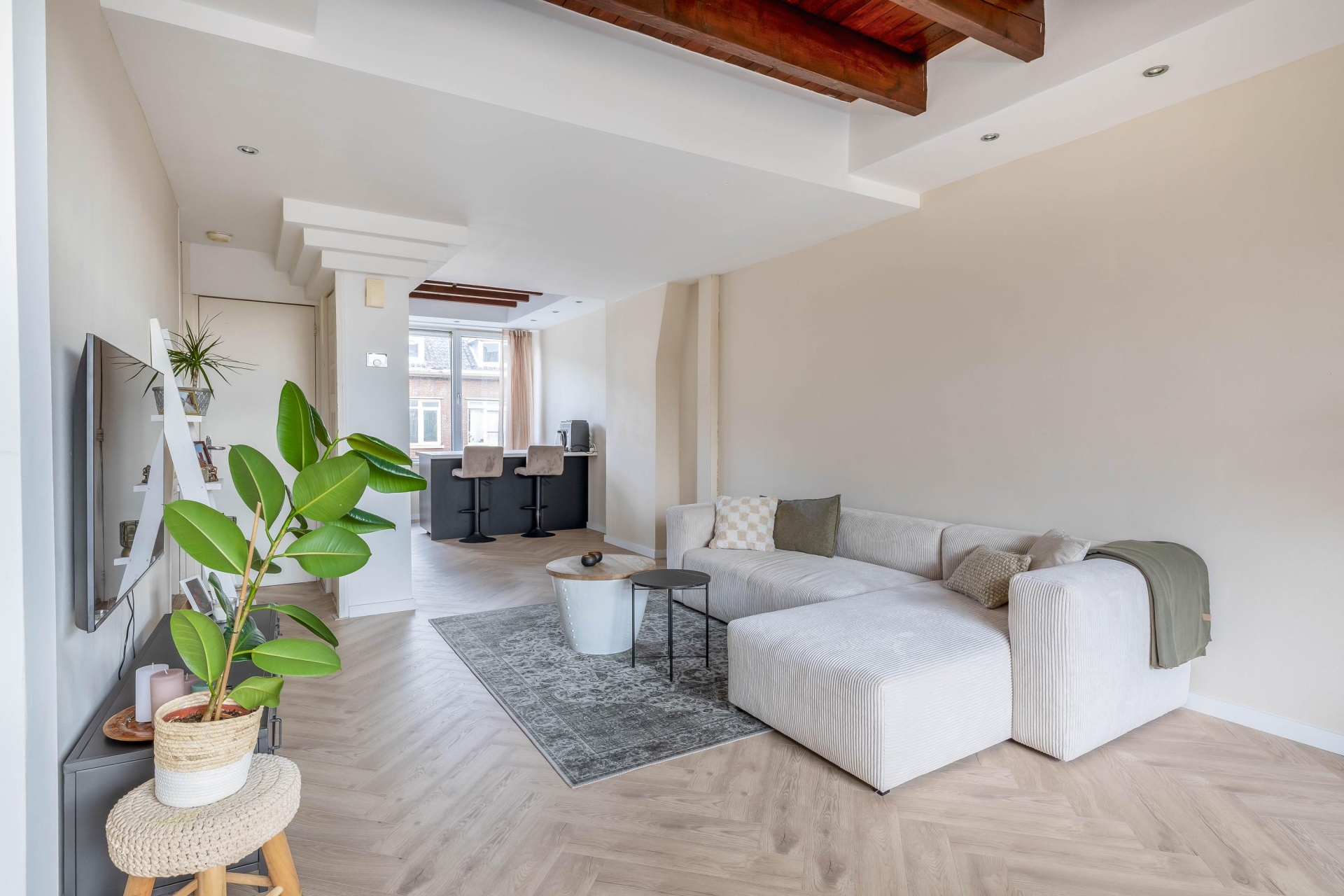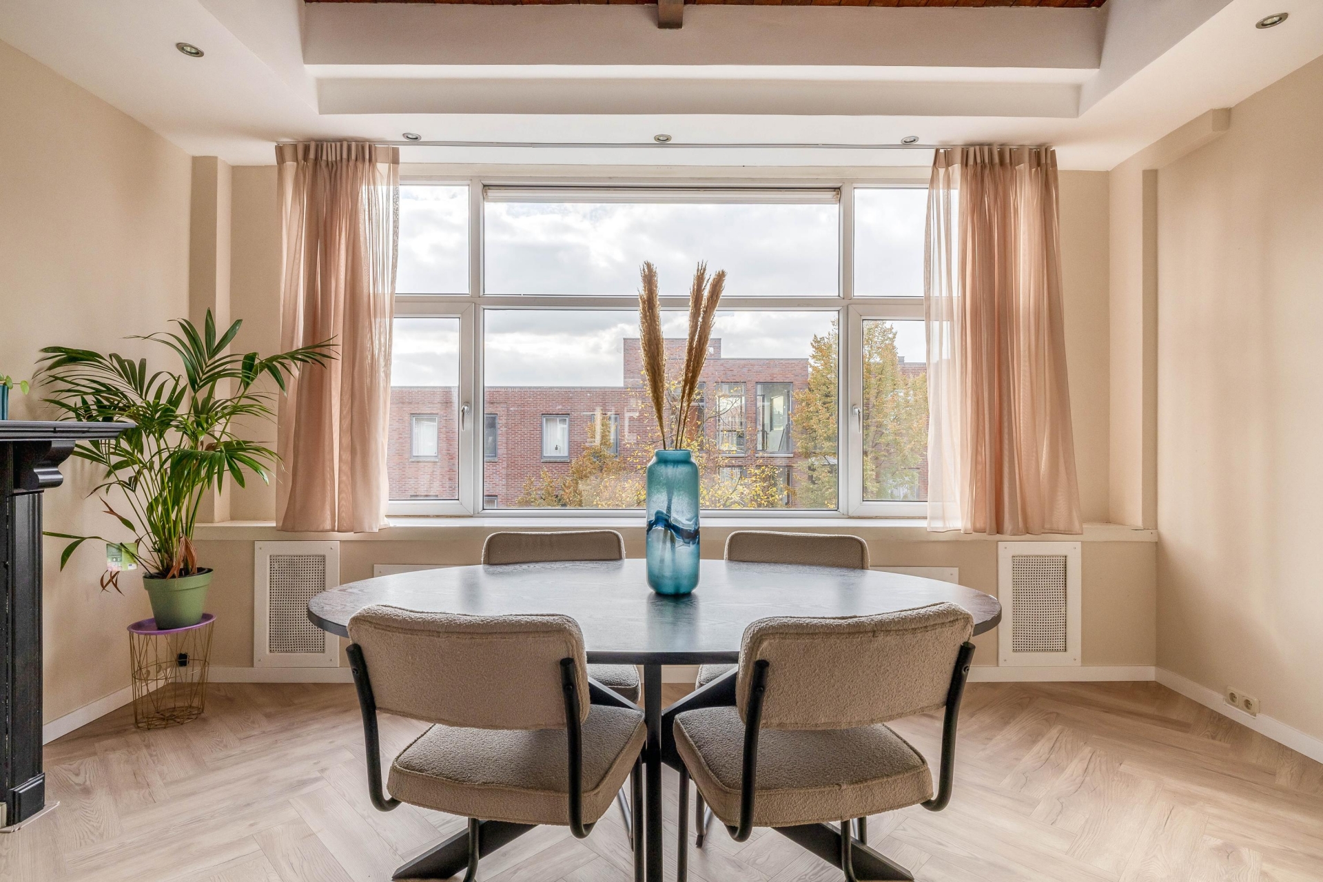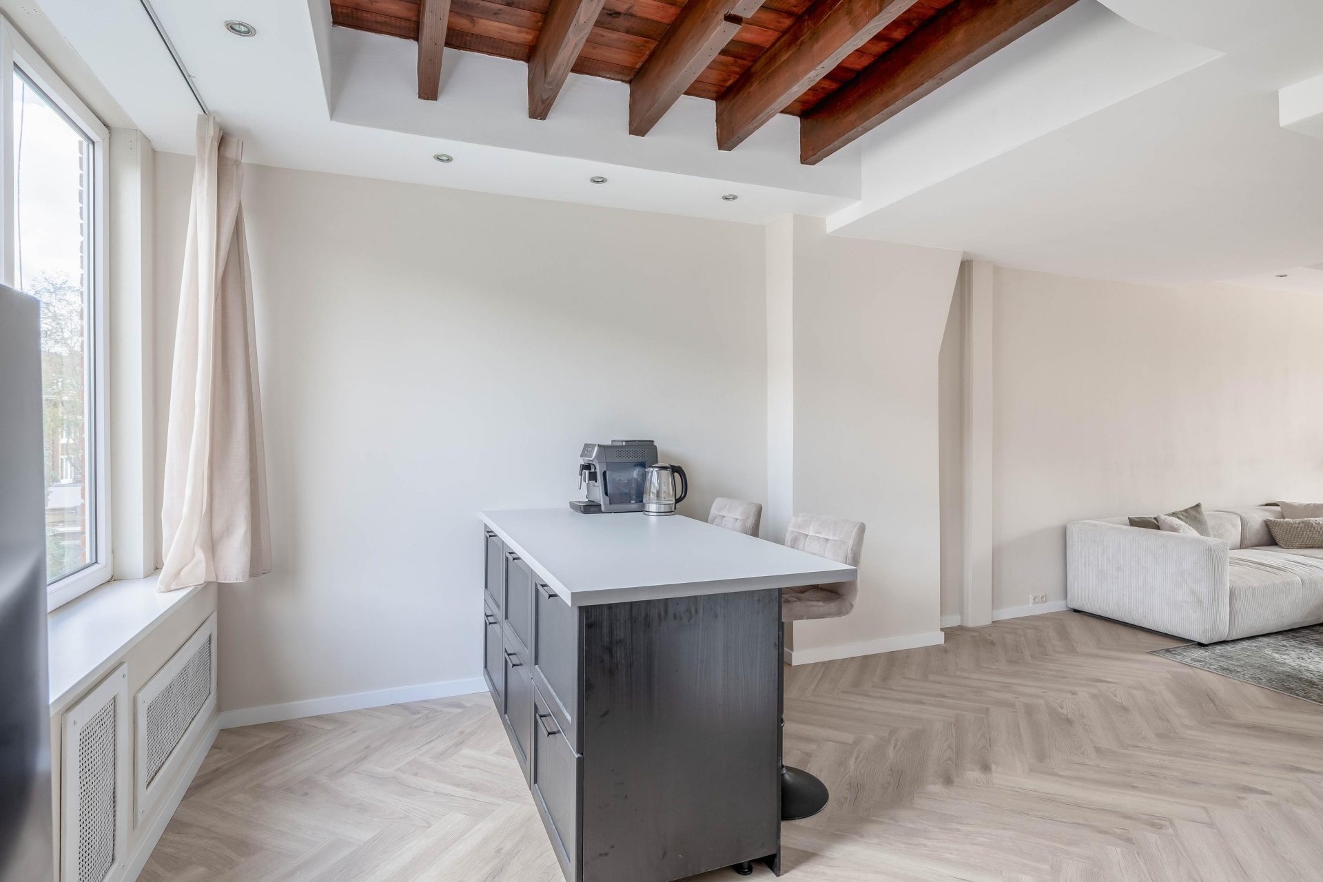 De woonkamer is een echte blikvanger: royaal van formaat, stijlvol afgewerkt en dankzij de grote raampartijen heerlijk licht. De klassieke balkenplafonds geven direct sfeer, terwijl de indeling ruimte biedt voor zowel een comfortabele zithoek als een gezellige eettafel. Door de ligging op een hoger woonniveau geniet je bovendien van een vrij uitzicht over de straat en de omliggende bebouwing. Hier ervaar je rust, terwijl je toch in een levendige stad woont.